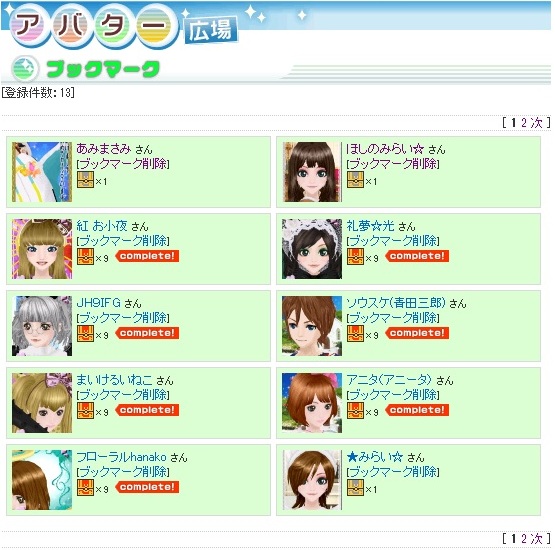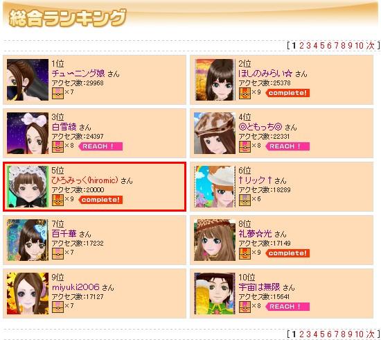 きょうのお昼過ぎ、3Dアバターショップのアバター広場で、アクセス数が20000になったのね。ひろみっく(hiromic) でアクセス数が20000に!トップ集団に仲間入り、と思いきや・・・トップを独走中の チュ~ニング娘 さんは、あしたにも30000に達しそうなのね。やっぱり、この差は大きいわね~。きょう、アバター広場を巡回していたら、わずか、あたり9個でコンプ達成、というのを見つけたのね。(きのう、おとついは巡回してないので、いつコンプ達成したかは判らないけど。。。)わずか9個のあたりでコンプ達成!!あたしが記憶してるかぎりでは、これが初じゃないかしら。烈火不死鳥さん、おめでとうございます!