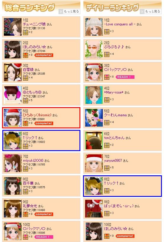 きょうの16時から1月の宝箱がスタートしたわ。先週の20日(火)に、アバター継続利用手続きをしたから、近々、楽天3DアバターサイトからCocoronサイトにデータがお引っ越しになるのね。(いつ、お引っ越しかは、まだ知らされてないけど・・・)たぶん、今回の宝箱が楽天3Dアバターでの最後の挑戦になる、と思うの。だから、今月も初日コンプ目指して、挑戦ね。(きょうは、会社の仕事納めで職場の宴会があったので、帰宅したのが16時過ぎだったの。・・・宝箱挑戦スタートは17時過ぎだったの。)左の赤(あたり)→真ん中の青(右の緑)→左の赤(あたり)→右の緑(真ん中の青)→右の緑(あたり)→左の赤(あたり)→左の赤(右の緑)→右の緑(左の赤)→真ん中の青(右の緑)→左の赤(真ん中の青)→左の赤(真ん中の青)→真ん中の青(右の緑)→右の緑(左の赤)→真ん中の青(右の緑)→左の赤(真ん中の青)→左の赤(ダブり)→右の緑(ダブり)→真ん中の青(あたり)→左の赤(真ん中の青)→右の緑(あたり)→左の赤(あたり)→真ん中の青(左の赤)→右の緑(ダブり)→真ん中の青(左の赤)→右の緑(左の赤)→真ん中の青(あたり)→真ん中の青(左の赤)→真ん中の青(左の赤)→真ん中の青(右の緑)→右の緑(真ん中の青)→左の赤(右の緑)→左の赤(ダブり)→真ん中の青(右の緑)→真ん中の青(右の緑)→左の赤(真ん中の青)→左の赤(真ん中の青)→右の緑(ダブり)→左の赤(真ん中の青)→真ん中の青(右の緑)→真ん中の青(右の緑)→真ん中の青(左の赤)→真ん中の青(左の赤)→右の緑(真ん中の青)→右の緑(左の赤)→真ん中の青(右の緑)→左の赤(右の緑)→左の赤(ダブり)→真ん中の青(ダブり)→右の緑(左の赤)→真ん中の青(右の緑)→真ん中の青(ダブり)→左の赤(真ん中の青)→右の緑(左の赤)→右の緑(真ん中の青)→右の緑(左の赤)→真ん中の青(ダブり)→真ん中の青(左の赤)→左の赤(右の緑)→左の赤(真ん中の青)→真ん中の青(左の赤)→左の赤(ダブり)→右の緑(真ん中の青)→右の緑(左の赤)→真ん中の青(ダブり)→左の赤(右の緑)→真ん中の青(ダブり)→左の赤(真ん中の青)→右の緑(左の赤)→右の緑(ダブり)→左の赤(ダブり)→真ん中の青(右の緑)→真ん中の青(左の赤)→右の緑(あたり)「1回目はゼッタイ当たる!!」伝説は今月も健在ね。だけど、右シフトだったのに、同じ色が連続して、逆向きのシフトに『革命』が起こったり・・・A→B→A→Bのパターンが来た時と、A→B→A→Cのパターンだった時とあって、どちらなのか迷ってしまい、結局、ハズレたり・・・で、連続ハズレのオンパレードだったのね。26回目で8アイテム目『【TC Item】背景(ガーネット)』を引いて、リーチ。その後は、あたり箱を引いてもダブり・・・が11連続。9アイテム目は『【TC Item】誕生石ブレス(ガーネット)』と思いこんでたのね。(『【TC Item】誕生石ピアス(ガーネット)』を引いてたので、ペアのブレスもあるんあろう、って思ってたわけね。)だけど、9アイテム目を引き当ててみて、ビックリ!!・・・お正月シリーズのフレーム『【TC Item】新年のご挨拶』だったのね。通算で716勝1165敗(2009年4月:11勝4敗、5月:13勝9敗、6月:8勝17敗、7月:18勝18敗、8月:21勝17敗、9月:18勝14敗、10月:15勝13敗、11月:20勝20敗、12月:24勝50敗、2010年1月:13勝9敗、2月:33勝66敗、3月:12勝15敗、4月:18勝27敗、5月:17勝37敗、6月:36勝63敗、7月:16勝22敗、8月:16勝21敗、9月:12勝11敗、10月:17勝20敗、11月:20勝44敗、12月:58勝118敗、2011年1月:11勝10敗、2月:13勝13敗、3月:30勝60敗、4月:24勝45敗、5月:29勝67敗、6月:44勝88敗、7月:18勝24敗、8月:23勝47敗、9月:19勝35敗、10月:32勝60敗、11月:22勝42敗、12月:12勝9敗、2012年1月:23勝50敗)これで、2009年9月から29ヶ月連続のコンプ達成なのね。★。.:*:.。+・'゜+・.。☆。.:*:.。+・'゜+・.。★。.:*:.。+・'゜+・.。☆。.:*:.。+・'゜+・.。★2011年12月29日の宝箱 [結果]×4【TC Item】辰×2【TC Item】ルームパンツ(ブラウン)×2【TC Item】ルームパーカー(ブラウン)×1【TC Item】誕生石ピアス(ガーネット)×1【TC Item】新年のご挨拶×4【TC Item】Happy New Year×4【TC Item】スターネックレス(ガーネット)×3【TC Item】ソックス(レッド)×2【TC Item】背景(ガーネット)1月の宝箱 コンプリートアイテム ゲット(2011年12月29日 18:46)1月宝箱コンプアイテム(ゴールド)http://my.plaza.rakuten.co.jp/?func=avatar&act=main★。.:*:.。+・'゜+・.。☆。.:*:.。+・'゜+・.。★。.:*:.。+・'゜+・.。☆。.:*:.。+・'゜+・.。★今月の宝箱は1月の誕生石「ガーネット」ね。今月も、11月や12月と同様、誕生石の色違いアイテムシリーズの一部のアイテムが、1月特別アイテムに入れ替わってるのね。・・・お正月向きフレームの3アイテムね。【TC Item】辰【TC Item】新年のご挨拶【TC Item】Happy New Yearそう言えば、2011年1月の宝箱も、お正月向きフレームが4つ含まれてたわね。あけましておめでとう謹賀新年兎A HAPPY NEW YEAR! 初日コンプ常連さんの結果です。●JH9IFG さん (106回挑戦、アタリ36回で達成)●ほしのみらい☆ さん (110回挑戦、アタリ41回で達成)●ソウスケ(青田三郎) さん (58回挑戦、アタリ22回で達成)●アニータ(アニタ)さん