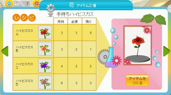 花アルバムの揃い状況をまとめると、以下のとおりね。 アサガオ(Lv:0)済 未チューリップ(Lv:1)済済済済カーネーション(Lv:2)済済ガーベラ(Lv:3)済済クローバー(Lv:4)済済ヒマワリ(Lv:5)済済ハイビスカス(Lv:6)済済Wストロベリー(Lv:7)済済コスモス(Lv:8)済済パンジー(Lv:9)済挑戦中ポインセチア(Lv:10)済挑戦中胡蝶蘭(Lv:11)挑戦中 未アネモネ(Lv:12) 挑戦中 未梅(Lv:13) 未 未スズラン(Lv:14) 未 未クロッカス(Lv:15) 未 未ハナミズキ(Lv:16)(???) 未 未デージー(Lv:17)(???) 未 未サクラ(Lv:18)(???) 未 未ワスレナグサ(Lv:19)(???) 未 未フリージア(Lv:20)(???) 未 未