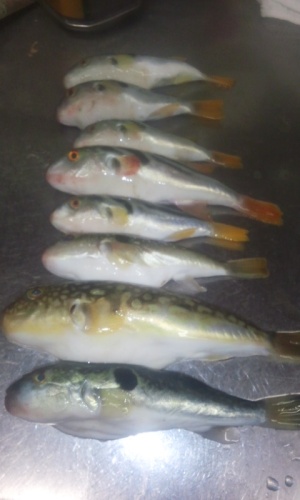 今月の 休業予定ですが定休日 水曜日8日 お昼 漁師の共同作業11日 お昼 漁師の釣り堀大会30日 家の法事の為 お休み します。海の事は 天候等により変更が ありますのでなるべく ご予約 しての ご来店 お願い します。0869-72-3719(営業時間内に お願い します。) フグが あがりだしました。尾っぽの 黒っぽいのがトラフグの 可能性が あります。 小フグの ぺすかとーれもちろん 地魚なので地魚 料理これは おすすめです。他店では 無い食べ方です。あなご おおだこ くるまえび毎日 おすすめの お魚が 待っています。ご予約 承り ます。