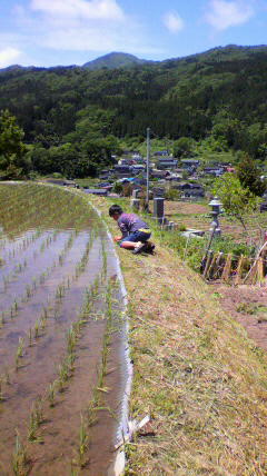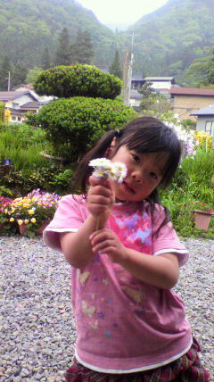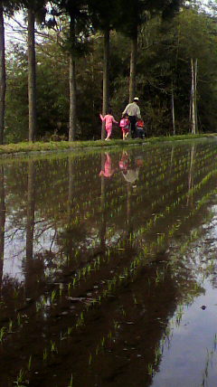 先日、我が家の田植えが、やっと終わりました~ 今年は、天候が悪かったせいか、苗がイマイチだったようですが・・・ 秋には おいしいお米が食べれますように 今年は、次男さんが、手伝いに来てくれていたので、私は、次男さんちの子守を仰せつかりました たんぼに、おやつを持って行ったとき、まゆまゆが、あぜ道を歩きたがり 子供達みんなで 『あるこ~ あるこ~ 私は元気~』 と、トトロの歌を歌いながら 行進していました(^^;) 田んぼにはまってもいいわ~なんて思いつつ、見ている方は ヒヤヒヤもんでした 秋には、みんなで、稲刈りしようね~