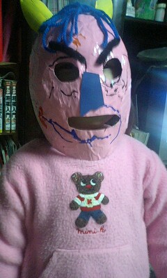 今日は節分でしたね~。 ちゃんと、豆まきをして、巻き寿司もたべて・・・ まゆまゆ家も、無事、鬼が逃げていったかしら ところで、みなさんちは、どんな、豆まきをしていますか?? 今年は、まゆまゆが、保育所から、鬼の面を作ってきてくれたので、 それをかぶって、豆まきをしよう~♪ と、息子達と、盛り上がっていた私と、息子達。 すると、それを聞いていた まゆまゆが、急に 大号泣 なぜかきくと・・・ 鬼さん怖い~ って。 そして、鬼の面を、どこかへ、隠してしまいました~ 自分で作った鬼の面だのにな~ また、見つけたら、こそっとします でも、所詮、3歳児の作品(^^;) ピンクのお顔で、かわいいぐらいで、 ちぃーーーっとも 怖くないんですけどね