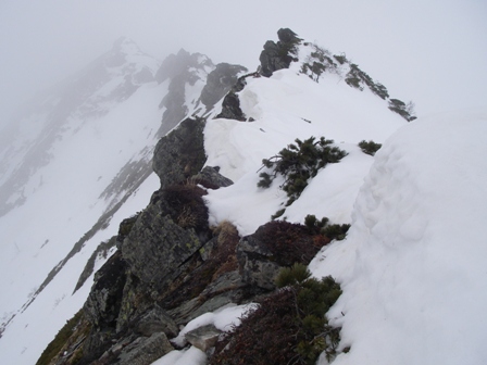 しかし、雪に隠れて確認できない急峻だが、ヘズリながら進む…しかし、今回は無理と判断し B ・C へ引き返す、明日は下山だ … 続く…