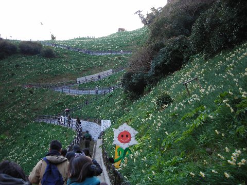 1月9日~11日までの三連休を利用して、冬の淡路島へ旅行に出掛けた。(その2)12日~14日まで旅行の疲れなのか風邪をひいて寝込んでいたので更新が遅くなってしまった。12日は珍しく38℃くらいの熱が出て仕事も休んだ。幸い熱は1日で終わったので新型インフルでは無かったのが幸いであった。淡路島南端の福良港方面の観望を終えて、次の目的地である灘黒岩水仙郷を目指す。この時期の淡路島では最も集客力のある観光ポイントとなっている。当然水仙も見頃を迎えていた。シーズンオフで閑散としている島内で唯一人が密集していたのがこの水仙郷であった。駐車場待ちの渋滞を20分ほど耐えてやっと車を停められた。目指す水仙畑はかなり急峻な傾斜地にへばりつくように存在していた。脚の悪い高齢者にはかなり大変と思えた。まわり一面の水仙で香りも漂い、とても美しい。園芸や植物には普段あまり興味が無いが、一面に咲き乱れる光景は素晴らしく素直に感動する。水仙郷の高台からは南淡町の離島である「沼島」も一望出来る。凪いでいる様に見える紀淡海峡の海も綺麗であった。サミットに近いところから海側を見下ろす。かなり急な傾斜地に水仙が咲き誇っている様子が判るかと思う。水仙のアップ画像。ピントがいまひとつ。観光客の一部は高級そうなカメラを持った人も居た。狭いところに結構人が多いので腰を据えてゆっくり撮影が出来ない。温暖な淡路では早くも梅が咲いていた。厳冬期の長野県から来れば俄に信じがたい光景である。最後に水仙の案内掲示板。花の構造が図示されていた。灘黒岩水仙の観光が堪能出来たので、類似施設である立川水仙郷の観光は割愛して、次の目的地である旧帝國陸軍由良要塞遺構を目指す。(次回に続きます)