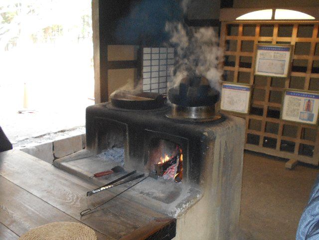 この家は珍しい事にかまどに日を入れての展示となっていた。貴重な文化財たる古民家であるので火を炊くことなど論外と思ったのだが、実際は逆で、煙でいぶすことで屋根や建物を保全しているとのこと。内部で火を使わないと屋根材は数年で葺き替えが必要なってしまうが、煙の効果で二十年程度は葺き替えが要らないとの説明であった。