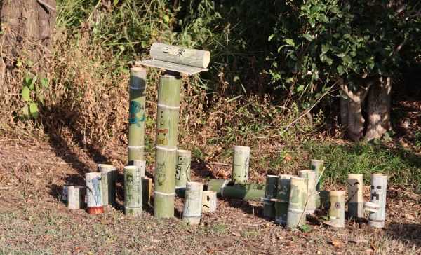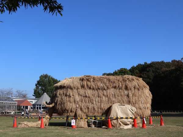 猛烈な風でした ナウマンゾウは吹き飛んでいないかしら それより 歩いて見に行く私がとびそう・・・ 強風を小さな画面で表現するのは 難しいです 木の葉は散り 地上の枯れ葉が吹き飛んでいるのですけど・・・ ナウマンゾウは大丈夫でした ゾウの裏側で 子供達にわら細工を教えていて 子供達も楽しそうでした 風が静かなら もっと良かったのですけど ゾウに向かって 槍が投げられたのが分かりますか? なかなか刺さらなくて もちろん 刃物ではありません 弓矢もありましたが これも刺さりませんでした それでいいのです 充分 楽しそうでした(^^) 11月3日 文化の日 「収穫祭」でした