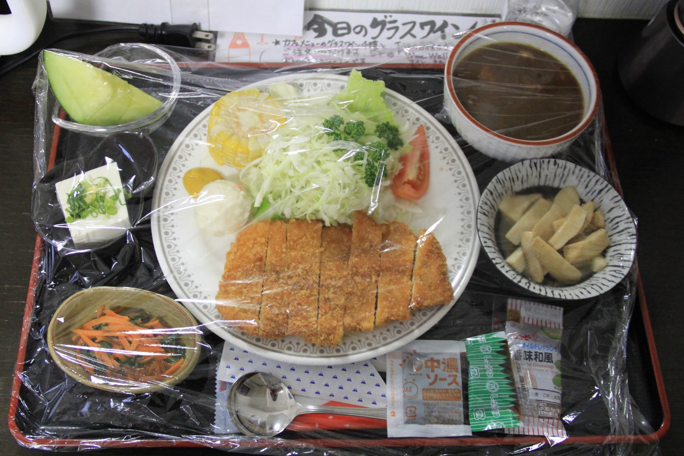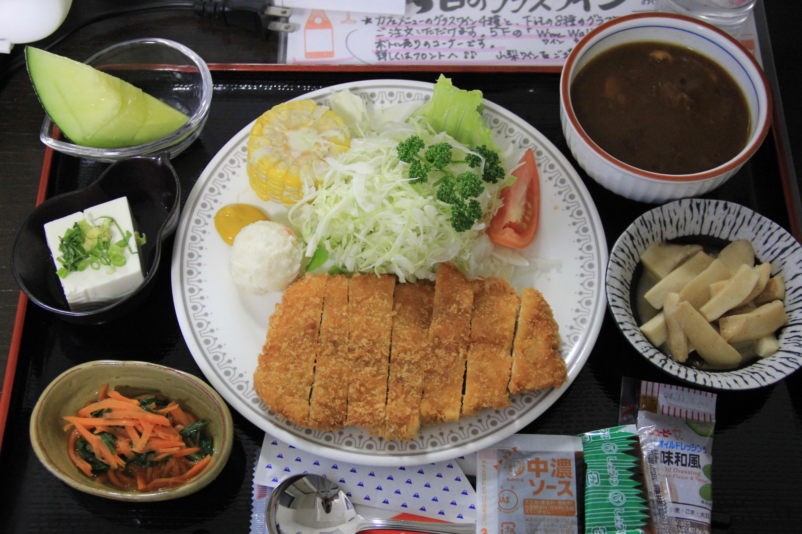 この日のメニューは豚カツ・カレー・エリンギバター・人参と春菊のナムル・冷奴などなど