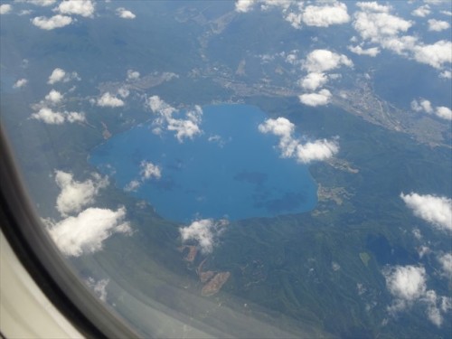窓の下に青く光る田沢湖の全景が。 田沢湖は、秋田県仙北市にある淡水湖。直径は約6kmの円形、最大深度は423.4mで、日本で最も深い湖であり、国内で19番目に広い湖沼。湖面標高は249mであるため、最深部の湖底は海面下174.4mということに。この深さゆえに、真冬でも湖面が凍り付くことはない。そして、深い湖水に差し込んだ太陽光は水深に応じて湖水を明るい翡翠色から濃い藍色にまで彩るといわれており、そのためか日本のバイカル湖と呼ばれていると。玉川ダムは放流中。一級河川・雄物川水系玉川に建設されたダム。白き水の落下が確認できた。湖の名は宝仙湖 上が玉川ダム湖を横断する橋が男神橋。下が宝仙湖の北西部の国道341号の湯渕橋。秋田焼山には残雪が。青森県黒石市にある大穴ダム。二庄内ダム。水田の中に突然巨大タンク群が。1基は建設中。青森市 野沢配水池。直径約44m、高さ約12m、貯水量10000m3。配水池は、給水区域の需要量に応じて適切な配水を行うために、水道水を一時貯えるタンク。八甲田山。青森県中央部にある火山群。海抜1584メートルの大岳を中心とする北群と海抜1516メートルの櫛ヶ峰を中心とする南群とから成る。青森湾に出る。眼下には下水処理場の八重田浄化センターが。 飛行機は青森湾上で旋回し青森空港を目指す。右手には津軽半島が。 合浦海水浴場と合浦公園が中央下に。 青森県観光物産館アスパムの三角形の建物が。 「AOMORI」の「A」をイメージした正三角形の建物であることは以前同僚から。地上15階、高さが76mある青森の情報基地。そして青森空港へ無事着陸し駐機場へ。 青森空港ターミナルビル。 レンタカーで五所川原に向かう。岩木山にもまだ残雪が。 見る場所で山頂の姿が微妙に変わって行く岩木山。標高は1,625 mで、青森県の最高峰。日本百名山および新日本百名山に選定されている。その山容から津軽富士とも呼ばれるほか、しばしば「お」をつけて「お岩木(山)」あるいは「お岩木様」とも呼ばれている。 150年程は静かにしている火山ではあるが・・・・・・。