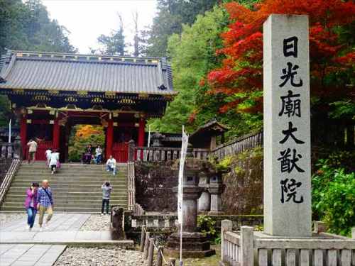 二荒山神社を後にし、大猷院(たいゆういん)に向かう。大猷院とは徳川三代将軍「家光公」の廟所(びょうしょ)(墓所)で、境内には世界遺産に登録された22件の国宝、重要文化財が建っており、315基の灯籠(とうろう)も印象的。祖父である「家康公」(東照宮)を凌いではならないという遺言により、金と黒を使用し重厚で落ち着いた造りになっていると。参道のモミジも紅葉の真っ盛り。仁王門。三代将軍徳川家光公が眠る廟所「奥の院」へは、石段を登るごとに次々と現れる特徴ある6つの門をたどり導かれるのであった。初めにくぐるこの「仁王門」の左右には「金剛力士像」がまつられていた。阿形像。吽形像。仁王門前。仁王門を内側から。水盤舎。手洗い所も豪華そのもの。ここまで色彩豊かなそして色あざやかな手水所はお目にかかったことがないほど。天井には、狩野安信が描いた「雲龍図」があるのであったが・・・・・。よく見ればなるほど龍らしき姿が。二天門も修復工事中。「大猷院」の扁額は後水尾天皇の筆であると。持国天と広目天が表を、裏には風神と雷神が守護しているのだと。そう言えば輪王寺の本堂の正面に風神と雷神が安置されていたことを想い出す。工事中のため、輪王寺本堂に疎開中?展望所。展望所から下を見ると、石灯籠がたくさん並んでいた。当時の大名からの献上品。ここからの眺めは、天上界から下界(人の住む世界)を見下した風景を想像させると。夜叉門。装飾がすべてボタンの花で統一されていることから別名「牡丹門」 と呼ばれ、全体が黒漆と金を基調に華麗な仕上がりとなっていた。東照宮の陽明門にあたるのが夜叉門。門の表と裏には東西南北を表す色の4体の夜叉像が祀られていた。南の赤色、毘陀羅 びだら。 北の緑色、 阿跋摩羅 あばつまら。 東の青色、烏摩勤伽 うまろきゃ。 西の白色、鍵陀羅 けんだら。 夜叉門を潜り拝殿の前、大猷院の中心に位置するのがこの唐門。唐破風を持つ、小規模な門だが、隅々まで繊細な彫刻と金、白を基調とした彩色が施されており、その意匠装飾は大変気品のあるもの。柱や貫・梁には七宝・麻の葉などの細かい地模様が彫られ、扉には上に鳳凰、下に唐草、前後の破風の下には雄雌の双鶴と白竜などの彫刻で余すところ無く、美しく装飾。両側の袖塀の羽目には多くの鳩が彫られ、百間百態の群鳩とされている。この建物を「廟(びょう)」といい、参り墓を意味し、一般の方々の正式な参拝所。。金・黒、赤の彩色をくまなく施された外観は、別名「金閣殿」の呼び名があるほど豪華で、江戸芸術の極み。拝殿に向かって進む。大猷院の中心伽藍で、拝殿・相の間(あいのま)・本殿から構成されている。拝殿に続く本殿の最奥部、「厨子(御宮殿/ごくうでん)の中には、「家光公座像」と「御位牌」が、又その前後には、家光公の本地「釈迦如来」(非公開)が奉安。非公開とされてきた秘蔵の「徳川家康公の御位牌」がこの度徳川家康の四百回忌に合わせ、初公開されていた。家康公の戒名は【東照大権現安国院殿徳蓮社崇誉道和大居士】。(とうしょうだいごんげん あんこくいんでん とくれんしゃすうよ とうわだいこじ)パンフレットより掲載。江戸城、二条城、名古屋城などの障壁画も描いている狩野探幽筆の大羽目の唐獅子図。同じくパンフレットより転載。御朱印を頂きました。皇嘉門。本殿の後ろ、大猷院の最も奥に位置する家光公の御廟へは、この「皇嘉門」から。中国、明朝の建築様式を取り入れたその形から、一名「竜宮門」とも呼ばれてる美しい建物。腰壁を密陀塗という特殊な技法で白色に塗装するなど、構造、意匠、技巧に優れた技術が。鐘楼。始まったばかりの紅葉を楽しみながら階段を再び下り帰路へ。