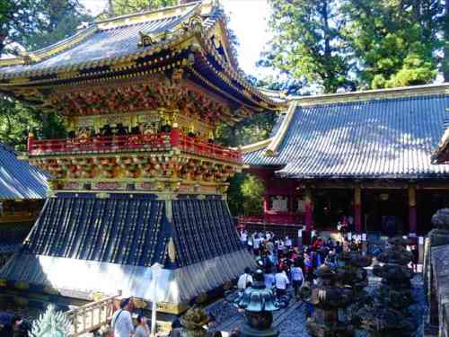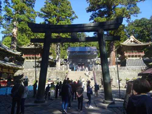 石の鳥居越しに陽明門そして右に鐘楼、左に鼓楼が見えて来た。 御水舎。向かって右側が 鐘楼。鐘楼 には「鶴・龍・飛竜・麒麟」などの彫刻が合計78か所あると。左側は鼓楼。「亀・龍・雲」などの彫刻が38か所。 「鶴は千年、亀は万年」といわれて、一対のおめでたい生き物とされています。数の上でも 鐘楼 の方がちょっとだけ豪華なつくりになっていると。 陽明門は工事の真っ最中で白いテントに覆われていた。輪王寺と同じく、実物大の写真が欲しかったのであったが。国宝・陽明門の工期が当初予定より2年短縮され、平成28年3月までに完了すると。 日光東照宮を訪れると様々な建物に多様な動物を見ることができる。これらの動物のほとんどは平和を象徴するものとして描かれている。奥社入口を護る「眠り猫」は、前足をしっかりと踏ん張っている事から、実は徳川家康を護るために寝ていると見せ掛け、いつでも飛びかかれる姿勢をしているともいわれている。ここが家康が眠る奥宮への参道入り口。眠り猫(ねむりねこ)【国宝】 。左甚五郎作と伝えられている。牡丹の花に囲まれ日の光を浴び、うたたねをしているところから「日光」に因んで彫られたとも言われていると。知名度が高いわりには小サイズ。案内札がなければ通り過ぎてしまうほどの小さな彫刻。 猫の彫刻は、東照宮以外の神社・寺院にも見られるが、ほとんどは獲物を狙って殺気をみなぎらせているが寝ているのはここ東照宮だけとのこと。おでこの茶色のものは何、絆創膏?? 眠り猫の彫刻の裏側には、竹林に遊ぶ2羽の雀の彫刻が。東照宮の彫刻は虎や霊獣など、それぞれ重要な位置に、特別の意味をもって配置されていると。猫が寝ているから雀は楽しく暮らせる事を表現していると。これは戦乱が治まり、平和な時代が訪れたことを意味しているのではと。御朱印をいただきました。唐門(国宝)とその奥の本社(国宝)。唐門の屋根の上には昼を守る霊獣の竜と夜と守る霊獣の恙(つつが:唐獅子の一種)が。恙の足元をよく見ると、その4本の足には金の嵌め輪が嵌められている。恙が虎よりも凶暴な生き物で、足を抑えておく必要があったそうだ。恙ない(つつがない)、恙なく(つつがなく)→息災に…の語源ともなる、恙と云う名の霊獣はココ唐門の上で見ることが出来るのであった。また屋根の上には工事用足場パイプが。唐門正面。間口3m、奥行き2m。 東照宮で最も重要な本社の正門で、江戸時代には御目見得(おめみえ・将軍に拝謁できる身分)以上の幕臣や大名だけが使えたという門。唐門は、全体が胡粉(ごふん)で白く塗られ、細かい彫刻が施されていた。台輪(柱の上をつなぐ厚い板)の上に配置された人物の彫刻は、竹林の七賢人など中国の聖賢。門柱には紫檀や黒檀などで寄せ木細工された昇竜・降竜が。門柱と透塀の境にある鶴のデザイン(右下)は、日本航空のマークでもおなじみのもの。拝殿。周囲の回廊(国宝)は花や鳥の彫刻、それらが極彩色に彩られていた。靴を脱ぎ拝殿内部を見学したが撮影禁止。 次に奥宮への階段を上る。全部で200段とのこと。この石段と石柵は一枚岩・一本岩をくり抜いて作っているのだとのこと。正面に奥宮の鳥居が見えて来た。この奥宮境内入口に建つ鳥居は唐銅鳥居と言うと。1683年(天和3)、石鳥居を改め唐銅鳥居を建てた。鳥居の御神号勅額も後水尾天皇の直筆とのこと。奥宮拝殿前で神官の説明を聞く。建物全体が、銅板で包まれていて、その上に黒漆が塗られています。かつては、将軍しか昇段参拝は許されていなかったのだとの説明。家康の墳墓の上に建てられた宝塔。奥宮拝殿の裏側。鋳抜門で。重文に指定されている。 扉を除いて、柱や梁などをひとつの鋳型でつくったことから鋳抜門とも呼ばれている。拝殿から左手。ここには、叶杉が。樹齢600年のご神木。再び鋳抜門を内側から。そしてここでも御朱印を頂く。ここでは朱印帳ではなく紙に書いたものをいただく。再び200段の階段を下り、坂下門前まで。神輿舎奥の回廊には、本来陽明門正面に置かれている2体の隋仁像と裏側に置かれている2体の狛犬が仲良く並んで仮安置されていた。そして手前の随身像の袴や、多くの建物に何故か明智家の家紋である桔梗の紋が描かれているのだ。これが家康の政治顧問であった南光坊天海が明智光秀と同一人物であるという説がある理由のひとつであると。また次のような話も。徳川幕府の2代将軍は秀忠で3代将軍は家光だが、明智光秀の名前の字を一字ずつ入れているとも読める。もし明智光秀が敵対していたのならば、秀や光という字を将軍の名前に入れることを忌み嫌っていてもおかしくない。と。今回の平成の大修理で、陽明門の西の側面の彫刻が取り外され、壁面から鶴や松が描かれた桐油蒔絵(とうゆまきえ)が217年ぶりに姿を現したのだ。それを知らせる新聞記事。陽明門の左右に延びる廻廊(国宝)の外壁には花鳥の彫刻が飾られていた。