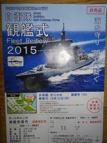 今年も海上自衛隊の2015 観艦式の第1回事前公開(体験航海)に行ってきました 。チケットは今回も知人からプレゼントしていただきました。寒川に住む同僚が早朝5:15に我が家に車で迎えに来てくれました。そして50分ほどで目的地近くに到着。車を有料駐車場に停め徒歩にて横須賀新港埠頭に到着。まずは手荷物検査。既に行列が。 三隻の護衛艦が停泊中。左から汎用護衛艦106さみだれ、104きりさめ、そしてミサイル護衛艦172しまかぜ。 目の前には猿島が見えた。猿島は、東京湾に浮かぶ無人島であり、湾内最大の自然島。島内には手つかずの自然と旧日本軍の要塞跡が残っている猿島公園があるのだ。我々が乗船する104きりさめのチケット確認受付。 ここでチケットの半券をクリアーケースに入れてもらい、首から下げてもらう。 護衛艦きりさめ乗船デッキ。 いよいよ乗り込み。まずは岸壁に停船している106さみだれへ乗船。 106さみだれの甲板を横断し104きりさめへ。そしてきりさめに乗船。 きりさめのガイドがチケット受付時に頂いた袋に入っていた。「きりさめ」は、中期防衛力整備計画に基づく平成6年度計画4,400トン型護衛艦2233号艦として、三菱重工業長崎造船所で1996年4月3日に起工し、1997年8月21日に進水、1999年3月18日に就役。全長151m、基準排水量 4,400トン。まずは艦内見学。船底に降りる急な階段を下る。 通路には各種配管が壁際を所狭しと這っていた。 中央制御室にも入ることが出来た。 艦艇後尾には自衛艦旗が掲げられた記念写真撮影場所も。もちろん同僚と写真を撮り合う。制服を着ての撮影が可能であったことを後に気づくが時遅し。艦船全部のデッキ端に陣取る。 目の前には62口径76mm速射砲が。マストには対水上レーダ、対空レーダが。手前の白い装置は 高性能20mm機関砲(CIWS)。 艦橋にはこの日の1日艦長が。 艦橋内部も見学可能。 レーダーも稼働中か? 公表不可との表示もあるが・・・・・。 黒板には「ネザ」 、「ミザ」 ・・・の意味不明の文字が。帰宅して調べてみると、燃料残量のことを「ネザ」、真水残量のことを「ミザ」と。その他に、コクザ:航空燃料残量、セリザ:生鮮食料残量、チョリザ:貯糧品在庫量ヒリザ:非常用糧食残量とのこと。隣の172しまかぜに装備されたスタンダードミサイル単装発射機。同じく74式アスロック8連装発射機。 我が護衛艦も出航前の国旗掲揚が行われた。 隣の172しまかぜも出港準備中で隊員が忙しく動いていた。 172しまかぜも隊員が一列に並び出港。 我が104きりさめもタグボートに曳かれて出港。 横須賀新港埠頭を離れ東京湾に。遠くに赤い見慣れた造船所の巨大クレーンが見えた。