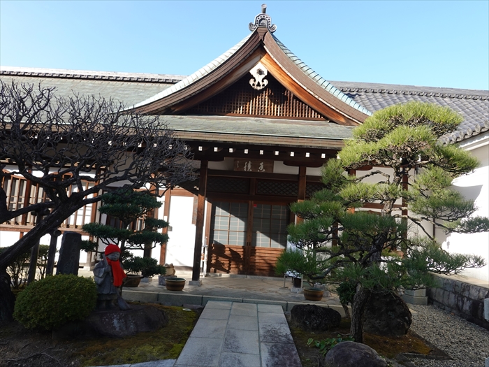 そして「中雀門」の左側にあった「寺務所」。石塔。玄関前にあった「仲良し地蔵」。「猫の侵人を防ぐため、扉を閉めさせて頂いております。用の方はインターホンにてお呼び頂き扉を開けてお入り下さい。」と。扁額「香積」。「香積」は寺院の厨房、転じて寺務を行う場所とのことであると師匠から。「總受附」と。以下3枚の写真は、以前に訪ねた時の写真。「寺務所」の中。以前に頂いた「御朱印」。スタンプ。「寺務所」の「火灯窓・花頭窓(かとうまど)」。中央に四角い穴の空いた石碑の名は??自然石を刳って作ったのであろうか、「手水場」が。水面には、「舟落葉」・モミジ葉が浮かぶ。近づいて。「大悲願力透徹救永劫」と。そして「鐘楼」。梵鐘をズームして。安永3年(1774年)の銘のある梵鐘。総高161.8センチメートル、口径81.6センチメートル、鐘身111センチメートル。銘文の文中には「功徳山早雲禅寺天嶽院北条氏繁公草創」とある と「鐘楼」前から参道を見る。「鐘楼」の先、右手にあった「六地蔵」は赤ではなく白の帽子、マフラーを。「庫裡」を横から。近づいて。「東司」は手洗い。手洗の中の額に書いてあった言葉を紹介させて頂きます。「禪寺では御手洗のことを東司(とうす)と申します。一、佛殿(ぶつでん)ニ、法堂(はっとう)三、僧堂(そうどう)四、庫裡(こり)五、山門(さんもん)六、東司(とうす)七、浴室(よくしつ)以上が禪寺に於ける七堂伽藍であります。」と。休憩所「黄楳亭」。この奥に「鶴夢楼」があった。「早雲閣」。法事等?で、食事が出来る建物のようである。「早雲閣」。玄関前には「仲良し地蔵」。近づいて。「早雲閣」前から「鐘楼」を見る。「鐘楼」の先には参道のモミジの紅葉が。廻り込み梵鐘をズームして。参道方向に戻る。「不動殿」横の道沿いに建っていた祠。三体の石仏が祠の中に。大小三体の石仏。 ・・・もどる・・・ ・・・つづく・・・