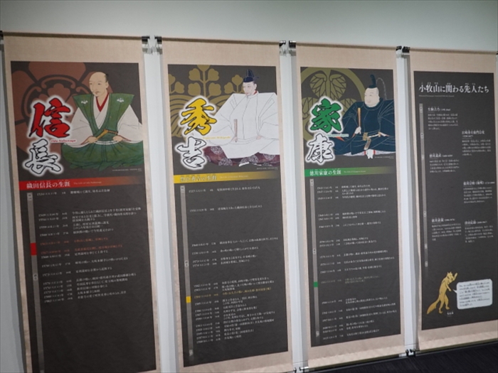 「小牧山に関わる先人たち」。織田信長、豊臣秀吉、徳川家康。「歴史の舞台 小牧山屏風の白い模型に映し出された合戦図の絵はプロジェクションマッピングの映像。来館者が視聴ゾーンに入るとセンサーにより自動で戦国時代の小牧山に関する映像コンテンツが展開されるのであった。その隣にも映像が。「変わる小牧山 小牧山今昔」。そして壁には多くのパネル展示が。「試掘からはじまる試掘調査の目的小牧山城には、永禄期(織田信長の居城時)と天正期(小牧・長久手の合戦時)の遺構がありますが、平成10年(1998)度の「史跡小牧山整備計画基本構想」では、整備の主たる時代設定を天正12年とし、永禄期の遺構については発掘調査に基づき整備を行うとされました。その後、小牧山山東麓の旧小牧中学校用地の調査で、永禄期の遺構に重要な発見があり、小牧・長久手の合戦時の改修がどのようなものであったかを明らかにするとともに、下層の信長の小牧山城の実態を明らかにした上で、整備方針を確定することが必要になりました。史跡整備の基礎資料を得るため、平成16年度から19年度の4か年にわたり主郭地区の試掘調査が行われました。試掘調査により、小牧・長久手の合戦時の遺構と、信長の築城時の遺構の貴重な調査結果が得られ、調査結果を活かし、より具体的な復元整備の方針が示されました。」試掘調査のおもな成果●第1次試掘調査(平成16年度) <大手道付近に小牧・長久手の合戦の改築の痕跡が>●第2次試掘調査(平成17年度) <主郭周辺の斜面には石垣が>●第3次試掘調査(平成18年度) <土橋付近の構造を確認>●第4次試掘調査(平成19年度) <岩盤上に築かれた石垣を確認>」「小牧山の発掘と整備の歩み1中世から近代の小牧山の歴史中世以前の小牧山の姿はよくわかっていませんが、古くは信仰の地であったようで、小牧山北西の間々観音寺(間々観音)の寺伝によると、中世に小牧山から現在地に移されたとあります。戦国時代の永禄6年(1563)には、織田信長が小牧山に初めて城を築き、清須(愛知県清須市)から居城を移しました。さらに、小牧山に初めて城を築き、清須(愛知県清須市)から居城を移しました。さらに、小牧山の南側には計画的に城下町を築きました。永禄10年(1567)の美濃攻略後、信長は稲葉山城(岐阜城・岐阜県岐阜市)へ移り、小牧山城は廃城になりました。天正12年(1584)の小牧・長久手の合戦では織田信雄・徳川家康連合軍の主陣地となり、大規模な改修が加えられました。小牧山は江戸時代には尾張徳川家の所有となり、家康公「御勝利御開運の御陣跡」として大切に保護されました。一般の入山が禁止されたことにより、山の中の土塁や堤などの遺構が良好な状態で遺されました。明治以後は官有地、民間、愛知県と所有者が変わり、一般に開放された時期がありましたが、明治22年(1889)に再び尾張徳川家の所有になり、一般の入山も禁止されました。史跡指定後の小牧山小牧山は歴史的に価値があり、遺構の保存状態も良いことなどから、昭和2年(1927)10月26日に国の史跡に指定されました。同年11月から小牧山再び一般に開放きれ、昭和5年には尾張徳川家から小牧町(当時)に寄付されました。太平洋戦争を経て、山の状況は大きく変化しました。昭和22年(1947)に東麓に小牧中学校が建設されたことをはじめとして、山頂の展望台(昭和30年)、青年の家(昭和39年)、市役所本庁舎(昭和40年)、小牧市歴史館(昭和43年)といった公共施設、他にも駐車場やし尿中継槽が設けられ、園路の拡張も行われました。これらの建設にあたって発掘調査は行われておらず、遺構の記録は古城絵図等の他には、史跡指定時に作成された測量図が残っているだけでした。写真左:小牧山山頂の展望台(昭和39年撮影)中 央:小牧市歴史館(開館当時)(昭和43年撮影)写真右:旧小牧市役所庁舎(昭和44年撮影)」「小牧山の発掘と整備の歩み2」史跡小牧山 帯曲輪地区の発掘調査と整備の実施昭和50年(1975)ごろから平成時代にかけては、史跡小牧山を「自然に親しみ歴史に触れることができる魅力ある山」とするよう、「小牧山整備基本調査報告書」(昭和59年)、「小牧山緑地整備 (北麓) に伴う小牧山史跡整備計画」(昭和62年)等で、整備の方針が定められました。昭和61年(1986)度、帯曲輪地区北部で史跡小牧山における最初の発掘調査が実施され、調査結果に基づき土塁等の復元が行われました。翌昭和62年度からは駐車場、し尿中継槽など史跡にふさわしくないものの撤去が始まり、平成10年(1998)度には小牧中学校が史跡外に移転しました。小牧中学校の跡地では、後述の「史跡小牧山整備計画基本構想」に基づき、平成10~14年度に発掘調査(平成10・11年度は試掘調査)を実施し、平成13年度から調査結果に基づく遺構復元等の整備が行われました。写真左:発掘調査時の土塁断面(小牧山北東麓)中 央:史跡公園として整備された帯曲輪写真右:復元された土塁(搦手口)※ 帯曲輪地区・・・小牧山の北麓から東麓にかけて、山を取り巻くように配置された曲