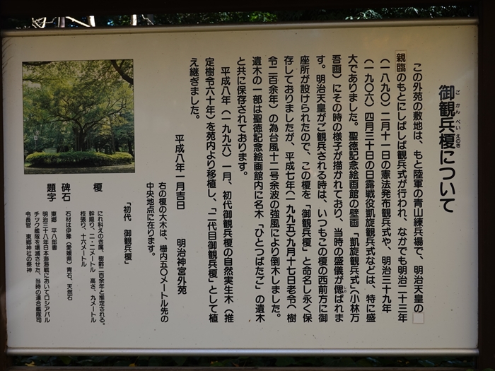 歩道右側にあったのが「御観兵榎についてこの外苑の敷地は、もと陸軍の青山練兵場で、明治天皇 の御台臨のもとにしばしば観兵式が行われ、なかでも明治二十三年(一八九〇)二月十一日の憲法発布観兵式や、明治三十九年(一九〇六)四月三十日の日露戦役凱旋観兵式などは、特に盛大でありました。聖徳記念絵画館の壁画「凱旋観兵式」(小林万吾画)にその時の様子が描かれており、当時の盛儀が偲ばれます。明治天皇がご観兵される時は、いつもこの榎の西前方に御座所が設けられたので、この榎 を「御観兵榎」と命名し永く保存しておりましたが、平成七年(一九九五)九月十七日老令(樹令二百余年)の為台風十二号余波の強風により倒木しました。遺木の一部は聖徳記念絵画館内に名木「ひとつばたご」の遺木と共に保存されております。平成八年(一九九六)一月、初代御観兵榎の自然実生木(推定樹令六十年)を苑内より移植し、「二代目御観兵榎」として植え継ぎました。 平成八年一月吉日 明治神宮外苑 右の榎の大木は、柵内五〇メートル先の中央地点に在ります。「初代 御観兵榎」榎 にれ科えのき属、樹齢二百余年と推定される。幹廻り、二・二メートル 高さ、九メートル 枝張り、十六メートル碑石 石材は伊豫(愛媛県)青石、天然石題字 東郷平八郎 書 明治三十八年日本海海戦においてロシアバルチック艦隊を壊滅させた、当時の連合艦隊 司令長官 東郷神社の祭神」「二代 御観兵榎」。「左前方に眺望む円屋根・白亜・石造の建物聖徳記念 絵画館THA MEIJI MEMORIAL PICTURE GALLERY近代日本のあけぼの大壁画にみる幕末・明治の歴史開館時間:10:00~16:30(最終入館16:00)休館日/水曜日(祝日の場合は直後の平日休館)施設維持協力金 500円 入場の際にお納め下さい。徳川幕府を改め、日本史上空前の大改革・明治維新が断行され、西欧の諸国が300年を要した国家の近代化を、僅か40年ばかりで成しとげた輝かしき明治の時代。当代一流画家の筆に成る館内展示の80面の大璧画が、明治天皇を中心に、わが国近代化へと飛躍の姿・歴史事件の数々を静かに語りかけてくれます。生きた明治史の教室といえましよう。」「聖徳記念 絵画館」。明治天皇と昭憲皇太后の生涯の事績を伝える80点の絵画を展示する、神宮外苑のシンボル。ギャラリーは2つのエリアに分けられ、東側には日本画、西側には洋画を展示。縦約3m、横約2.7mの大壁画が、画題の年代順に展示されており、当時の出来事を時代を追って見ることができる。明治天皇の生涯での主要な出来事が描き出されており、一流画家による優れた芸術作品でありつつ、政治、文化、風俗の貴重な歴史史料でもある。T字路・神宮軟式球場噴水前の歩道から「明治神宮外苑 いちょう並木」をカメラで撮影する多くの人々の姿が。私もその群衆に混じって。車の姿が少ない時に、懸命にシャッターを押したのであった。そして振り返って「神宮軟式球場噴水」越しに「聖徳記念 絵画館」を見る。「神宮外苑 聖徳記念絵画館前・総合球技場」では、2024年11月19日(火)〜12月25日(水)の期間で「東京クリスマスマーケット2024 in 神宮外苑」👈️リンク が開催されていた。「聖徳記念 絵画館」をズームして。そして先程と反対側の並木道を、「青山2丁目交差点」に向かって進む。横断歩道の信号待ち時にシャッターを押す。「神宮軟式球場噴水」前のカメラ撮影の人々の姿を振り返って。そして横断歩道を渡り、イチョウ並木の下を進む。車の来ない時を待って、反対側の並木の姿をカメラで追う。地面に近い位置から反対側の並木を。絵画館方向を振り返って。「青山2丁目交差点」方向を。「秩父宮ラグビー場」入口から「明治神宮外苑 いちょう並木」を振り返って。ズームして。さらに。正面に見えるのが「秩父宮ラグビー場」。再び「明治神宮外苑 いちょう並木」まで引き返して。「絵画館」方向を。再び「青山2丁目交差点」に向かって。「青山2丁目交差点」手前まで戻り、「明治神宮外苑 いちょう並木」を振り返る。「青山2丁目交差点」角・西側の「江戸城枡形門(江戸城石垣移築)」。「外苑いちょう並木」入口にあるこの石塁は、かつて江戸城を支えていた石垣で、旧国立競技場ができた1958年以前にあった明治神宮外苑競技場のもの。そして神宮外苑造営の際に建設されたものであるとのこと。関東大震災後のバラック建設の指揮官であり、小学校の鉄筋コンクリート化を推進した建築構造家・佐野利器が計画・建設したとのこと。移動して。「明治神宮外苑 いちょう並木」が雲一つない青空を背景に。ズームして。横断歩道を渡りながら。 ・・・もどる・・・ ・・・つづく・・・