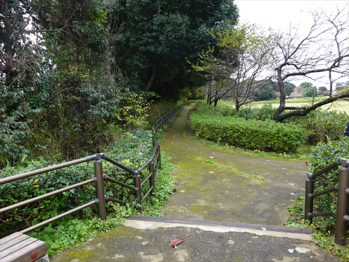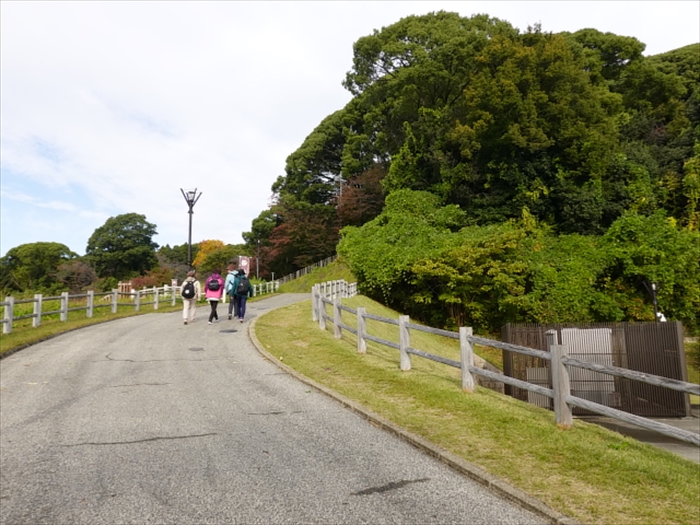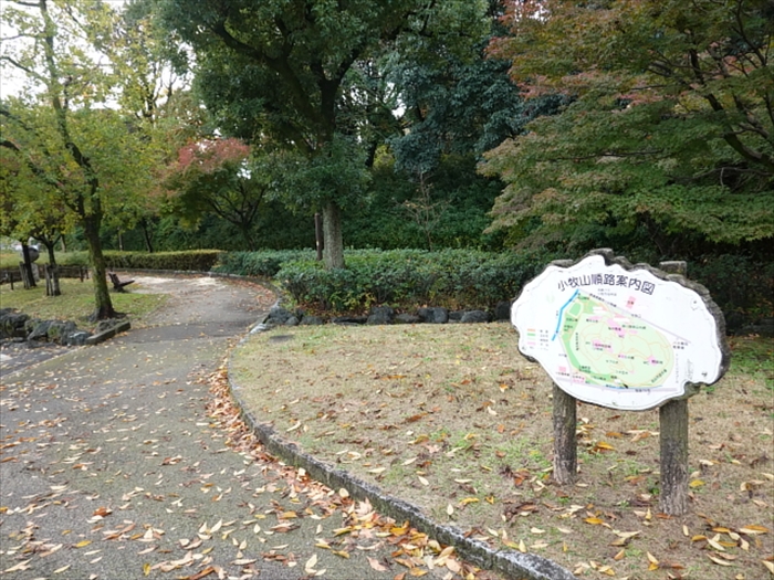 「れきしるこまき(小牧山城史跡情報館)」を後にして、山頂にある「小牧山城跡・小牧山歴史館」に向かって登城する。幟「徳川家康本陣の地 小牧山城」。「小牧山歴史館(山頂)」への案内板。右手に「桜の馬場」。「小牧山のふもとに造られた二重の土塁と堀1584 (天正12)年の小牧・長久手の合戦で、小牧山に陣を敷いた織田信雄、徳川家康連合軍は、羽柴(豊臣)秀吉と対峙するため、織田信長の城であった小牧山城を改修し、山のふもとにニ重の土塁と堀を造りました。この場所の東側には、合戦の時に造られた内側の土塁が続いています。ここから南側にある堀の底までは約9mの深さがあります。」織田信雄、徳川家康連合軍が造った内側の「土塁」・「堀」を見る。「土塁」・「堀」の先に「大手道に繋がる「虎口」、道路の先に「小牧市庁舎」が確認できた。展望台。「小牧城下町小牧山に城を造った織田信長は、山の南側に城下町を造りました。当時はここから町の様子が見えたことでしよう。町は南北1.3km、東西1kmの広さで、東西、南北に道が通り、町の南側に造った土塁(土を積み上げて造ったかべ)と堀(地面を掘って造った大きな溝)により町が囲まれていたと考えられています(写真1)。町の中は身分や仕事の種類によって住む場所が分かれており、町の中央から西部には染物をする人や戦いの時に着る鎖の部品や刃物などを作る人などが、町の東部には武士が住み、寺がありました。城下町の東部にあたる新町遺跡の発掘調査をしたところ、土塁と堀で囲まれた屋敷地の中に建物や井戸が見つかりました(写真2 )。屋敷のある場所の全部は調査できませんでしたが、その大きさは南北19m東西45mの広さと考えられます。城下町の西部にあたる上御園遺跡の発掘調査をしたところ、南北6~7m、東西55 ~ 65mの細長い敷地に、道に面したところに建物、その奥に井戸などがあり、その奥は畑か庭で、一番奥に溝があるという様子がわかりました(図1)。溝は、町を区切る境にもなっていました。」「城下町の範囲とおもな道」。小牧山城は城の周りに堀がなく、城下町にも惣堀(町全体を囲む堀)もなく、防御性には乏しく、当時の戦闘用の城とはまったく違うものといえそうだが、となるといったいこの城は何なのか、信長は何のために作ったのか、その謎はさらに深まっているのだ と。堀、土塁の先に「小牧市役所」方向を見る。前方右に「大手口」の石段を再び。「史跡小牧山案内」。「小牧山の樹木市のほぼ中央に孤立する古生活の山で、昔から保護され、自然林の大木が育っていたが、コイサキの大群の生息により、木々が衰退し、大正以降ニ度にわたる台風によって被害をうけた。しかし、一部にシイ・カシ・カエデの自然林に近い状態が残り、タブオガタマの古木やユズリハ・カクレミノ・モチノキ・アオキなども多くその樹皮には、リュウメンシダや大形のイワガネゼンマイ・アスカイが見られる。乾燥部には、べニシダの仲間が群落を作っている。」さらに大手道方向に進む。「小牧山ランニングコース利用者のみなさんへこのコースは、市民のみなさんの日頃の運動不足を解消し、健康体力の向上をはかるために設定しました。利用される方は、下記の点に注意して楽しくご利用下さい。1走る前に必らず準備運動すること2自分のペース、能力に応じて走ること3歩行者、下り坂等、特に気をつけて走ること4体の調子の悪い時は、ただちにやめること5このコースでの夜間利用は禁止いたします6ジョギング中に気分が悪くなったりした時は、歩いて休息するか中止してくださいなお、コースの利用上における傷害、事故等について、市、教育委員会では責任を持てません お問い合わせ・小牧市教育委員会 TEL(0568) 72ー2101」「大手道コース」案内板。そしてこちらが、「大手道」。「市教育委員会では令和3年度から、戦国時代の武将・織川信長が山頂周辺に築いた2 ~ 3段の石垣や、南麓から山頂へ至る大手道の一部などの復元整備を進めています。令和5年度には、大手道沿いに切り立てられた岩盤と、その上に築かれた石の復元整備を行いました。」「10月1日から山頂周辺の石垣等復元整備工事に伴い、一部立入禁止となります。」と。「大手道」をズームして。織田信長が歩いたこの道を歩きたかったが!!この日は訪ねなかったが、ここが「小牧市役所前」からの「小牧山城」の「大手口」。以下4枚の写真はネットから。上の石段の先を見に折れた道が「大手道」。この先、左手にあるのが「徳川源明公墓碑」。「徳川源明公墓碑尾張藩中興の祖といわれた尾張徳川家九代藩主徳川宗睦源明(むねちかげんめい)公の墓碑である。元々は、尾張徳川家の菩提寺である名古屋市東区の建中寺にあったが、昭和二十八年に行われた区画整理のため、移転を余儀なくされ、徳川家に縁が深い小牧山のこの場所に移設されたものである。 平成二十二年十二月 小牧市教育委員会」と。その先の左手にあったのが「小牧山稲荷神社」。「小牧山