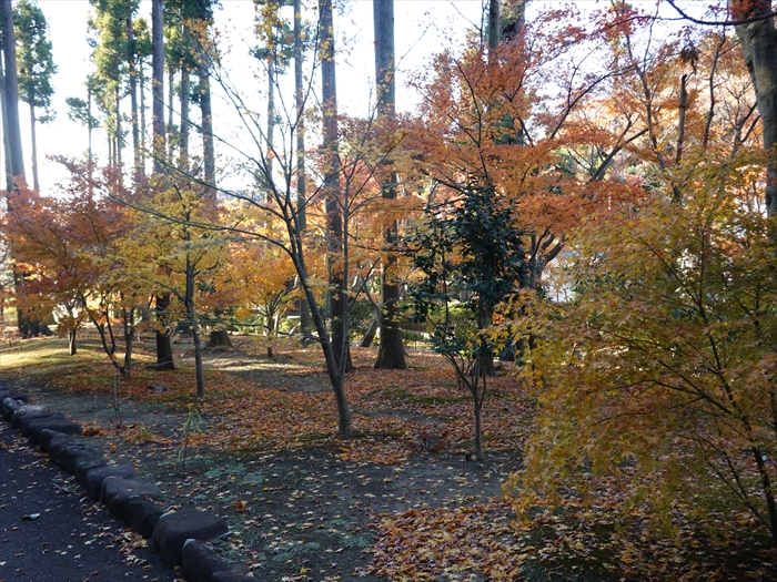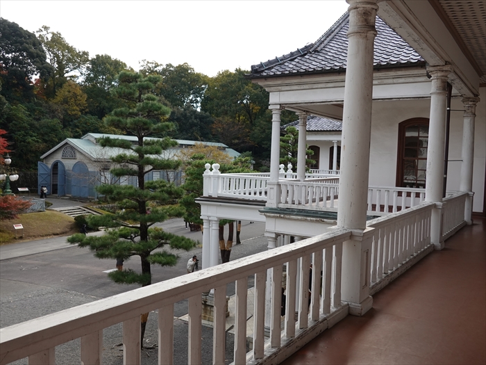 「聖ヨハネ教会堂」を後にして、紅葉を楽しみながら「明治村」の散策道を北東方向に進む。右手に「和食処 碧水亭」の案内板。「和食処 碧水亭」。入鹿池と日本庭園を見渡せる和食処であると。案内板。「和食処 碧水亭」入口正面。「宮沢賢治のえび天そば宮沢賢治の好物の天ぶらそばに、同じくお気に入りのサイダーを組み合わせました!」と。1600円。その下に様々なメニューが案内されていた。店内の写真をネットから。「天丼定食」か。カエデの紅葉。水鉢に浮かぶモミジ葉。そして次に訪ねたのが「⑧西郷従道(つぐみち)邸」。明治初期の貴重な洋館建築の一つ。西郷隆盛の弟、西郷従道が建てた住宅のうち、接客用に設けられた洋館。従道は陸海軍の大臣を歴任していたため、在日外交官の来客も多く、明治22年(1889)には明治天皇の行幸も仰ぎました。設計にはフランス人レスカスが関与していると伝えられ、建築金具や階段などをフランスから取り寄せているほか、2階には日本三景が描かれた陶板で飾った暖炉も設置されています。この建物は耐震性を高める工夫がなされています。屋根には軽い銅板が葺かれ、野地板が斜めに張られているほか、外壁は柱間に落とし込んだ本実下見板張りとなっています と。移動して見上げて。「1丁目8番地 西郷従道邸旧所在地 束京都目黒区上目黒(西郷山)建設年 明治10年代解体年 昭和38年移築年 昭和39年建築面積 76.8坪構造 木造ニ階建銅板葺寄贈者 日本国有鉄道」この建物は西郷隆盛の弟、西郷從道が建てた住宅のうち、接客用に設けられた洋館である。從道は陸軍の大臣を歴任していたため、在日外交館の来客も多く、明冶22年(1889)には明冶天皇の行幸も仰いだ。設計にはフランスレスカスが関与していると伝えられ、建築金具や階段などをフランスから取り弁せているほか、2階には日本三景が描かれた陶板で飾った暖炉も設置されている。この建物は耐震性を高める工夫がなされており、屋根には軽い銅板が葺かれ、壁の内側にはおもりとなるように煉瓦が埋め込まれていた。」西郷従道邸横のモミジ。ズームして。青空であれば・・・・。玄関ポーチ。玄関ポーチの天井は、細かい菱組天井になっていた。二階はフランス窓風に。「建物ガイド 西方従道邸」案内板。玄関の内側から。玄関ホールの「西郷從道天保14年( 1843 ) 5月5日 明治35年(1902)鹿児島県出身身長160Ccm (推定)」ここにも「建物ガイド 西郷從道邸」「明治村 錦絵れきし探偵団」。「顕舞蕗の略面」楊周延画」。玄関ホール。玄関ホールの天井。「豆知識この部屋の天井は、鉄板を押して成形したものが張られています.近代以前の建物に多く見られる『石彫」『木彫』などの装飾を、産業革命によって生まれた大量生産品で代用するようになったものです。」しかし、明治10年頃の日本では超高級品に値いしました.ニ階べランダでも見られます。絵画。誰の作品であっただろうか。私の姿も映り込んでしまっていたが。客用食堂・応接室。移動して斜めから。ティーカップ。客用食堂の窓の外には紅葉が。ティーカップと大皿。西郷従道邸案内図。2階の見学は不可であった。書斎。玄関わきの北側の部屋。書斎の天井を見上げて。落ち着いた質素?な照明。客用の食事場所か。椅子はバルーンバックチェア。テーブルの脚は、テーパードで、フルーティングが施された、アダムフル―テッドと呼ばれもの、窓際のカウンタ―テーブルの天板が大理石、側面には彫刻がついてる とネットから。書斎の丸テーブルが絨毯の上に。さらに書斎を。執務用の机か。左手前方に世界地図。「西郷従道が取り組んだこと戦のあとを考えて台湾出兵の都督となった西郷從道は、原住民同士の争いを利用しながら、相手が降伏すれば優しく、歯向かえば家を焼き尽くすなど、徹底的に攻撃するというやりかたで、ニ度と台湾が日本に敵対できないことを目指した。西南戦争でも、武器購入、各地の士族動向の調査、兵士の人員調整などを行い、戦後の反乱防止に努めた。」独立した軍を目指して台湾出兵や西南戦争の後、病死を除く、「天皇のために戦った」戦死者に対し、東京の招魂社にて合祀の祭礼を行う。このような軍人を祀る招魂社をよリ権威づけるため、從道はその社号の変更を求め、まもなく「靖国神社」となった。以後、「靖国神社」は神社の中でも別格扱いとなり、軍の権威も高められた。さらに政府から距離をとり、軍事行為を行いやすくするため、天皇直属の軍令組織、参謀本部の設置を申請。その後も從道は大山巌とともに、天皇の軍事式典への積極的な参加を求め、天皇と軍の関係を密接にしていく。欧米に学び、軍の規模を拡大海軍大臣時代、アメリカを訪問した從道は、アメリカ軍に関して、軍事予算は議会の力で削減されているが、将校の技術は備わっているため、政府さえ許せば簡単に軍事力は強くなる国だと評した。帰国後、現状日本では独立国の海軍の規模ではないとして、軍事予算の拡張に努めた