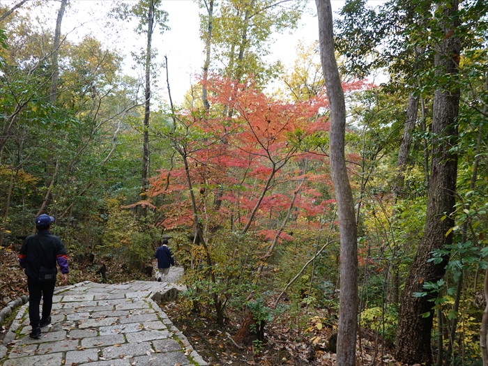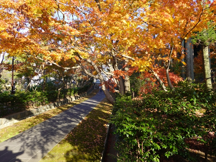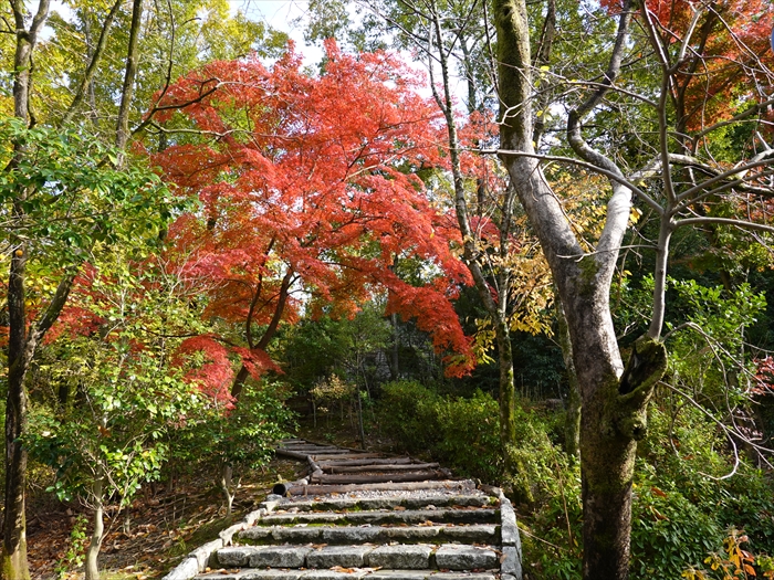 参道の横にある道を「山門」方向に向かって進む。紅葉の木々の先に「山門」が垣間見えた。ズームして。陽光に輝く真っ赤に紅葉したモミジ葉を追う。陽光を浴びて、真っ赤に染まったモミジの葉は、まるで燃えるような鮮やかさを放っていた。その深紅の色合いは、冬の訪れを感じさせる一方で、秋の終わりを彩る華やかな贈り物の如し。葉の縁はほんのりと黄金色に輝き、風に揺れる度に光の加減で一層鮮やかさを増し、まるで赤い宝石のように輝きながら、空気の中に温かみをもたらしていたのであった。静かな晩秋の午後、モミジの葉はその美しさで心を包み込んでくれたのであった。参道方向に引き返して。灯籠の先、石舟の上に「不動尊」。再び石段の上から山門方向のモミジの紅葉トンネルを見る。ズームして。さらに。 ・・・もどる・・・ ・・・つづく・・・