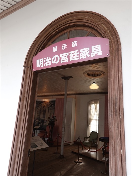 「展示室 明治の宮廷家具」と。現在、迎賓館赤坂離宮となっている東宮御所は、明治42年(1909)に竣工し、当時皇太子であった大正天皇のために建てられました。設計の中心となった片山東熊は、建築家として建物を設計するのみならず、室内装飾においても多くの業績を残しています。花鳥の間は、「饗宴の間」とも呼ばれ、晩餐会などに使用された部屋です。「明治の宮廷家具博物館明治村には約400点の宮廷家具を所蔵しています。その中から、明治42(1909)年に竣工した東宮御所(大正大皇の皇太子時代の宮殿)の創建当初の家具を紹介いたします。背景に使用している写真は竣工当時の室内を写した写真(東宮御所写真帖)です。これらの家具が明治村へもたらされた当初は、家具が使用された部屋などの情報は、ほとんどありませんでしたが、東宮御所写真帖や宮内庁所蔵の資料から、明治村所蔵家具が使用された部屋の多くが判明しました。」「孔雀(くじゃく)之間」。皇太子用の客室としてしつらえられたもの と。「孔雀(くじゃく)之間孔雀之間の室内装飾は「明治工業史」によるとフランス18世紀末様式で。天井には花鳥や楽器等が描かれた油絵が用いられ、壁面の中央に飯田新七が納めた「孔雀にボタンと文鳥に桜」を刺繍したものが飾られ、室名の由来ともなっています。残りの壁面は石膏の型抜きの装飾が用いられ、カーテンは飯田新七が納めた淡い紅色の織物が用いられています。家具を納入したのはフランスのパリに拠点を置くフールジノア(Fourdinois,Henri 1830ー1910) です。彼はフランスだけではなく他のヨーロッパ王室へも家具を納入し、東宮御所の大部分の部屋の家具を納入し、東宮御所室内装飾に功績があったとして、日本政府より明治40 (1907)年勲五等旭日章を授与されています。」「紅の間」。「紅(くれない)の間紅の間は皇太子の謁見所・狩之間と朝日之間の間に位置する部屋で、控えの間とされたものです。他の多くの部屋と同じようにフランス18世紀末様式で装飾され、壁はローズ色に花束模様、カーテンは淡紅色の織物が用いられ、家具はフランスのフールジノアが納めたものです。」「狩の間」。正面の立派な家具は、家具作家Reisnerが1780年代にベルサイユ宮殿に納品されたものとかなり似ているとのこと。移動して。ズームして。「朝日の間朝日の間の室内装飾は「明治工業史」によるとフランス18世紀末様式で。天井には「旭日」に朝霧が昇り桜花に映ずる間において神女が玉馬に鞭ち香車を駆るの図」が描かれ室名の由来ともなっています。柱はノルウェー産の大理石、壁面には曽和嘉一郎が納めた草色の菊の御紋が織り出された金華山織が用いられたと記載されています。室内の家具を納入したのはフランス人エンシェル(Hoentschel,Georges 1855-1915)で、彼は、1900年のパリ万国博覧会、1904年のセントルイス万国博覧会の内装なども手がけた。フランス有数の室内装飾家で、フランす勲章・レジオン・ドヌール・オフィシエを受賞している。」「朝日の間」。「三重県庁舎」を後にして振り返る。前方にあったのが「二重橋飾電燈」。「1丁目11番地 二重橋飾電燈(かざりでんとう) <登録有形文化財>旧所在地 東京都千代田区千代田建設年 明治21年解体年 昭和38年移築年 昭和40年構造 鋳鉄製飾電燈寄贈者 宮内庁二重橋は江戸時代には西の丸下乗橋(木橋)と呼ばれた。二重橋の呼び名の起こりは堀の水面から橋までの高さが高く直接に橋梁を架ける事が困難なため、中間に橋桁を渡し、これを土台としてその上に柱を立て更に桁を渡して橋を架けたため、あたかも橋が二重になって見えたのでこの名が生まれた。この下乗橋は木橋のため老朽化し、明治21(1888)年鉄橋に架け替えられた。その後、さらに昭和39(1964)年この鉄橋は昭和宮殿の建設にあたり、鉄橋と飾電燈と共に更新された。「二重橋飾電燈」越しに「三重県庁舎」を見る。「鋳鉄製の飾電燈(かざりでんとう)」。皇居造営にともない架け替えられた二重橋には、橋の西側両端に並んで6基の飾り電灯がつけられていました。明治村には、そのうちの一つが移築されています。飾り電灯は、高さ5.2mの鋳鉄製でドイツのHARKORT社によって製造さられました。全体を植物意匠のネオ・バロック様式で飾る。角壺形の基部に立てた主幹上に1灯を掲げ、四方の腕から各1灯を吊る。火屋(ほや)は卵形で、笠は放射状に蔓を巻き上げる。安定した重厚な基部が軸部を支え、軸部から出た葉文様の丸鋼で出来た4本の枝が軽々と大きなグローブを吊り下げています。飾り電灯の周りを囲む鉄柵には、二重橋とそのたもとにあった唐草模様の鋳鉄製欄干を利用しています と。ズームして。皇居前広場から皇居に通じる、石橋の上に設置されていた6基の飾り電灯のうちの1つ。もともと、この場所には江戸時代から「西の丸大手橋」と呼ばれる木橋が架かっていました。明治宮殿の造営につき、石橋に架け替えられた際に、橋とともに造られたのがこの電灯です。設計は皇居造営事務