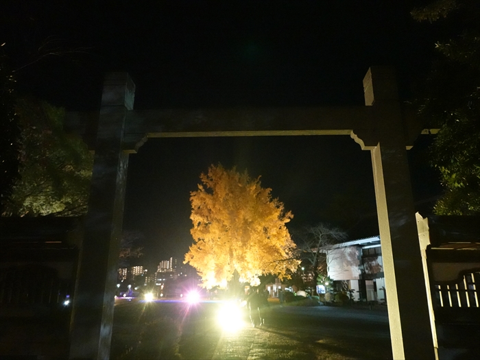「大書院の光のインスタレーション作品」の鑑賞を終えて、「黒門」からの「大イチョウ」を見る。「大イチョウ」に向かって歩く。「竹の灯り」越しに。「遊行寺宝物館」を正面から。「遊行寺開山七百年記念特別展 藤沢のおぐり」👈️リンク が令和6年10月5日(土)~12月16日(月)で開催中であった。「大イチョウ」の黄金の輝きをカメラで追う。「大イチョウのライトアップ」は、言葉では尽くせないほどの美しさが眼前に。夜空に浮かび上がる黄金色の葉は、まるで星々が地上に舞い降りたかのような輝きを放つのであった。その光景は、自然の壮大さと人々の手による美しい演出が調和した、まさに幻想的なひとときなのであった。静寂の中で風に揺れる葉の音が、光に照らされたイチョウの荘厳さを一層引き立て、訪れる人々の心に深い感動を与えるのであった。この光のアートは、時間が止まったような感覚とともに、心の奥深くに刻まれる瞬間を提供してくれたのだ。樹齢700年以上とも言われるこのイチョウの巨木は、昼間に見ても圧倒されるその存在感が、夜になると光の魔法によってさらに引き立てられるのであった。足元に目を向ければ、散り積もったイチョウの葉がライトの光を受けて地面に金色の絨毯を敷き詰めたような光景を作り出していたのであった。木の根元から夜空へと伸びる幹は、長い歴史を物語る力強さを感じさせると同時に、その圧倒的な大きさが夜の静寂の中で一層神聖さを帯びて。「大イチョウ」の大木の下に立ち見上げると、自分が光の中に包み込まれるような感覚を。その光景には、日本の秋が持つ詩的な情緒と、古木がたたえる悠久の時の流れが織り込まれており、心を深く癒す力が。このライトアップは、単なる観光名所を超え、生命の美しさと自然の奇跡を再認識させる瞬間を提供してくれる、まさに「感動の光景」なのであった。再び「遊行寺」の本堂を背景に。樹齢700年以上の幹には大小の乳根が。イチョウの老木に見られる大小の乳根(ちちね)は、まるで自然が紡ぎ出した独特の芸術作品。重厚な存在感を持つ大きな乳根は、まるで地上に向かって力強く垂れ下がる縄や布のよう。年月を重ねたその表面には、ひび割れや独特の凹凸が刻まれ、生命の歴史を語るかの如し。力強くも優雅なその姿は、大木が大地に深く根ざし、地球とつながる象徴。小さな乳根は控えめでありながらも愛らしい存在感を放ちつ。細く繊細なそれらは、木が新たな命の一部を伸ばしているような印象を。ちょうど細い糸や垂れた滴のように、柔らかく優しい動きを感じさせるのであった。そして「上弦の月」を。地上そして上空からの「上弦の月」からと、同時ライトアップ。そして感動のままに、遊行寺の境内を背にして「いろは坂」を下る。この石段は、阿弥陀様の四十八願にたとえて、四十八段と呼ばれている。春には両脇の桜で花のトンネルとなり、訪れる人々の憩いを与えてくれるのだ。平成19年(2007)に大改修が行われた。地元の方々には、いろは四十八文字から、「いろは坂」の愛称で親しまれているのであった。「真徳寺」の山門。山門先の石碑に我が影を。この石碑の表面には仏様のお姿が線刻されているのをこの時は忘れていたのであった。スイマセン!!合掌、合掌、合掌∞・・・・・・・・・・・・・∞。「惣門」を振り返って。「藤沢市ふじさわ宿交流館」横のライトアップ。静かに白色の灯りが灯る。「藤沢市ふじさわ宿交流館」入口。藤沢宿「高札場跡(こうさつばあと)」。高札場とは、幕府や領主が決めた法度(はっと)や掟書(おきてがき)などを木の板札に書き、人目のひくように高く掲げておく場所のこと。神奈川県の東海道では、9つの宿場にそれぞれ1カ所ずつある と。いずれも江戸から京都に向かって街道の右側に設置されているのだ と。「旧東海道・藤沢宿」案内板。「遊行寺橋(旧大鋸橋)・高札場跡江戸から東海道を進むと、東海道第六の宿、藤沢宿内の遊行寺橋(旧大鋸橋)で境川(片瀬川)を越えて鎌倉郡から高座郡に入ります。橋を渡って、右手が大久保町。橋のたもとに高札場があり、公定運賃の定め、キリシタン禁制など、徳川幕府の重要法令が掲示されていました。高札場は屋根付きで高さ約3.6m、横幅5.4m、縦幅1.8mの規模であったと。左手(南側)には「江の島一ノ鳥居」が建てられていた。江の島弁財天の遙拝の鳥居で、東海道と別れて鳥居をくぐれば、「江の島道」です。」この附近はライトアップされていなかった。歌川広重「東海道五拾三次〈狂歌入東海道〉藤沢」(草津市蔵)ネットから。狂歌「松吟庵清風うちかすむ 色のゆかりの ふち沢や 雲井をさして 登る春かな」「東海道五十三次 藤澤宿」。歌川広重(初代) 嘉永(1848~54)本図は、遊行寺の門前町としても栄えた藤沢宿の黄昏時を描いた作品。宿についた旅人を提灯をつけて迎える女や客引きをする留女の姿が生き生きと描かれている。広重の代表的な東海道シリーズの一つ。揃物名が隷書体で書か