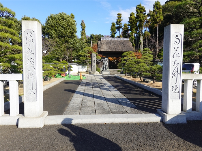 正面に「慈眼寺」の楼門が見えて来た。山門は楼門で、現在の東京都区部の寺院では珍しい。門内には四天王が配され、屋根には鴟尾が乗る。真言宗智山派の寺院。正式には喜楽山教令院慈眼寺。徳治元年(1306年)、旅僧が、滝ケ谷戸崖から掘り出された降三世明王像を祀って創建。天文2年(1533年)に現在地に移転した と。扁額「喜楽山」。寺号標石「真言宗智山派 喜楽山教令院慈眼寺」。楼門内には四天王が。「四天王の配置」図。四天王は、東西南北の4方を守る役目の4人(神)組。「四天王」はグループ名で、構成メンバーは持国天、増長天、広目天、多聞天となります。それぞれの役割は、以下の如し。持国天:国を支える増長天:恵みを増大させる広目天:広く見通せる目をもつ多聞天:仏の教えを多く聞く本堂に向かって、右前から右回りに「持国天・増長天・広目天・多聞天」という配置となっていた。楼門の正面・右側から「持国天(じこくてん)」。持国天は四天王の一体、東方を護る守護神として造像される場合が多く、仏堂内部では本尊に向かって右手前に安置されるのが原則である。その姿には様々な表現があるが、日本では一般に革製の甲冑を身に着けた唐代の武将風の姿で表される。持物は刀の場合が多い。例えば胎蔵界曼荼羅では体色は赤く、右手を拳にして右腰に置き、刀を持つ右手を振り上げて仏敵を威嚇し、左手を腰に当てる姿に表されていた。正面からなんとか。「持国天」。「持国天国を支える東方の守護神四天王のうち東方を護る神々の将軍現名ドゥリタラーシュトラは文字通り「国を支える者」という意味だ。右手に剣を持ち、左手で刃を支える姿の像が多いが、一定ではなく、右手で剣を振り上げて左手は腰に置いたり、逆に左手に刀を持ち、右手は腰に置く像もある。仏堂では本尊を北として、右方前方に置かれる。」足下の邪鬼を踏みつけていた。「増長天」。正面からなんとか。「増長天」。「増長天仏法と信者を守る南方の守護神四天王のうち南方を護る神々の将軍。現名ヴィルーダガは「増大した者」の意で大きな力を持つ武神のこと。左手に三叉の鉾(戟)を持ち、邪鬼を踏みつけるか岩座に立つ。左手は、腰にあてる像と、太刀を持つ像がある。中国古代の鉄人の姿で鎧は革製のものを表している。仏教では本尊を北として左方前方に置かれる。」こちらも、足下の邪鬼を踏みつけていた。「多聞天」。正面からなんとか。「多聞天」。「多聞天戦国武将の信仰をあつめた北方の守護神四天王のうち北方を護る神々の将軍。インド・中国の東方にある日本では武将の守護神にもなる。原名ヴァイシュラヴァナを「多く聞く者」と訳して多聞天と呼ばれる。また、その音から毘沙門天ともいい、単独で除災招福の神として祀られる。右手で宝塔を掲げ、左手で鉾又は棒を持つ姿が普通。仏堂では本尊を北として、右肩後方に置かれる。」こちらも、足下の邪鬼を踏みつけていた。「広目天」。正面からなんとか。「広目天」。「広目天千里眼を持つ西方の守護神四天王のうち西方を護る神々の将軍。原名ヴィルーバークシは「千里眼のような不思議な力がある目を持つ者」と考えられて広目天と呼ばれるようになった。右手に筆、左手に巻物を持って書きつけている姿が特色。武人の姿だが、四天王の中では穏やかな表情である。竜王を従えるという。仏堂では本尊を北として、左方後方に置かれる」。こちらも、足下の邪鬼を踏みつけていた。楼門の先に「本堂」。本堂は昭和50年建立。本尊は大日如来。「弘法大師ご誕生千二百五十年記念塔」。弘法大師・空海(774-835)は、宝亀(ほうき)5年(774年)6月15日、現在の香川県善通寺市にお生まれになりました と。境内の建物は外装工事中であった。案内書。一枚岩を彫り抜いた手水場。「本堂」に近づいて。「本堂」前の「興亜観世音菩薩像」。宝冠をいただき円光をつけ、身に条帛・裳(正しくは裙)をまとい、 天衣をかけて、蓮華座の上に、ややうつむきかげんにお立ちになっています。昭和15年に造立され、現在は本堂正面の右手にありますが、旧本堂の頃は、本堂正面にありました と。五重塔型燈籠。平成9年(1997年)瀬田大塚園納 と。さらに「本堂」に近づいて。1975年(昭和50年) - 現本堂を建立 と。扁額「慈眼寺」と。「玉川八十八ケ所霊場 第三十七番霊場札所」と。昭和期に入り、川崎大師平間寺を一番寺として、 弘法大師有縁の古刹を巡る八十八ヶ所に構成されたものです。 もちろん、四国八十八ヶ所霊場巡拝を写したもので、 慈眼寺は第三十七番霊場札所になります。 第八十八番霊場の宝幢院(東京都大田区西六郷)まで、神奈川の横浜市から川崎市、東京の世田谷区、大田区、品川区を辿る巡拝路です と。「釈迦塔」は昭和54年建立。移動して。墓地側から。「掲示板」。「弘法大師一千百三十年忌報恩塔」。無縁塔。「故陸軍歩兵伍長勲八等功七級柳田行雄靈」碑。「弘法大師一千年忌報恩供養塔」(右)「法篋印塔(左)と六地蔵尊」(手
