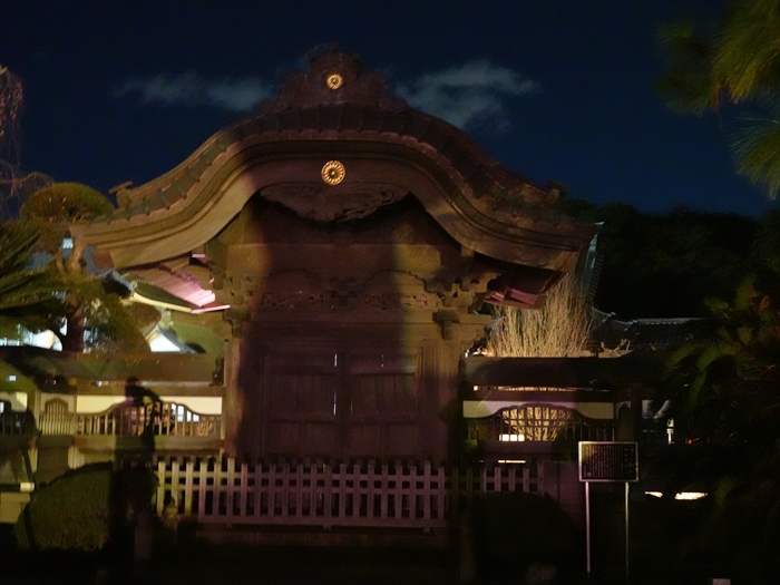 そして次に訪ねたのが「鐘楼」の先にあった「中雀門」。「中雀門」は安政6年(1859)に紀伊大納言徳川治宝が寄進、建立された。向唐門(むかいからもん)様式で作られている。境内の建造物の中でもっとも古く、紀伊大納言徳川治宝公の寄進により、安政六年(1859)に建てられた。 明治の大火を含め度重なる火災でも焼け残っていたが関東大震災で倒壊、その後以前の姿に復元され平成二十年四月大改修が完成した。四脚門で、高さ約6m、幅約2m70cm。「大イチョウ」を振り返って。「大イチョウ」の上空に「上弦の月」。「大イチョウ」をズームして。「大イチョウ」と「遊行寺宝物館」。「遊行寺宝物館」。そしてこちらが「寺務所」への「黒門」。うすねずみ色の「黒門」から「寺務所」正面を見る。濃いピンクにライトアップされた樹。「中雀門」を「御番方」側から見る。「藤沢市指定重要文化財(建造物)平成二七年(二◯一五)十月一日指定中雀門安政六年(一八五九)に紀伊大納言徳川治宝(はるとみ)が寄進、建立されました。清浄光寺はたびたび火災にあっていますが、この中雀門は明治十三年(一八八〇)の藤沢宿大火の際にも焼失を免れた境内現存最古の建物です。大正十ニ年(一九ニ三)の関東大地震で倒壊したものを、引き起こして補修し、今に至っています。向唐門(むこうからもん)造りで、高さ約6.4m、幅は約2.7m(左右柱間内寸)です。正面破風及び屋根大棟側面と鬼瓦に菊の御紋、下り棟鬼瓦に徳川家の葵紋が刻まれています。勅使門としは閉門していますが、現在は遊行上人が出立帰山する時や、開山忌行列等の諸行事に合わせて開門されています。」「光のアート展示」会場に向かう。再び振り返って。大書院や中廊下では、辻堂神台にある藤沢市アートスペース「アーティストプラットフォーム」事業として、藤嶺学園藤沢中・高校の生徒と、湘南工科大学総合デザイン学科中尾研究室が共同制作した作品『光を結ぶ、光を掬う、光を聴く』が展示されていた。「展覧会にあたって本展覧会では、藤沢市アートスペース事業、アーティストプラットフォームで制作した作品を展示しています。アーティストプラットフォームは、アーティストとともに市内の学や青少年施設などに出向き、作品の共同作業などを通してアーティストと生徒の交流を促す出張事業です。表現活動をとおして生徒・アーティスト双方が固定観念にとらわれない多角的な視野を育むことを目的とし、生徒にとっては文化芸術に対する関心を抱かせる契機に、アーティストにとっては今後の作品づくりに良い影響をもたらす機会を創出しています。今回は、湘南工科大学総合デサイン学科中尾研究室の研究生、学生と中尾教授が講師となり、藤嶺学園藤沢中・高等学校の生徒とともに作品の共同制作をしました。遊行寺のライトアップに合わせた光のインスタレーション作品をせひこ篷賞ください。藤沢市アートスペースについて藤沢市アートスースは、辻堂駅北口から徒歩5分の場所にあるココテラス湘南ビルの6階を利用した、藤沢市の美術振興施設です。若手アーテストの創作活動に対する支援や様々な企画展、ワークショップ、講座などを開催。アートの新たな可能性を見出し、地域とのつながりを深めながら活動しています。」「光を結ふ、光を掬う、光を聴く本作は、LEDテープライト、映像、サウンドを素材とした光のインスタレーション作品です。3、5、7個に分けたLEDライトの花結びとサウンドをひとつの島と見立て、それらを3箇所に配置しました。それは、光の庭、光の枯山水です。光の映像を借景とした光の庭を光の音に耳を傾けながら散策、こ鑑賞ください。光を結ぶ・・日本の伝統技法「花結び」をLEDテープライトで再現、光が多彩に結ばれます。光を掬う・・境内の様々な光の表情が映像として掬い取られ、再び放出、投影されます。光を聴く・・「結ばれた光」と「掬われた光」は音に変換され、光の響きとして立ち上がります。中庭の枯山水の「光の庭」を見る。映像も。「如意宝珠(にょいほうじゅ)」と。如意宝珠とは、仏教において願いごとがすべて叶えられるという不思議な宝の玉を意味する言葉。如意宝珠には、次のような功徳があると信じられていると。思いどおりに宝や衣服、飲食を出す病気や苦悩をいやす悪を除去する濁った水を清らかにする災禍を防ぐ光の庭を再び。そして「御番方」を正面から。「遊戯三昧」とは自由気ままに遊びほうけること。 物事にふけって、夢中になること。 もとは仏教のことばで、何ものにもとらわれることなく、自由であることの意。 「三昧」は、あることに一心になって他のことをかえりみないこと と。「御番方」AI案内。 ・・・もどる・・・ ・・・つづく・・・
