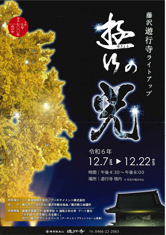 この日は12月8日(日)、朝のNHKのニュースで、藤沢市にある「藤澤 遊行寺(清浄光寺)」では、開山700年を迎える今年、市指定天然記念物「大イチョウ」の見頃に合わせ、境内にて本堂や大イチョウのライトアップを2024年12月7日~22日の期間に実施していると。また、大書院や中廊下では、藤沢市アートスペース「アーティストプラットフォーム」事業として、藤嶺学園藤沢中・高等学校の生徒たちと、湘南工科大学総合デザイン学科中尾研究室が共同制作した作品展示「光を結ぶ、光を掬(すく)う、光を聴く」を実施しているとのことで16時過ぎにバスで向かったのであった。遊行寺で初のライトアップイベント「遊行の光」開催!のポスター。バス停「遊行寺前」で降車し、遊行寺に向かって歩く。「遊行寺橋 (旧 大鋸橋)」から「境川」の下流を見る。ここが旧東海道の道である。前方に見えたのが、「藤沢橋」。「境川」の上流を見る。「遊行寺橋(ゆぎょうじばし)」を渡り振り返る。江戸時代に大名行列が渡ったといわれる橋で、旧東海道が境川を渡るところに架けられていた。擬宝珠のついた赤い欄干のこの橋は、時宗総本山遊行寺の門前の橋である。現在の橋は、昭和35年に造られたPC桁橋である。先に進むと右手にあったのが「藤沢市ふじさわ宿交流館」そして「遊行寺 惣門」前に到着。その両脇には歴史を感じさせる灯籠、その奥には石垣と築地塀も。 境内配置図。大きな寺号標石「時宗 総本山 遊行寺」👈️リンク。清浄光寺(しょうじょうこうじ)は、神奈川県藤沢市にある時宗総本山の寺院。藤沢山無量光院清浄光寺と号す。近世になって遊行寺(ゆぎょうじ)と通称され、明治時代より法主(ほっす)・藤沢上人と遊行上人が同一上人であるために通称の遊行寺の方が知られている。藤沢道場ともいう。「遊行寺 惣門」に近づいて。現在の惣門は、主柱の後に控柱をもつ4本足で、屋根が無く、主柱の上部を横木が貫く大きな黒の冠木門(かぶきもん=門柱にぬきをかけたもの)。これが「遊行寺」の「惣門」。今日では遊行寺の黒門とも呼ばれているのだ。天保 10 年(1839)成稿の「相中留恩記略」挿図や明治初めの境内図では、この門は「惣門」とあって黒門とは書かれません。姿も今とは違い、冠木門に屋根がついた薬医門の形式で、基壇もある。そしてなにより黒く見えません。江戸後期の境内図で、門全体を茶色に塗ったものもあるので、やはり黒くなかったのでしょう。一説に大書院への門(現在は中雀門の隣)がもともとの黒門だともいわれ、確かにどの図でも黒く描かれています。とすればこのころ惣門は「黒門」と呼ばれていなかったのではないか とも。日本三大黒門の一つといわれますが、他の二つがはっきりせず、どうも根拠はないようです。そして、明治 13 年(1880)「清浄光寺境内絵図面明細書目」 (清浄光寺文書)の「総門」の項からは、桁行 3 間 1尺(約 570 ㎝)、梁間 2 間 3 尺(約 450 ㎝)、棟高 1 丈 4 尺(約 420 ㎝)、屋根は銅板葺きで、紀伊藩主徳川治宝が 染筆した「登霊台」の額が掛けられていたとわかります。「藤沢山日鑑」は文政 13 年(1830)5 月 25 日(17 巻) に、この額が届いたと記します と右に「時宗 總本山」と彫り文字に墨入れした大きな木札がかかっている。当本山の正式名称は、「藤沢山 無量光院 清浄光寺(とうたくさん むりょうこういん しょうじょうこうじ)」と号す。近世になって遊行寺と通称され、明治時代より法主・藤沢上人と遊行上人が同一上人であるために通称の「遊行寺」の方が知られているのだ。右側には石垣と築地塀が青く輝いていた。惣門前には、高さ約2m80cmの青銅製の灯籠が対になって建立されていた。青銅製の灯籠(右)。「清淨光寺( しょうじょうこうじ)」と。青銅製の灯籠(左)。そしてライトアップされた「いろは坂」を上って行った。この場所は、桜の並木であるのでピンクにライトアップされていた。美しく輝く球形の竹灯籠。近づいて。60cmほどの球形の竹ボール・竹灯り。さらに進むと前方に黄金の輝きが現れた。そして右手にあったのが「眞徳寺」。寺号標石「赤門 眞徳寺」。朱の山門を正面から。「真徳寺」。この大きな石碑には仏像が線刻されているようであった。再び球形の竹灯籠に近づいて。竹細工に電灯を組み込んだ「竹灯(あか)り」。そして「いろは坂」を更に進むと左手にあったのが「時宗 眞淨院」。寺号標石「時宗 眞淨院」。「いろは坂」を上り終わり大きな「石門」前に到着。この石門は山門跡となる。右の「石門」前には「当山今月(12月)の行事」案内木札が並んでいた。左の「石門」。石門には時宗の「宗紋・「隅切三」(すみきりさん)」が。一遍上人は延応元年(1239)、 伊予(いよ・愛媛県松山市)の豪族である河野家の次男として誕生した。 幼名は松寿丸といい、父は河野七郎通広(こうのしちろうみちひろ) 、祖父は河野四郎通信(みちのぶ )。一遍の俗名は河野時氏といって伊予国の土豪の家系。隅切と呼ばれる、4角形の隅を切り落としたような8角