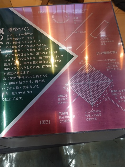 「凧のできるまで1️⃣骨格づくります、1本の真竹か淡竹を割って、平らに削り子骨をつくります。の子骨をそろえて図Aのように間隔を割りふって墨をつけ、のこぎりで切れ目を入れ、図Bのように組みます。この切れ目は、後で麻でしばって固定します。骨格を組む場合は、凧の全体のバランスをとるため、竹の根と先を交互に組みます。次に横骨(子骨)のみに糊をつけて、和紙を貼ります。糊が乾いてから絵・文字などを書き、紅で色をつけて仕上げます。」「凧のできるまで2️⃣糸目つけ凧本体が完成すると、糸目がつけられます。浜松まつりに参加する各町にはそれぞれの指導者がいて、凧合戦の戦略を考え、糸目つけにあたります。糸目の焦点には基準があります。この基準より上に焦点を合わせることを「ノシ」といい、凧はやや下向きに揚がります。また、下に焦点を合わせることを「タチ」といい、凧はやや上向きに揚がります。同大の凧でも焦点によって、尻尾のつけ方も違っています。」「凧合戦その技と用具五月晴れの大空、勇壮に乱舞する大凧------。凧合戦は、糸の摩擦で相手の凧糸を切り、勝敗を競います。空中で凧糸が絡み合うと、合戦が始まります。相手凧に勝つには、糸先(組長)の合図によって行われる転機(滑車)の操作や、この時の強いチームワークがポイントとなり、各町組員の団結力が勝敗の如何を左右します。凧合戦の熱気あふれるムードをさらに盛りあげるのが、高らかに鳴る進軍ラッパです。この音によって、若衆たちの血は一層たぎり、合戦はますます白熱化します。」「凧合戦の基本技術420余年にわたる長い凧揚げの歴史から、各種の凧揚げ技術(わざ)が生み出され、いまに伝えられています。その基本となる技術としては「釣り揚げ」、「のん乗り」、「ちょん掛け」の3つがあります。風向きや風の強さを考えながら、これらの技術をあやつります。」創作和紙人形「凧揚げまつり」。「創作和紙人形「凧揚げまつり」 創作和紙人形 華扇会 寄贈華扇会は、1974年浜松市美術館で第1回華扇会展を開催。その後全日本和紙人形展(東京・大阪)や県立美術館移動展(静岡)に参加するなど活躍。現在はニ代目華扇が指導。なお、当展示品は1998年、ウィーンジャパンフェスティバル展に出品されたものです。華扇会 指導:田畑華扇 制作:大石小扇・大山寿扇・北田芳扇。小松永扇。永田舟扇。宮島」「凧揚げまつり」・「凧合戦」の写真をネットから。再び「大凧展示室」の大凧を見上げる。このあたりは文字一文字の凧が多い。移動して。「浜松まつり」の絵画作品。「「浜松まつり」寄贈 吉永敏子 氏」「大凧展示室」振り返って。ズームして。大凧「幸福」。「「政令指定都市幸福度ランキング」で永年にわたり首位を争っている浜松市を顕彰し、2022年10月「YES !家康プロジェクト浜松」の後援を受け、中田島で揚げられた大凧です。 揮毫 中澤希水」「174ヶ町の凧絵・手拭い 一挙展示中!」と。「凧絵・手拭い」「手拭」。再び「大凧」を。再び「法被」の展示コーナーを。この正規の法被着用者のみが凧揚げに参加できる とのこと。近づいて。手前には凧揚げ合戦の道具を展示。大凧を揚げるために欠かせない道具が「糸枠」👈️リンク。特に糸切り合戦では糸を出したり引いたり、忙しく動き回る為の必須道具と。。「大正時代の【か組】の法被」「大正時代の【か組】の法被故山田有ー氏より寄贈山田氏は、大正14年誕生、翌年の初凧の祝いの時にお父様か着用した法被であり、昭和21年より、この法被を山田氏が着て祭りに参加した。したがって、よく見ると背中が合戦の凧糸で擦り切れて、他の法被から柄合わせし縫い合わせた跡か残っている。」「鍛冶町法被」。「故山田 有一様が所有していた昭和3年御大典昭和天皇即位の年に製作された鍛冶町法被お孫様より浜松まつり会館に寄贈していたたきました」凧の展示コーナーから御殿屋台展示コーナーへ。通路の両脇に参加各町の御殿屋台の写真が並んでいた。「浜松まつり 各町の御殿屋台」。「浜松まつり 各町の御殿屋台」がパネル展示されていた。両側で総計92台?を紹介。中央をズームして(左)。「東田町」の御殿屋台の写真。中央をズームして(右)。「和合町」の御殿屋台の写真。「ご殿屋台の由来夕暮れと共に、祭りの舞台は市内中心部へと移り、ご殿屋台の引き回しが始まります。屋台の歴史は、明治末ごろ、凧揚げ会場へ弁当や湯茶を運んだ大八車に、凧を積んだのが始まりといわれています。大正期になると、造花や提灯を飾りつけた”底抜け屋台”が作られ、昭和4年には彫刻で飾りたてたご殿屋台が登場しました。年々屋台は豪華なものとなり、伝統の祭りは一層華やかさを増して、市民や観光客の目を楽しませています。」明治末頃:荷物を積んだ大八車大正期:底抜け屋台昭和初期:御殿屋台 と進化。「新町ご殿屋台様式・・・二層桃山大唐破風造り彫刻テーマ・・・日本昔ばなし」。正面の「御殿屋台展示」が床