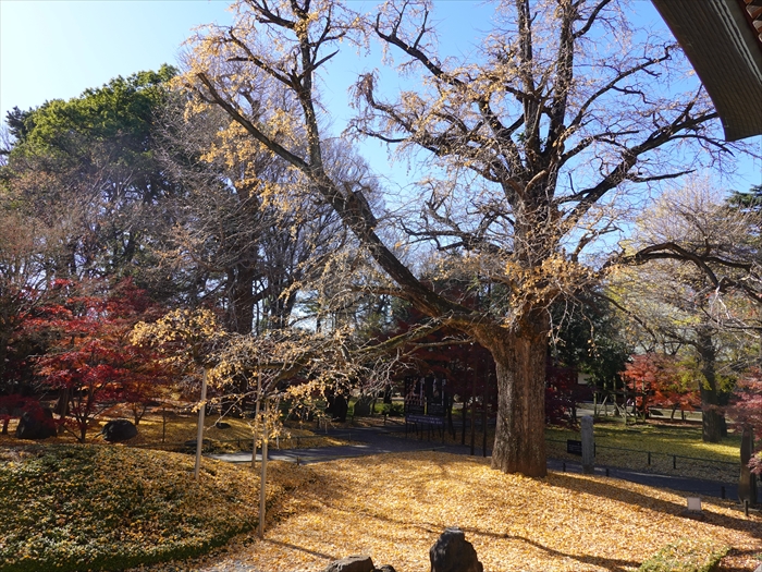「本堂」 の右側の廻り廊下に出て、「天然記念物 九品仏のイチョウ」を見る。晩秋の冷たい風が吹き抜ける中、巨樹のイチョウはついに全ての葉を手放した。つい昨日まで黄金に輝いていた枝々は、今は裸になり、空へ向かって静かに伸びているのであった。地面には無数の葉が降り積もり、まるで陽の光を閉じ込めたかのように、一面が黄金色の絨毯となって枯山水の水面に広がっているのであった。枝先には冬の到来を告げるように微かな寒気が宿り、青く澄んだ空にその影をくっきりと描いていた。静寂の中、木はただ立ち尽くし、来るべき春を待っているのであった。「仁王門」方向を見る。枯山水の庭。白砂の上に描かれる「砂紋(さもん)」と呼ばれる見事な模様。「枯山水」とは日本式庭園のうち、水を用いず石や砂で山水の風景を表現する様式のことを指す。 飛鳥・奈良時代から作庭されてきたものが、室町時代に中国(宋・明)から渡ってきた山水画の影響で、禅宗寺院で抽象的に発展したのだと。ズームして。砂紋には、直線や波線、円、曲線、渦巻きなどさまざまな種類があり、水の流れや波、川や海などを表現しているのだ。どの位の頻度で砂紋を描き直しているのだろうか?再び「本堂」の内陣に戻り、見上げて。大きな梁の上にも、小さな黄金仏・観音様が並んでいた。ズームして。移動して。「九品佛像光背に奉祀される化佛です。ご寄進頂きますと、貴方の名前等が次回修繕(三百年後)に確認されることでしょう」。御本尊「釈迦如来像」を祀る祭壇を再び。「本堂」の左側の紅葉を廻り廊下から。「本堂」を後にして、階段上からイチョウの樹の方向を。再び「三仏堂」の「上品堂」を正面に見る。本堂横の「仏足石」。天保年間(1830~1844)造立の仏足石と。「仏足石大聖釈尊の御入滅後、仏陀礼拝の形式として、その御足に対して、接足作礼(せっそくさらい)により人々は哀心慕情の誠を示した御入滅後およそ六百年、仏像が創まり、それが広範におこなわれるまでの永い年月、仏足石礼拝は重く用いられたのである。当山の仏足石の中央に千福輪相(法輪)が刻されているが、磨滅している。天保年間のもので、近年その土台を補修した。 ※浄眞寺「縁起」本堂札所にあります(有料)」植松壽樹(ひさき)歌碑。「掃きよせて 落葉焚く間も 銀杏の樹 やまずしこぼす 黄なるその葉を 壽樹」大正昭和期の歌人。歌誌『沃野(よくや)』を創刊・主宰した。墓所はここ浄真寺。裏面には、短歌一首が冒頭に。『雷鳥は いろ(色)まぎらはし 指さして をし(教)ふる方(かた)に さ霧のうごく 壽樹』歌碑銘植松壽樹 明治二十三年二月十六日東京四谷に生れ長じて慶應義塾大学理財科を卒業実業界に入り 後に芝中学校(現芝学園)に職を転じ 爾来歿するまで教職にたずさわる 歿年 昭和三十九年三月二十六日明治三十八年窪田空穂の十月会に参加 若くしてすでに歌人としての風格を備え 大正三年「国民文学」創刊と同時に参画したが 昭和二十一年自ら「沃野」を創刊し主催する 著書のうち 歌集には碑面の一首を含む「庭燎」(大正十年八月)を始め 「光化門」「枯山水」「渦若葉」「白玉の木」など 研究には「近世万葉調短歌集成」其他 近世歌人の研究書数冊がある また能書家であった父千春に学び 若きより壽樹もまた書をよくした ここに頭刻の一首をのこして永くとどめることとする 碑面の一首は「庭燎」所収のもので 当時好んでこの地を逍遥した折の所産である 昭和四十五年六月吉日 植松壽樹歌碑建設委員会 編」と。上記の植松壽樹氏の歌は、以前に同じ内容のブログをアップ時に我が学友が地元の市民図書館から、「植松壽樹全歌集」の本をレンタルして、第四歌集「渦若葉」所収の歌であることを、見つけて下さいました。彼女の調査力に今日も驚愕、敬意、感謝です。【雷鳥は、その色が周囲と紛れて見分けにくい。そこで、指さして教えようとするが、その方角に霧が動いていく。】と。雷鳥の保護色と霧の動きが織りなす幻想的な風景が、簡潔な言葉で見事に表現された歌なのであった。枯山水の庭を再び。手前は、イチョウの落葉が水の流れや波の姿を隠して。白砂の上に描かれる「砂紋(さもん)」をズームして。静寂な寺の庭に広がる枯山水の砂紋。丁寧に引かれた白砂の波が、流れる水のように揺らめくのであった。そこに一枚、黄金色のイチョウの葉がそっと舞い降りる。砂紋の流れに寄り添うように、葉の影が淡く滲み、ひとひらの光が宿るように鮮やかに映えるのであった。風がそっと葉を揺らせば、砂の上にわずかな跡を残し、やがてまた、静けさが庭を包み込んでゆくのであった。いつまでも佇んでいたい時間と空間!!「都天然記念物 九品仏のイチョウ」。見上げて。「仁王門」に向かって進む。「本堂」を「イチョウと枯山水」越しに。「本堂」の南側を見る。前方に「仁王門」。「仁王門」を額縁にズームして。「仁王門」に近づいて。「仁王門」裏の風神像。雷神像。「仁王門」下から「