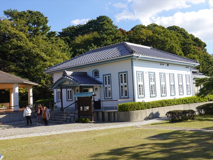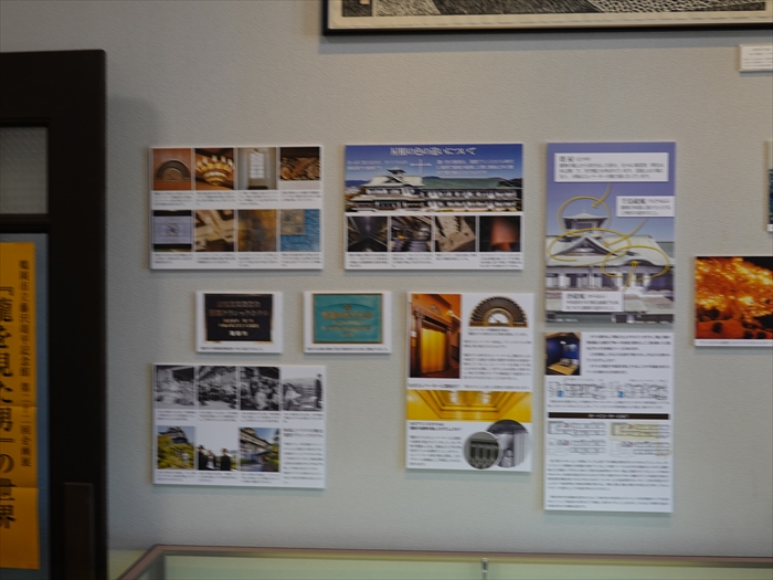 そして「蒲郡クラシックホテル」の展示コーナーへ。「蒲郡クラシックホテル」の建物の内部装飾の案内。左にエレベーターの階数表示、その隣に1階宴会場「桜の間」にあるシャンデリア と。「塔屋(とうや)建物の屋上から突き出した部分。元々は展望室(現在は非公開)で、天守閣とも呼ばれています。図面上は5階になり、4階はエレベーターの動力室になっています。」「千鳥破風(ちどりはふ)屋根の斜面に設けた小さな三角形の造形のこと。」「唐破風(からはふ)中央部を弓の様な曲線で丸味をつけた屋根の造形のこと。」「ホテル館内は、洋風に仕上げられていますが、2階と3階の階段協には館内て唯一の和風の箘所として、畳を敷いた2畳ほどの小さな和風スペースがあります。この空問は、どのような目的で設けられ、どのように使われていたのてしようか?ホテルの歴史や意図を感じさせる、この不思議な和のスペースの使われ方を探ります。」「ボーイコーターとは?長い間「コーター」という言葉については、調べても明確な意味が見つかリませんでした。しかし、古いパンフレット(英語版・日本語版)を調べていると、この畳のスペースには文字の記載はないものの、通路を挟んだ小部屋(ピンク色で示した部分)に(BOYS QUARTER)や「ボーイ室」と記載されていました。※この部屋は現在存在しません。日本語の表記が右から左なので恐らく戦前のものであり、掲載されている地図の内容から昭和初期(開業当時)のものと考えられます。「コーター」は「QUARTER(クォーター)」の昔の発音なのでしょうか?「QUARTER」の意味を辞書で調べると、「場所、宿舎、部屋、部署、持ち場」などがあり、これにより「ボーイの詰所」としての用途が明らかになりました。昭和30年代の従業員の証言などには、「火鉢があり待合室のようだった」「女性従業員がここでお出迎えをしていた」「客室係がお茶を点てて到着した客をもてなした」とあります。これらはこの場所の過去の利用状況を示す貴重な証言です。」「屋根の色の違いについて左:白っぽく見える方が、オリジナルの銅板葺きの屋根です。右:濃い色の屋根は、蒲郡プリンスホテル時代に竜巻で屋根が破損した際に銅板以外の建材で 葺き替えられたものです。下部に屋根裏の建築構造写真。「景観重要建造物蒲郡クラシックホテル指定番号 第1号令和4年2月25日指定蒲郡市」「登録有形文化財第23-0668-0571号この建物は貴重な国民的財産です文化庁」。「工レベーターの階数表示板は蒲郡ホテル時代からの物を使用しています。現在のエレベーター本体は、プリンスホテルの開業時に取り替えられたものです。蒲郡ホテル時代のエレベーターは、運転手による手動式で、蛇腹方式扉の開閉や昇降を従業員が操作していました。エレベーターを正確にその階に止めるのは難しく、地下に止める際に失敗すると4階(天守閣のすぐ下の機械室)の電源を入れ直さなければならないこともありました。なぜエレベーターに雷紋が?現在のカゴ上部には雷紋の装飾があります。なせプリンスホテルは雷紋の装飾を施したのでしようか?蒲郡ホテルのエレベーターには雷紋の装飾が施されていました。古い写真や調査によると、雷紋はカゴ内の換気用グリルの装飾でした。おそらく、エレベーターる取り換える際に、元のデザインを模様として再現したものと思われます。」「映画とドラマの舞台 蒲郡クラシックホテル「蒲郡ホテル※現蒲郡クラシックホテル」は、戦前から現代まで多くの映画やテレビドラマのロケ地として使用されています。壮麗な建築と歴史ある風景が多くの作品で登場し、その魅力を伝えています。映画やドラマに登場するスポットを巡り、特別な時問をお楽しみください。」「子安弘法大師抱いている子どもは七代 滝富夫氏がモデル。」と。「蒲郡開発の祖 藤原俊成」のコーナー。「藤原俊成卿銅像と歌碑竹島の対岸・俊成苑内には、平成3年に建立された藤原俊成卿銅像がある。高さ2.8メートル、プロンズ製、文化勲章受章者・富永直樹氏の制作による。台座の「藤原俊成卿御詠」銘板は、冷泉布美子氏の筆による。岩間もる 玉かげの井の すゝしきに 千歳の秋を 松風のふく世の中よ 道こそなけれ思ひ入る 山のおくにも 鹿ぞなくなるどちらも『長秋詠藻』からとられた歌で、前者は俊成が52歳の時に大嘗会を寿いで詠んだ歌、後者は俊成の子・定家が編さんした「小倉百人一首」にも撰ばれている。このほか、市内には俊成の歌碑が2基ある。「ものあはれ」歌碑(平成5年建立) 八百富神社遥拝所玉垣内側何となく ものあはれにも みゆるかな 霞や旅の こゝろなるらむ 俊成のうた「浦つたふ」歌碑(平成11年建立)特別養護老人ホーム形原眺海園浦ったふ 磯の苫屋のかち枕 聞もならはぬ 波の音かな」先程訪ねた「藤原俊成卿像」。「藤原俊成と竹島『三河国名所図会』の「竹島弁天社」の項目には、昔俊成が江州(ごうしゅう・滋賀県)竹生島の竹を移植したから竹島という、と記されてい