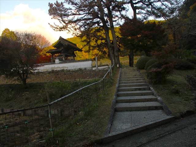 そして石段の上左に「高月院」の「山門」が見えて来た。「高月院」にはこの門の下まで車で来ることができるのであったが。「国指定史跡 松平氏遺跡 高月院 平成8年3月 豊田市」と石碑には。1641年、家光公より寄進された「総門」・「将軍門」と。「法然上人三河二十五霊場 第一番 高月院」碑。山号を本松山、院号を高月院、寺号を寂静寺(じゃくじょうじ)と称する知恩院末寺で、本尊として阿弥陀如来を祀る寺。門の正面右側には「愛知高原国定公園高月院愛知県知事 桑原幹根書」と。「高月院 (こうげついん)高月院は貞治六年(一三六七年)の創建で、徳川氏の始祖、松平家の菩提寺です。慶長七年(一六〇二年)寺領、一○○石を徳川家康より下賜され、以後幕末に至るまで厚遇されました。境内は、国指定史跡「松平氏史跡」になっており、初代親氏(ちかうじ)、二代泰親(やすちか)、四代親忠(ちかただ)夫人の墓所があります。 」扉のない「高麗門」形式の「総門」・「将軍門」の扁額は「高月院」と。参道を「山門」に向かって進む。元の名を「寂静寺」といい、見誉霓立上人が建立したといわれています。1377年に親氏が本尊阿弥陀仏を寄進、堂・塔を建立してから「高月院」と改め、松平氏の菩提寺となっています。境内には、松平家墓所があり、親氏、泰親、親忠夫人の墓が並んでいます。山門や本堂は1641年に徳川家光の命によって建立されたと伝えられています と頂いたパンフレットから。正面に新装なった「山門」が現れた。「参道」の左側を見る。「下乗」碑。境内への馬や籠での乗り入れ禁止と。神聖なる境内への立ち入りを禁じたのだろう。祠の中には「本松山三十三観音」が。手前には「百度石」と刻まれた石柱もあった。今から150年前に火事により失明された方が仏さまに願をかけ、ここより誰にも知られないように百度お参りした。願いが叶い目が見えるようになったお礼の意味を込めてこの百度石を建立したのだと。ここから本堂へは中門の石段を経て結構な距離があり、それを百度ということ。近づいて。中央上段に阿弥陀如来仏が鎮座。さらに。「延命十句観音経觀世音 南無佛 與仏有因(かんぜおん なむぶつ よぶつういん)與仏有縁 佛法僧縁 常楽我浄(よぶつうえん ぶっぽうそうえん じょうらくがじょう)朝念觀世音 暮念觀世音。(ちょうねんかんぜおん ぼねんかんぜおん)念念従心起 念念不離心(ねんねんじゅうしんき ねんねんふりしん)」手をあわせてこの延命十句観音経三回念じて下さい。 山主」意味は『観世音菩薩に帰依します。我々は仏と因縁でつながっています。三宝の縁によって、「常楽我浄」を悟ります。朝にも夕べにも観世音菩薩を念じます。観世音菩薩を念じる想いは我々の心より起こり、また観世音菩薩を念じ続けて心を離れません。』とその先に「手水舎」。「山門」下にあったのが「仏足石」と「石仏」。「佛足跡」。「仏足石お釈迦様の足跡です。インドにおける仏足石は、お釈迦の代理を意味し、そこで説法されたことを示します。仏足石はお釈迦さまの遊行転法論を表し、足裏に描かれている図を千輻輪相といいます。仏法石のお守りをお授けします。石段を上がって右、朱印所までお越しください。」足裏に描かれている千輻輪相図をズームして。足の裏にはいろいろな紋様が描かれているが、興味深いのは魚がいる! 釈迦の足の指と指の間には水かきのようなものがあったらしい と。観音様。「山門」の右横の「シダレザクラ」を見る。「名木指定 第71号 バラ科シダレザクラ 胸回り 1.70m 根回り 4.00m 樹 高 8.0m 豊田市」春になると。ネットから。徳川家康のルーツに当たる松平家の菩提(ぼだい)寺として知られる豊田市松平町の高月院で、山門が86年ぶりに建て替えられた。費用の約2千万円は全額、観光などで訪れた参拝客や地元関係者の寄付という。2024年10月27日に門の開通式が開かれた と。「本堂」側から。山門は何度か建て替えられたとみられるが、これまでの1938年建築の山門は、高さ約5m、幅3mほどの木造。立派な切り妻屋根が特徴だった と。小形で単層の四脚門で、両側に土塀を巡らせながら本堂の正面に南面して建つ。様式からみて18世紀前半の建立と推測される。切妻造・桟瓦葺の屋根、二軒(ふたのき)本繁垂木(ほんしげたるき)の軒、蔐懸魚(かぶらげきょ)を吊った破風の拝みを持つ。「開通式」の写真はネットから。そして「高月院」の「本堂」。折しも夕日が本堂に射し込んで。本堂は、1641 年に徳川家光によって建てられたものと言われている と。寺域の中央に南面して建つ比較的大型の堂で、桁行実長9間(約16.4メートル)、梁間実長7間(約12.7メートル)、入母屋造、桟瓦葺で、正面には実長1.5間(約2.7メートル)の向拝と木階四級を付し、庫裏との通路を除いて正面と両側面の三方に濡縁が回る。間取りは堂前半に35畳敷の外陣、後方中央には間口・奥行き共に実長3間の内陣、その両脇に間口実長2間の脇の間が配され、周囲に切目貼の広縁がまわる