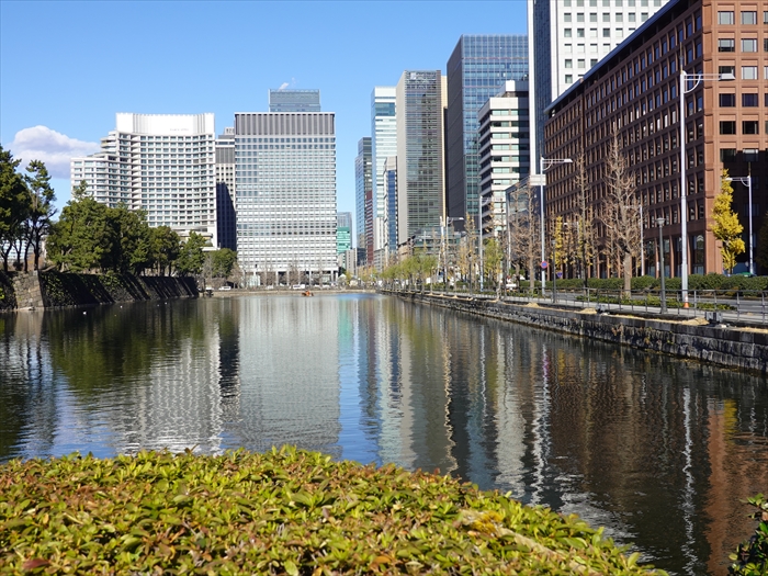 「馬場先門」交差点を渡り、「和田倉橋(わだくらばし)」の上から「和田倉濠」方向を見る。正面左側の建物が「パレスホテル東京」。右手にあったのが「和田倉濠」の石垣。久々に見たくっきりとした影絵。こちらの石垣は、石同士がピッタリあうよう目地無しで接合面が加工され「切込接(きりこみはぎ)」で横の目地(継ぎ目)を通す「布積」で積まれていた。そこに反り出した松の枝と葉が影絵となってくっきりと。ここまでくっきりとした影絵が出来るのも、1日のうち日の光が当たる決められた時間のみ。都道406号線を渡り、反対側に「特別史跡 江戸城跡」案内板。「特別史跡 江戸城跡江戸城は長禄元年(一四五七)に太田道灌によって創築されたが、天正十八年(一五九〇)に北条氏が滅亡し、徳川家康が居城をここに定めた。以来、家康、秀忠、家光の三代にわたって西の丸、北の丸の増設や外郭に整備が行われ江戸城の総構が完成した。明治維新後江戸城は皇居となり、昭和二四年に西の丸下及び現在の皇居を取りまくお濠の地域が「国民公園皇居外苑」として一般に開放され、昭和四四年からは北の丸地域が加えられ広く国民に親しまれている。この江戸城跡は、三百年近くにわたる将軍の居所として、また政治の中心としての史的価値が極めて大きく、その規模はわが国随一のものであることから、昭和三八年五月三〇日に文化財保護法による「特別史跡」に指定された。 環境省皇居外苑管理事務所」再び戻り、「正門石橋」方向に向かって進む。「皇居外苑」。美しく管理された松の植栽が拡がっていた。「都道301号線・内堀通り」の「二重橋前」交差点を渡る。「二重橋前」と。前方に皇居内の濠の上に「伏見櫓」の姿が確認できた。横断歩道を渡る。前方左手が「牧野家上屋敷跡」。正面に「丸の内警察署 祝田町見張所」。近づいて。「特別史跡江戸城跡指定 昭和三十八年五月三十日正門と二重橋」案内板。「正門と二重橋ここは、皇居の正門に当たります。手前に見える橋が「正門石橋」、奥の橋が「正門鉄橋」です。後方に、現存する数少ない江戸城の櫓の一つである伏見櫓が見え、その右手には、樹木に隠れて見えませんが、宮殿があります。正門鉄橋は、かつては木橋で、その下に橋桁を支えるもう一つの橋があったため、二重に架けられた橋という意味で「二重橋」と呼ばれます。しかし、正門石橋と正門鉄橋の二つの橋を総称して、二重橋と呼ぶ人も少なくありません。これらの橋は、天皇陛下が国会開会式などのため外出される際や、外国の君主、大統領、大使来訪などの特別な場合のみ使用されますが、新年や天皇誕生日の一般参賀では一般の方々も渡ることができます。正門石橋と正門鉄橋が重なり、その奥に伏見櫓が見える皇居外苑からの眺めは皇居を象徴する景色として親しまれています。」「明治時代初期の二重橋「伏見櫓と西の丸御所院門」都立中央図書館特別文庫室所蔵」。「二重橋」の手前に架かる「正門石橋(西の丸大手橋)」。明治22年(1889)明治新宮殿の造営に伴って木製の西丸大手橋は、久米民之助の設計で皇居正門石橋に架け替えられ、高麗門を取り外し渡櫓門のみとなった。寛永元年(1624)に西丸大手橋が架橋されたときの擬宝珠が平川橋の欄干に移設され現存している。岡山産の大島花崗岩で造られ、橋長は35.3m、幅員は12.8m。俗称として「眼鏡橋」とも呼ばれていますこの「正門石橋」が「二重橋」だと誤認されることがあるが、厳密には奥にある正門鉄橋が「二重橋」であるのだ。花崗岩で造られた「正門大橋」の先に見えるのが「伏見櫓」。「正門大橋」と「伏見櫓」。「正門大橋」を渡った、左の門が「正門」。ズームして。ネットから「正門大橋」の先の「二重橋(にじゅうばし)」の写真を。皇居のこの「二重橋」と呼ばれる橋の正式名称は「正門鉄橋」。「二重橋」と呼ばれる理由は、もともとこの場所には二重構造の橋があったからです。由来江戸時代、この場所には木造の橋が架かっていましたが、石垣との高さの関係で一度下に橋を渡し、その上にもう一つ橋を架ける「二重構造」の橋(木造の「二重橋」)になっていました。このため、「二重橋」と呼ばれるようになりました。明治時代になって木造の橋は撤去され、現在の鉄橋(正門鉄橋)が架けられました。しかし、古くからの呼び名が残り、現在でも「二重橋」として親しまれています。実際の二重橋との誤解実は、現在の皇居にある橋で「二重橋」と呼ばれるのは、正門鉄橋と、その手前にある「正門石橋(眼鏡橋)」の2つがあります。本来の「二重橋」という名称は、奥の鉄橋(正門鉄橋)を指しますが、手前の石橋(正門石橋)を含めて「二重橋」と呼ぶ人も多いです。そのため、写真などでは手前の石橋が「二重橋」と紹介されることがありますが、厳密には奥の橋が元々の「二重橋」です。現在の橋は昭和39年に架け替えられたのですが、無論、江戸時代は木でできた橋でした。鉄橋であれば強度は十分に保て