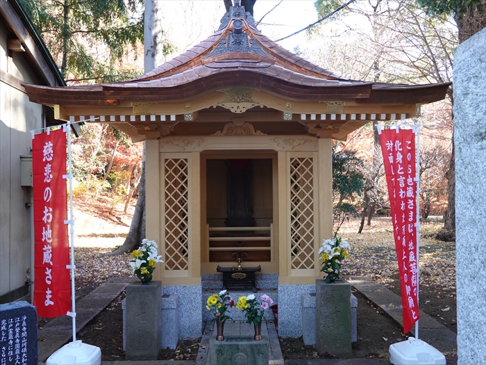 「三仏堂」を後にしてその奥の墓地の中にある「開山歴代上人御廟」に向かって「中品堂」の先へ進む。角右手には再建なった「地蔵堂」が建っていた。「浄眞寺開山珂碩大和尚は 元和四年(一六一八 )武蔵の国に生まれ 十二歳で江戸覺眞寺圓嚴上人につき 薙髪し下総生実の大厳寺で珂山上人に師事のち江戸霊厳寺に住し 宿願とした丈六の九躰阿弥陀佛像と釈迦像一躰ぼ造立を完成した さらに延宝六年(一六七八)に奥澤の地に浄眞寺を開き住すること十六年 里民に医療を施し珂碩佛と称され元禄七年(一六九四)十月七日七十七歳で示寂什寶物「九品山縁起」に詳述される如く 上人は地蔵菩薩の化身として地蔵因位の本地の姿を顕すること数度に及べりと伝えられる これに因みいつの歴代か不明なるも 今時平成令和の阿弥陀佛大修大勧進事業に併せ 新築の地蔵堂を 発眼し本日ここにその落成慶讃の法会を勤修せんとす願わくば無辺身菩薩 威光を倍加し照臨して化導の源泉を示し人皆利楽せしめんことを 維新 令和七年春 十七世 信譽英碩」「このお地蔵さまは、地蔵菩薩の化身と言われた珂碩上人の御廟と対面しております。」と。「地蔵菩薩」像。これが、以前の建物の写真であるが。「開山歴代上人御廟」の案内に従って進む。「淨眞寺境内墓地 檀家使用区画見取図」。「開山歴代上人御廟」への参道を進む。突き当りの左側にあった石碑・石仏。中央の石仏の左側には歌が刻まれているようであったが・・・。石仏には「延宝丁巳(5)年(1677)ニ月四日 浄譽一廟?元水居士」と。下部には多くの戒名が刻まれていた。「見る(累)からに(而) あ(阿)は?れ◯かし 吾は(八) ◯つき(幾)◯◯◯いつこの(能) 人も? ◯◯◯◯◯」と。「本堂石墻(せきしょう・塀)建立供養塔」(左)、「寄付 本堂永代疊替資料」碑。正面に「開山廟」・「開山珂碩大和尚」墓地。「開山珂碩大和尚第参百年遠忌追恩寶塔」。「延命地蔵尊」であろう。「延命經日 一者女人泰産」と刻まれた石仏。女人泰産とは、女性がやすらかなお産が出来ること。「先祖代々一切精靈 清智院大譽浄倫超運居士 大智院觀譽照妙壽善女」と。「南無阿弥陀佛」碑。横には「文化十酉年七月二十日」と。左側には墓地が広がる。「開山廟」・「開山珂碩大和尚」墓石。ここにも「南無阿弥陀佛」碑。「開山廟」・「開山珂碩大和尚」墓地の右側には歴代住職の墓石・無縫塔が並ぶ。こちらの無縫塔墓石は?どなたの?こちらの無縫塔墓石は比較的新しかったが。墓誌碑には「中興十五世、中興十六世」 と。現在の上人は、十七世 信譽英碩氏。北側の広大な墓地を望む。ネットには「浄真寺の裏手にはかなり広い墓所があります。墓所なので当然のことですが檀家および墓参の人以外の入場を禁ずる、という注意書きが掲げられています。この墓所には、第1回芥川賞の受賞作家である石川達三のお墓、山本五十六の2つ前の聯合艦隊司令長官である永野修身のお墓、そして東急グループの創出者である五島家の墓所があります。墓所に入ってすぐ右手に手桶所があるので、そこで手桶を借り水を汲み、石川達三、永野修身、五島家のお墓にお参りをしてきました。」と。上記のそれぞれの墓所がこの場所かは不明であるが。そして、「開山廟」・「開山珂碩大和尚」墓地の前から新装なった「地蔵堂」を再び見る。引き換えして再び「三仏堂」の前の参道へ。「本堂・龍護殿」に向かって進む。角にあったのが「河口慧海👈️リンク師碑」。「我国最初のヒマラヤ踏破者 日本西蔵学の始祖 在家仏教の首唱者雪山道人河口慧海師は慶応二年堺市に生る 十五歳釈迦伝に感激精進に入り哲 学館に学ぶ 廿五歳得度 仏典の正解は原典乃至西蔵訳によるに如かずと悟り 渡印入蔵を志し明治卅三年単身ヒマラヤの嶮を越え秘境西蔵に入る セラ大学 に学び傍ら医療を施す為に声名高く法王の知遇を受く 帰国に際し西蔵蔵経を 将来す 後再び入蔵梵蔵両蔵経並に仏像仏具博物標本等多数を携えて大正四年 帰朝 爾後諸大学に西蔵学を講ず 神足其許に集る師持戒堅固肉食妻帯を退け 在家仏教の宣揚に努む 信者其門に参ず 梵蔵仏典の和訳西蔵文典西蔵旅行記 等の著あり 昭和十五年将来蔵経を東洋文庫に寄贈し蔵和辞典編纂会を起す業 半ば戦禍国中に及ぶ 廿年二月廿四日円寂寿八十昭和三十二年二月二十四日 文学博士 椎尾弁匡撰 日本芸術院会員 桂月松林篤書」塔身部237×136×22cm、真鶴の石とのこと。「本堂・龍護殿」北側の見事な紅葉を移動しながら。「和」と刻まれた球状の石碑。「平和の塔(へいわのとう)」であると。台座には「經日 超世無倫」と刻まれていた。「經日」とは一日、また一日と時がたつこと、「超世無倫」とは世に比べるものがないこと。昭和四十年(1965)建立と。「本堂」の北側の林の中にも石仏や庭石が並んでいた。ズームして。奥には建物の姿も。奥にも御堂・「五社殿」の姿も見えた。大正2年に建造された奥沢神社の前代の本殿も五社殿として浄真寺に移築されているが、覆屋内に
