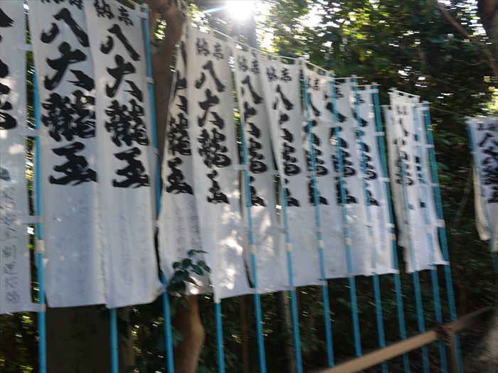 「竹島」島内に入り、「八百富神社」の参道を進む。「奉納 八百富神社」と書かれた幟旗が参道の、奉納者、金額が刻まれた玉垣前に並ぶ。二?の鳥居。狛犬(右)。狛犬(左)。さらに石段を上る。石段横の斜面には「蒲郡の名木50選31 八百富神社社叢 蒲郡市教育委員会」と。左手に「手水舎」、右手に「休憩所」、そして正面奥には「宇賀神社」が見えて来た。左手には「手水舎」「水盤」に近づいて。「水盤」には「浄水」と刻まれていた。「水吐龍」。さらにズームして。「国指定天然記念物八百富神社社叢竹島は、対岸から約四百メートルの海上に浮かぶ面積約一・九ヘクタールの小島である。基盤は花崗岩質で、表土は浅く、海岸は岩盤が露出して断崖をなしている島全体が八百富神社の境内であり、対岸とまったく異なる植物相が自然植生の状態で群生しており、東海地方では他に見られない代表的な暖帯林である昭和ニ十八年七月からのニ十数回の調査によってシダ植物、裸子植物、双子植物、単子葉植物等合計二百三十八種の高等植物が自生していることが判明している植物分布上特に注目すべきものに「キノクニスゲ」「カゴノキ」「サカキカズラ」などがある 昭和五年八月ニ十五日 指定 蒲郡市教育委員会」「宇賀神社」に詣る岡崎の旅友。扁額「宇賀神社」。「宇賀神社祭神 宇賀御魂神 商売繁昌の神」。「宇賀神社」の内陣。御祭神:宇迦之御魂神宇迦之御魂神は穀物の神様であり、『宇賀神王略縁起』には寿永三年から建久四年(1184~1193)当地方の三河守であった源範頼公が深く信仰した神霊と記されています。海嘯により流されてしまい一時期は郡内国府村(現在の豊川市国府町)で祀られていましたが、享保十年(1725)に国府村の住人と竹島の神主が同時に「竹島に帰りたい」という霊夢を見たことにより竹島にお還り頂くことになりました。この出来事が元となって現在でも国府村の人々の崇敬は続いています と。海嘯(かいしょう)とは、満潮時に河口に潮波が押し寄せてくる現象 と。そして「宇賀神社」の右奥にあったのが「宝物殿」👈️リンク。そして向かい合う「大黒神社(だいこくじんじゃ)」。こちらは商売繁盛や経営の神様 と。正面から。扁額「大黒神社」。「大黒神社」の内陣。御祭神: 大国主神大国主神は国土を平定し、土地を開拓し、庶民に農耕の道を教え、医薬や禁厭(まじない)の法を授けるなど、国土経営にお尽くしされた多くの功績と多様な御神徳をお持ちの神様です。また七福神の一柱である大黒天と習合し、福の神としても一般衆庶に広く仰がれております。当社においては『竹島参詣滑稽鄙栗毛』に神社名を見ることはできるものの、創建が何時の世であったのかは詳らかではありません と。そして正面に「八百富神社」の社殿。右手に「授与所」。窓口に近づいて。「大黒神社」の右隣、神馬の像の横にあったのが「千歳神社(ちとせじんじゃ)」「御祭神 藤原俊成卿 千歳神社」。「千歳神社 祭神 藤原俊成 長寿芸能の神」。「千歳神社」の社殿。藤原俊成(しゅんぜい)は権中納言藤原俊忠の子として永久二年(1114)に御誕生されました。和歌に秀でられ『千載和歌集』を撰じ、歌聖と呼ばれた藤原定家(ていか)の御父上にあたります。元久元年(1204)九十一歳で薨ぜられ、当時としては大変な長命でした。久安元年から同五年(1145~1149)当地方の三河守として竹谷蒲形の両庄の開発の任にあたられた際、風光明媚にして竹生島を髣髴とさせるこの竹島に、江州竹生島より弁財天を勧請されたことが八百富神社の起こりになります と。歌人である佐佐木信綱が、歌人藤原俊成ゆかりの竹島を訪れて詠んた歌碑が、藤原俊成卿が祀られる「千歳神社」の鳥居の左横にあった。佐佐木信綱 は明治5年 三重生~昭和38年没 91歳。明治から昭和期を代表する歌人で文学博士(国文学者)。その横に「カゴノキ」案内板。「歌人の 国の司の みたまこもり 千歳さかゆる これの竹島」『歌を詠む私が、地方を治める国司として、この竹島の神々の霊を大切に守り、その加護のもとで、この地が千年もの長きにわたって栄えるように祈ります。』の意と。「カゴノキ」は茨城県及び石川県以西の暖地に分布するクスノキの仲間。鹿の子供のような模様の幹を持つため「鹿子の木(かごのき)」と呼ばれると。歌碑の手前に「神馬」。「神馬」の後ろから「五重石塔」を見る。そしてこちらが「八百富神社」。「八百富神社(通俗 竹島弁天)」案内板と「八百富神社ご祈祷ご案内一、商売繁盛 一、学業成就 一、病気平癒一、初宮参り 一、家内安全 一、開運厄除一、縁結び 一、安産 一、交通安全 ご祈願受付中車輌ご祈願についてお知らせ以下・・・ 略 八百富神社」。「八百富神社(通俗 竹島弁天)祭神 市杵島姫命(いちきしまひめのみこと) 開運の神 縁結び安産の神」扁額「八百富神社」。狛犬(右)と豊臣秀吉の家紋「五七の桐」が画かれた提灯(右)。本殿の右手、狛犬の後ろにあったのが「元竹(もとだけ」。これは八百富神