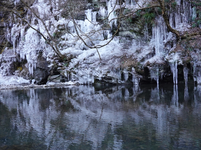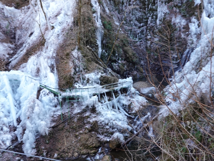 そして「尾ノ内渓谷駐車場」に車を駐める。「尾ノ内渓谷氷柱入口」案内。「尾ノ内渓谷氷柱」に向かって進む。2024年の「尾ノ内渓谷氷柱」ポスター。この場所から8kmほど手前の「小鹿野市街地」の「西秩父料飲店組合」の店舗案内図。「尾ノ内渓谷」案内図。尾ノ内(おのうち)渓谷は、日本百名山のひとつ「両神山」をその源流とする尾ノ内沢が深い谷を形成した渓谷です。手つかずの自然が残る尾ノ内渓谷は、一番滝・油滝に代表される大小の滝が数多く見られ、まさにマイナスイオンの宝庫です。沢登りファンの隠れたスポットとなっておりましたが、近年、自然を満喫できる癒しのトレッキングコースとしても注目されております。ここは、奥地に原生林を残す大自然の真っ只中です。どうぞ十分な準備と細心の注意をもって尾ノ内渓谷をお楽しみください。尾ノ内百景氷柱尾ノ内渓谷に人工的につくられる氷柱。吊り橋からの眺めは圧巻です。氷柱の開催期間は1月初旬から2月下旬。期間中の週末には夜間ライトアップも行います(詳細は要問合)。入場券売場にて500円を支払って入場。「子鹿野町河原沢の冷っけぇ~スポット 尾ノ内氷柱 入口」イメージキャラクター「つららん」の姿も横断幕に。「2025年 雑記帳」。ご自由にお書きください。 と。「尾ノ内氷柱」への通路にあった小鹿野高校の生徒さんが制作した作品ライトアップされると美しく輝く竹あかり。「注意 熊出没」と。売店で使用する水タンクであったか?そして眼の前に氷柱が現れた。大きな氷柱(つらら)!!。ここは「尾ノ内氷柱(おのうちひょうちゅう)」。モンスターの如き氷柱。この枝には、氷柱(つらら)が白き流れの如くに。ズームして。吊橋をズームして。この「尾ノ内氷柱」のライトアップは見学しなかったの、ネットからライトアップの写真を。振り返って。「尾ノ内渓谷マイクロ水力発電所」案内板。「発電所諸元位置:埼玉県秩父郡小鹿野町河原沢定格出力: 317W (TRG40)使用水量: 1OL/s有効落差:7.85m運用開始:2021年1月30日事業名:尾ノ内渓谷マイクロ水力発電事業施設管理者:尾ノ内渓谷氷柱実行委員会設計・施工: 篠田株式会社 株式会社グリーン設備」尾ノ内渓谷に町で初めてとなる小水力発電所を設置。沢の水を使用して発電し、発電量は約300ワット。1月上旬から2月中旬の厳冬期には、斜面に水を吹きかけ、氷柱を作る。吊り橋から眺める斜面に氷柱が広がる光景は幻想的。その規模は周囲約250m 高さ60mにも及び、小鹿野を代表する冬の観光スポット と。吊橋の前には小さな木製社を安置。近づいて。前方に吊橋が現れた。吊橋前から氷柱をズームして。見事に整列するが如き氷柱(つらら)。こちらは丸くなった氷柱(ひょうちゅう)。吊橋を正面から。吊橋を渡る。吊り橋が高く、揺れた。ちょっとスリル!!。手摺に捕まりながらおそるおそる渡る旅友の姿が前方に。吊橋の長さは30m前後であっただろうか。吊橋上から氷柱をカメラで追う。両神山を源流とした尾ノ内沢から、500mもパイプを引いて人工的に作った氷柱。その規模は周囲約250m、高さ60mにも及び、今や小鹿野を代表する冬の観光スポット。下方前方に小さな滝が凍らずに流れていた。こちらの流れは凍結。ズームして。凍らずに頑張る流れをズームして。渡って来た吊橋の入口方向をズームして。下方に、以前は歩けた場所も、全面凍結して。氷柱(つらら)の姿を追う。「つらら」の語源は「つらつら」からと。・古くは氷など表面がつるつるし光沢のあるものを「つらつら」と呼んでいた・氷が下に向かって垂れる様子から「垂氷(たるひ)」と呼ばれていた・連なって並んでいるということから「連連(つらつら)」に転じ「氷柱(つらら)」になった と。吊橋にはライトアップの発光ランプも。ネットも氷結して。様々な場所をズームして氷柱の姿を。吊橋に人の姿がない時にシャッターを。 ・・・もどる・・・ ・・・つづく・・・