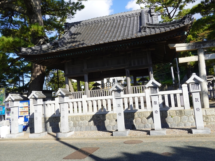 「八百富神社 篠津遥拝所」を海側から見る。八百富神社の創建は養和元年(1181)には藤原俊成が、竹生島から市杵島比売命(弁財天)の分霊を勧請したのが始まりと伝えられています。遥拝所の創建は不詳ですが八百富神社が浜辺から約400m先の竹島に鎮座していたことから、当時、一般的に参拝に訪れのは困難とされ対岸で竹島の参道の対面に当たる篠津に遥拝施設が必要になったと思われます。宝永2年(1705)に旱魃による大飢饉が発生すると当時の領主松平義尭が雨乞い祈願を篠津遥拝所で行い、見事念願成就したことから和歌の奉納と元文3年(1738)には石鳥居を寄進し、その後、松平守惇は遥拝所の造営を行っています。建物は屋根と柱と遥拝所のみの構成で壁が無い為、正面に竹島を望む事が出来ます と。右側には石鳥居、扁額には「八百富神社」と。境内のクロマツが生い茂る下に各種の「案内板」が並んでいた。左から「八百富神社由緒略記神社名 正しくは八百富神社(やおとみじんじゃ) 通俗には竹島弁財天と申します。祭神 市杵島姫命(いちきじまひめのみこと)」由緒 当神社は養和元年三月十八日藤原俊成卿がこの地方開発のため、江州竹生島から 勧請奉斉されたのであります。 徳川家康公は当社の参拝せられ朱印四石八斗を寄進せられました。領主松平氏の崇敬は、 累代鄭重をきわめ鳥居其の他数々の品を奉納されました。祭日 例祭 十月第三土、日曜日 月次祭 毎月十八日境内神社 宇賀神社 祭神 宇賀御魂神 商売繁盛の神 大黒神社 祭神 大国主命 福の神 千歳神社 祭神 藤原俊成卿 長寿芸能の神 八大龍神社 祭神 豊玉彦命 厄除神竹島は総面積一八八〇〇平方米(五八〇〇坪)、島高二四米、周囲六八〇米、架けられた橋は、三八七、三米、うつ蒼たる林叢は暖地性植物二百余種が茂り為に文部省より天然記念物に指定せられ、農林省よりは魚類を集めるに必要だとのことで魚つき保安林に指定されております。」「篠津遥拝所 石の鳥居由来記宝永二年(一七〇五年)の水飢饉の折、西の郡(蒲郡市)の領主、松平義堯は篠津遥拝所(竹島八百富神社遥拝所)で雨乞いの祈願をしました。その甲斐あって恵みの雨が振り豊作となりました。義堯は、敬神感謝の念あつく和歌を奉納しました。 奉納和歌一首『ゆふたす起(き) 可(か)けてそた能(の)む ふる雨者(は) あま禰(ね)く三津(みつ)る 神乃(の)めく見越(みを) 義堯 』【ふゆたすき かけてそたのむ ふる雨は あまねくみつる 神のめくみを 義堯】「冬の襷(たすき)をかけて、あなた(神様)に祈りを捧げます。この降る雨が、すべての 場所に恵みをもたらす神様のご加護であるように。」また後年、元文三年(一七三八年)石の鳥居を寄進しました。われら厄年にあたり、この由緒ある石の鳥居に謹んで額(竹生島神社名誉宮司生嶋竹雄書)を奉納いたします。平成二年七月吉日 竹島丑寅会 昭和二十四年・二十五年 生 」。「竹島弁財天八百富神社の御祭神は天照大神の神子天真名井の三女神の一神、市杵島姫命である。この市杵島姫命は弁天さまとして人々に親しまれていて、当社も古くから竹島弁天の名で有名である。社宝の「弁財天十五童子画像」は室町時代の作であり、また、元文元年当地の領主松平氏の家臣小田藤太夫の著した竹島縁起に「八百富神社と申し奉るは、皇太后太夫藤原俊成卿江州竹生島弁財天勧請也」とあり、その歴史の古さを物語っている。この竹島弁財天さまは全国的にその名を知られ、日本七弁天の一つである。近郷では三河三弁天の一つでもあり、参詣の人々の多いことで知られている。 平成三年五月吉日 竹島寅卯会 昭和ニ十五・ニ十六年 生」冷泉為系(ためつぎ)伯御歌『竹志まの 緑久し く茂らなむ 宇ゑにしひとの 其の名もろとも』昭和六年十月二十八日、千歳神社鎮座祭式典の祭主 冷泉家二十ニ代当主、冷泉為系伯の御詠歌」「竹島の、青々とした緑が長く茂り続けてほしい。そのように、この地に縁のある人々の名前も共に、末永く伝えられてほしい。」と。平成五年十月吉日に竹島辰巳会(昭和二十七・二十八年生)が厄年を記念して建立したもの と。「藤原俊成の歌碑」がここにも。『何となく ものあはれにも みゆるかな 霞や旅の こころなるらん 俊成』蒲郡ゆかりの藤原俊成の歌は「羇中霞」という題の詠作で、「ものあはれ」は王朝時代、四季の移ろいと男女の仲、その他広くさまざまな情感を表現する言葉であった。「何となくしみじみとした趣が感じられるよ春霞のかゝった朧朧とした風景はまさに旅の情趣の極みであるなあ」と優艶に歌っている。 竹島巳午会」「八百富神社 篠津遥拝所」を廻り込んで山側から。扁額「八百富神社」。狛犬(右)。狛犬(左)。賽銭箱、その先に御幣が3本。紙垂を木製の棒に挟んだ祓い具・ご神体。「五七桐紋」は、桐の葉3枚の上に、左右に5つ、中央に7つの桐の花を配したもの。「八百富神社」のご神体は竹島全体とされ、主祭神は「竹島弁財天」こと市杵島姫命(いちきしまひめのみこと)。五七桐紋が使われる