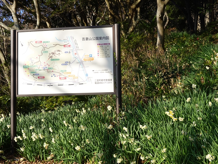 ニホンスイセンの群生地の中、ここにも「吾妻山公園案内図」が。近寄って。 寒咲き日本水仙(白・黄色/房咲)、フサザキスイセン。群生地をカメラで追う。ここにも「現在地ポイント」案内ボード。見上げて。「ヒノキ 檜ヒノキ科ヒノキ属分布=本州の福島県以西~四国 九州 葉裏の気孔線は白いY字形 樹皮は赤褐色でサワラより縦に幅広く裂け、はげる」と。「ツツジ園」が前方に見えた。ここから一方通行、左手に進む。こちらは真っ白なスイセン。純白のフサザキスイセンか?この赤い花はヤマツバキ?この先の路面にはウッドチップが敷かれ、足元がフワフワと。右手奥にあった「浅間神社」の案内板。「浅間神社(せんげんじんじゃ)祭神は木之花咲耶姫(このはなさくやひめ) 二宮町上町地区の祭神で、土地の人には、浅間さんとして親しまれ、本社は富士浅間神社です。 木花咲耶媛はその名のとおり、咲く花の匂うような美女で、良縁を得られたので縁結びの神様として信仰されています。今からおよそ八百年の昔、源頼朝が富士の巻狩りを催した時、曾我兄弟は父の仇、工藤祐経を討取りました。 この時姉の二宮の花月尼はその成功を富士浅間神社に祈っりました。 後、花月尼は大願成就に感謝の意をこめて、自分の住まいの前のこの山上に、浅間神社をまつったと言います。 平成十六年四月吉日 二宮町二宮・上町町内会」扁額「浅間神社」の石鳥居。近づいて。「浅間神社」の社殿には帰路にと。「浅間山は「あさま」と呼ぶのに、富士山の浅間神社はなぜ「せんげん」神社と言うのでしょうか? その疑問には、まず「あさま」の語源を調べてみることにしましょう。語源には色々な説がありますが、寺田寅彦博士の説が面白い。曰く:《「古語でアサマは火山を意味したのではないか」という。日本の火山の名称には「ア行音+サ行音(浅間、阿蘇、有珠、恐、恵山、雲仙、等)」という「音の類似」が多くある。》他には:《「アサマ」はアイヌ語で「火を吹く燃える岩」の意味から名付けられた。と言う説。》また南方説で:《マレー語では、「アサ」は煙を意味し「マ」は母を意味するので、その言葉を火山である富士山にあてたとする説。》などなどです。いずれも「浅間(アサマ)」は古来「火山」を意味したようです。それでは「アサマ」がどうして「センゲン」と呼ばれるのか? これは、“元来、浅間は「アサマ」読みだが江戸時代に「センゲン」と読みならわされたようです。「仙元」とも書いたようで、「浅間嶺」にある浅間神社も以前は「仙元神社」とか言われていたとのことです。「センゲン」と呼び始めたのは鎌倉から江戸時代にかけて、中国文化の影響が大きく、熟語をむやみに「音読み」にしたためと言われています。山や地名だけでなく、学者や芸術家などもこぞって名前は支那くさい名をつけたからだといいます。そう思うと「アサマ」でも「センゲン」でもなんとなく納得が出来ますが、読みはやはり「訓読み」で「アサマ」の方が私は好きです。」とネットから。ツバキの花。「タチカンツバキツバキ科:属園芸品種 サザンカを母種とした寒椿の立性品種」と。さらに緩やかな坂・フワフワ路を進む。前方で三叉路に。左に行くと「吾妻神社」。昨年までは、以前のがけ崩れでこの路は青い土嚢袋が並び閉鎖されていた。これは、2022年の写真である。が、今年は復旧が完了し、開通していたのであった。前方に「ローラーすべり台」全長102メートル、傾斜約10度のローラーすべり台。相模湾を見下ろしながら、一気に下って行くのだと 。ここにもスイセンの群生地が。「吾妻山公園利用のご案内」。開園時間:午前8時30分から午後5時まで と。入口にゲート等の設置はなかったが、「吾妻山公園 休憩室」の隣の管理事務所に町の方が常駐している時間なのであろう。再び「吾妻山公園案内図」。★現在地はここ。あと100メートル近くで山頂に。「ローラーすべり台」のゴールを見る。ズームして。利用時間 午前9時 ~ 午後4時30分料金 無料ここにも菜の花が満開で。頂上の菜の花がますます楽しみになったのであった。最後の急な階段をラストスパート。このにもスイセンが所狭しと開花中。「管理棟」手前に設置されている遊具を見下ろす。「ローラー滑り台」の管理小屋が見えて来た。近づいて。 ・・・もどる・・・ ・・・つづく・・・