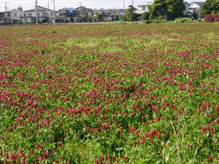 この日は4月24日(木)、我が家の裏の農家の畑には一面に「クリムソンクローバ」の赤い花が開花中。花の姿から「ストロベリーキャンドル」とも呼ばれています。クリムソンクローバは観賞用として楽しむほかに、土壌を豊かにするための緑肥としても利用されています。緑肥とは、育てた植物をシーズンが過ぎた後に取り除かずに、そのまま土にすき込んでその後に植える野菜の肥料にするというものです。クリムソンクローバはマメ科植物に属するため、根に根粒菌が共生しています。根粒菌は、空気中の窒素を土壌中に固定して植物が吸収しやすい形に変える働きをもっています。つまり、クリムソンクローバを植えると根粒菌によって土が豊かになり、さらに緑肥として利用することで次に育てる野菜に肥料分が提供されることになります。畑のクリムソンクローバを抜いて根っこを見てみると、根っこに数ミリメートルの瘤(こぶ)のようなものがいっぱいくっついています。これは根粒と呼ばれる器官で、この中に根粒菌(バクテリアの一種)という土壌微生物が住んでいます。根粒菌は大気中の窒素をアンモニアに変換し(窒素固定といいます)、植物の生育に欠かせない窒素を大豆に供給する働きをしています。化学肥料のアンモニアは1000気圧という超高圧、500℃という高温のもとで窒素と水素の化学反応で工業的に作られますが、莫大なエネルギーを費やします。根粒菌はこの反応を常温常圧でいとも簡単にやってしまう、まさに自然が創造した「超すぐれもの」なのです。クローバーに限らずマメ科植物(大豆、エンドウ、なども仲間なのです!)は、根粒菌と共生して窒素固定しています。自然界は不思議なのです。本来は多年草ですが、暑さには弱いため日本では一年草として扱われているようです。真っ赤なイチゴの果実に似た花穂を数多く枝先につけています。別の方向にカメラを向けて。ストロベリーキャンドルの他にもストロベリートーチ、ベニバナツメグサ、オランダレンゲなどの別名を持つとのこと。クリムソンクローバの赤い花は実は集合花です。クリムソンクローバを直訳すると「炎のツメクサ」とのことですが、この名前は花がまるで燃える松明(トーチ)のように見えることに由来していると言われています。菜の花とのコラボを。そして、白のクリムソンクローバを発見。突然変異!?あまり知られていませんが、クリムゾンクローバは栄養価が高く、飼料として優秀ですが、実は食べられるらしい。花は蜜があるので、エディブルフラワーとしてサラダにしたり、お茶できるようです。葉は炒め物、スープにできるようです。私はTRYしたことはありませんが。また、牧草として家畜のえさにされたり、犬や猫、小動物用のおやつに乾燥させたものが販売されたりしているとのこと。以下、2枚の写真はネットから。そして我がミツバチ!?も発見。花に蜜を多く持っているので、我がミツバチ!?やハナアブといった受粉する虫を呼ぶことができます。開花すると多くの我がミツバチが訪花しているのです。近くに置いていたイチゴ、はすべて受粉して実を付けることができるのです。そして、たくさんの蜜を集めて欲しいのです。 ・・・おわり・・・