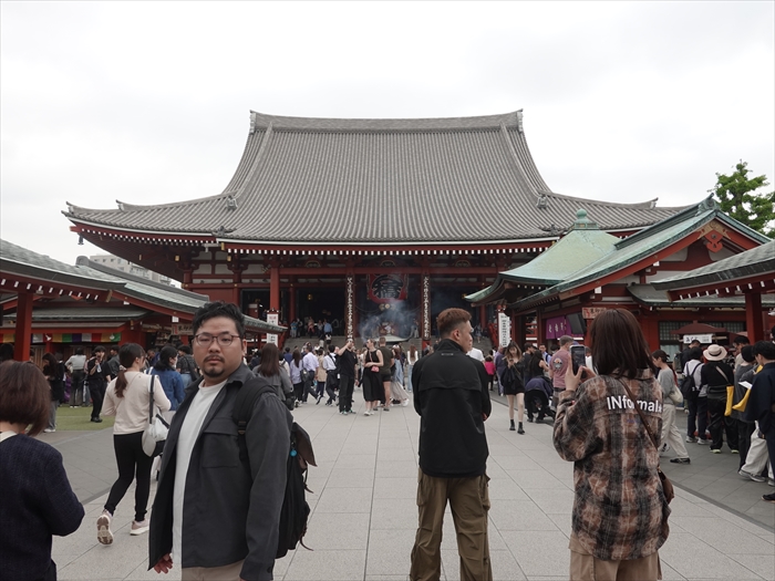 「浅草寺」の「本堂👈️リンク」に向かって進む。間口34.5m、奥行32.7m、棟高29.4mで、旧本堂よりそれぞれ3mほど大きい。「浅草寺」の本堂はご本尊の聖観世音菩薩を奉安することにちなみ、観音堂とも呼ばれる堂宇である。国宝に指定されていた旧本堂は昭和20年(1945)3月10日の東京大空襲により焼失したが、その後全国のご信徒からのご浄財により、昭和33年(1958)に今日の本堂が再建された。本堂の創建は、ご本尊が示現された推古天皇36年(628)にさかのぼる。檜前浜成・竹成の兄弟が隅田川(宮戸川)で観世音菩薩のご尊像を感得したのち、10人の草刈り童子によって藜で屋根を葺いた堂に一時安置された。その後、土師中知が私邸を寺として、この聖観世音菩薩のお像を奉安したのが、本堂の起源である。ここに写っている人物はほぼ全てがインバウンド。正面に大きな「常香炉」。「常香炉」からは煙が濛濛と。「常香炉」の煙を浴びるインバイウンド。「常香炉」の煙には魔や邪気、穢れを払う効果があるといわれて折、転じて「体の悪いところが治る」「頭にかければ頭がよくなる」とも言われているのだ。そして「お水舎(おみずや)」。直径 2.3m・高さ 1.0m、八角形錆御影石造り。本堂前右側に位置するお水舎でお参りの前に身を清める。お水舎での作法について👈️リンク天井には「墨絵の龍」(東 韶光 画)、八角形錆御影石造りの手水鉢の上に、かつて本堂裏にあった噴水に安置されていた高村光雲作の龍神像(沙竭羅龍王像)をまつる。 高村光雲作の龍神像(沙竭羅龍王像)。明治36年(1903)8月奉安。仏法を守護する龍王の1人。龍や龍神は、水をつかさどる神である。頭に龍を乗せた銅像で、「龍神像・沙竭羅(さから)龍王像」と言うと。沙竭羅龍王は、法華経を守っているという龍族・八代龍王の1人 と。墨絵の龍の「天井画」。作者:東韻光作画年: 1964年(昭和39年)振り返って。左に「宝蔵門」、中央に「札所」、右に「伝法院」境内に立つ「五重塔」。 ズームして。朱も鮮やかな五重塔は、昭和48年(1973)に再建された、鉄骨・鉄筋コンクリート造りの塔である。外から見ると、五重塔は地上面から建っているように見えるが、実際は基壇状の建物(塔院)の屋上に建っているのだ と。よく解る写真をネットから。「本堂」手前右側にあった「天水桶」。浅草寺魚河岸講が昭和33年に浅草寺へ寄贈した劣化により平成22年(2010年)にリニューアル と。直径4.5mの「志ん橋」と書かれた大提灯が掛かる。江戸時代の浮世絵師・歌川広重「名所江戸百景 浅草金竜山」には、新橋から奉納された、「志ん橋」大提灯が描かれています。現在、本堂に掛かっている「志ん橋」大提灯は広重の浮世絵に描いていたデザインに立ち返っています と。歌川広重「名所江戸百景 浅草金竜山」をネットから。この図は雪の浅草寺雷門から、山門と五重塔を望んだもの。「大はしあたけの夕立」と共に広重の代表作。堂塔の赤と緑が雪に映えて美しく、雷門をくぐり浅草寺境内まで続く参道には雪がこんもりと積もっている。この雪の部分は空摺(からずり)という絵の具を付けずに摺る技法が用いられていて、積雪の量感が巧みに表現されている。大提灯「志ん橋」は、東京新橋組合が奉納(新橋の料亭、茶屋、芸者たちが、芸の一流や街の繁栄、事態の終息などを祈願して奉納)したもので、高さ4.5m、幅3.5m、重さ約600kgと、浅草寺の大提灯の中で最も大きいもの。文字「志」は「し」と読み、1900年以前の変体仮名と呼ばれる字体で書かれている と。この大提灯の下部にも「龍の彫刻」が。 右の柱・向拝の聯(ごはいのれん)には、『実相非荘厳金碧装成安楽刹』・【実相は荘厳に非ざれども金碧装いなす安楽刹】左には、『真身絶表象雲霞画出補陀山』・【真身は表象を絶すれども雲霞画き出す補陀山】と「豊道春海 書」が書かれ、「真如の世界はとても形などに表すことはできないが、見事に整えられた伽藍や自然の景観の妙は、それこそ仏の浄土であり、観音さまの世界である(浅草寺の堂塔伽藍・境内浄域のことを表す)。」という意味 であると。大提灯越しに「宝蔵門」・「仲見世通り」方向を振り返る。移動して。「本堂」の「正面額」には「施無畏(せむい)」と。高さ 約1.35m・幅 約4m、重さ 約700kg、欅製豊道春海原書 南部白雲工房作〔令和2年(2020)6月奉納〕観音さまは経典において、「施無畏者」とも呼ばれ、人々の不安や恐怖を取り除き、「畏れ無きを施して」下さる。「施無畏」とは、観音さまのおはたらきそのものを意味する と。そして本堂奥には「御宮殿」。 ズームして。「御宮殿」。ご本尊である聖観世音菩薩を安置している場所。ズームして。御本尊の聖観音菩薩が安置されている金箔のお宮。開基の勝海上人が秘仏と定めて以降、誰も見たことが無い絶対秘仏。つまり観音像を網で掬い揚げた、檜前浜成(ひのくまはまなり)・檜前竹成(ひのくまたけなり)兄弟と、その像を本尊として寺を草庵した土師真中土(はじのあたいなかとも/はじのまつ