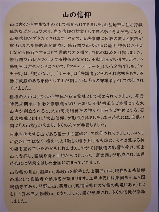 「山の信仰山は古くから神聖なものとして崇められてきました。山岳地帯に住む狩猟民族などが、山や木々、岩を信仰の対象として畏れ敬う考えが元になり、山岳信仰ができたとされます。やがて、山岳信仰に仏教の教えと実践が取り込まれた修験道が成立し、修行僧や山伏が山に籠り、神仏にお仕えしながら修行をすることで霊的な力を得て、自他の救済を目指しました。修行僧や山伏がお仕えする神仏のなかに、不動明王がいます。元々、不動明王は古代インドにおいて、「アチャラ=ナータ」という名前でした。「アチャラ」は、「動かない」、「ナータ」は「守護者」とそれぞれ意味をもち、不動で威厳のある象徴として山が例えられ、「山の守護者」として信仰されていました。相模の大山は、古くから神仏が宿る霊峰として崇められてきました。平安時代末期頃に仏教と修験道が取り込まれ、不動明王をご本尊とする大山寺が創立されると、大山阿夫利神社の神々と巨石をご神体とする、石尊大権現とともに「大山信仰」が形成されました。江戸時代には、庶民の間に「大山詣」が広まり、多くの人々が参詣しました。 日本を代表する山てある富士山も霊峰として信仰されてきました。神々しい姿だけてはなく、噴火により激しく噴き上げる火焔に、人々は荒ぶる神の姿を重ねていたのかもしれません。やがて修験道の影響を受け、富士山に登拝し、霊験を得る目的からはじまった「富士講」が形成され、江戸時代には関東をはじめ全国に広まっていきました。山形県の月山、羽黒山、湯殿山を総称した出羽三山は、現在も山岳信仰の場として修験者や参拝者が集まります。江戸時代には東国三十三ヶ国総鎮守であり、熊野三山、英彦山(現福岡県と大分県の県境にある)とともに「日本三大修験山」とされました。講が形成され多くの信徒が参詣しました。「萬古庵 相模国大山全図 明治期」。 大山の全体図を描いています。入口の鳥居から山頂まで細かく描かれており、右下には阿夫利神社や大山寺の不動尊の例祭が記載されています。「歌川国芳 大山良弁滝 弘化4年--嘉永5年(1847-52)」。「良弁の滝で身を清める勇ましい男性たちの姿が描かれています。大山の山頂までの登拝が許される夏の例祭は、短期間に限られていたので、その間に大勢の参拝客が押し寄せたであろうことが想像される一枚です。また、前不動から山頂までは女性の参拝は禁止されていたので、女性の姿が描かれていない点も大山を描いた浮世絵の特徴の一つです。」 「ニ代歌川広重 冨士山東ロ須走り之図 文久元年(1861)」 「富士山の真東にある須走ロの浅間神社の鳥居の前に集まる人々の様子を描いています。菅笠に白装束をまとい、首から数珠をかけた先達(登山の案内人)が描かれています。何人かが肩に背負っているのは、御三幅の入った札箱です。御三幅とは登拝の際に祭壇に掲げる3本の掛軸のことで、御身抜(富士信仰の世界観を表した掛軸)、浅間神社の祭神である木花咲耶姫命の御影(神仏の姿を絵に描いたもの)、小御嶽神の掛軸、をいいます。この画は、もともと団扇に仕立てるために摺られたものが、使用されずに残ったものです。」 「霞峰画 歌川広重模写 湯殿山道中畧圖(りゃくず) 」。 「湯般山を背景に、羽州街道の町並みを描いています。湯殿山は画中に見える月山や羽黒山とあわせて山羽三山と総称され、古来より霊場として信仰を集めていました。本作は山羽国(現在の山形県)の絵師・霞峰の作品を初代広重が模写したものと考えられており、画面左下には「霞峰先生図 東都ー立斎広重 応需 模写」と記されています。」 「縁起絵巻(写本)にみる信仰縁起とは、仏教用語て様々な原因や条件によって物事は起きるという意味の他に、寺社仏閣、仏像や経典などの由来や沿革も意味します。本来は漢文で寺社の由来などが表記されていましたが、平安末期頃から絵を伴った霊験を説く縁起絵巻の制作が盛んになりました。その霊験をあまねく広めるために数々の写本が制作されました。藤沢宿コーナーては、「粉河寺縁起絵巻(写本)」と「住吉物語絵巻断簡(写本)」を展示し、縁起絵巻の世界を通して人々の神仏に対する信仰を紹介します。」 「猪飼嘯谷 住吉物語絵巻断簡(写本) 制作年不詳」 「住吉物語絵巻断簡の写本です。断簡とは、劣化により糊がはがれたり、意図的に切り取られてしまった絵巻物などを、鑑賞用として掛け軸に仕立て直したことをいいます。住吉物語は鎌倉時代に成立された継子いじめ譚(後妻が先妻の子を冷遇、または虐待する昔話の一種。)に分類される物語です。中納言の姫君が、少将との仲を妬む継母の悪だくみを避けて住吉に住む尼のもとへ隠れます。やがて長谷の観音菩薩の導きで尋ねてきた少将と再会し、都へ戻って幸せに暮らすという内容です。展示展示されているのは、物語の後半部分とされ、京都生まれの日本画作家、猪飼嘯谷( 1881 -1939 )によって写されたものと伝えられています。」 「