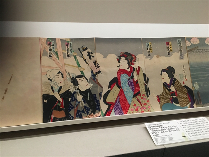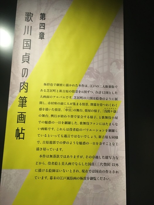 「第四章 歌川国貞の肉筆画帖極彩色で細密に描かれた本作は、江戸の二大歓楽街である芝居町と新吉原の情景を6図ずつ、合計12図とした大画面のアルバムです。芝居町の六図は絵巻のように展開し、市村座の前に人が集まる情景、開を待つわくわく感を描いた情景、「車引」の舞台、楽屋の様子、「浅間ケ嶽」の舞台、興行が終わり皆で宴会する様子、と歌舞伎小屋での魅惑の一日を網羅した、歌舞伎ファンにはたまらない画です。これらは役者絵のバリエーションを網羅しているといっても過言ではないでしよう。新吉原も同様で、吉原遊郭での夢のような魅惑の一日を余すことなく本作は無落款ではありますが、その卓越した描写力などから、役者絵と美人画でならした国貞(三代豊国)以外に描ける絵師はいないとされ、現在では国貞の作とされています。幕未の江戸風俗画の極致を御覧ください。」第4章の展示状況。「隅から隅まで超極彩色密画「芝居町 新吉原 風俗絵鑑」三代歌川豊国(国貞)」「隅から隅まで超極彩色密画「芝居町 新吉原 風俗絵鑑」三代歌川豊国(国貞)江戸時代後期 19世紀」「市村座 表掛(おもてがけ)」。「市村座 表掛(おもてがけ)幟が立ち看板の下では木戸芸者が読立てをして客を招く。赤ん坊をおんぶして口を開けて聞く女や、看板を仰ぐ丁稚や武士、商人などで賑わう。幕などに市村座の橘の紋がみえ、木戸の格子も市村座特有の斜格子。看板に「三幅対書初曾我」とあり、天保5年( 1834 )正月の上演の記録と一致する。三幅対は毛剃と箱根権現と姫小松、浄瑠璃は清元の「初霞浅間嶽」。絵看板の細部までも丁寧に描いている。」「幕間」。「幕間開幕を待つ客席では派手な喧嘩が始まっている。舞台には「木場」の文字と三筋が染められた幕が引かれ、これは「新三升連」とあり団十郎の後援団体から贈られたもの、また下辺に市村座の橘の紋がある。客席は舞台正面の平土間、一段高い高土間、その後ろの桟敷に分かれる。桟敷は後ろに廊下があり、そこから出入りする。現在より舞台が張り出しており、客席の一部は幕の内側になっている。」「車引」。梅王、松王、桜丸の三つ子の兄弟のうち松王は深慮があって藤原時平の舎人となり、菅相丞方の梅王・桜丸が、吉田社頭でその牛車を押し止めようとする有名な場面。「車引「菅原伝授手習鑑」の三段目。梅王、松王、桜丸の三つ子の兄弟のうち松王は深慮があって藤原時平の舎人となり、菅相丞方の梅王・桜丸が、吉田社頭でその牛車を押し止めようとする有名な場面。似顔から時平=五世松本幸四郎、松王=五世市川海老蔵、梅王=四世坂東三津五郎、桜丸=沢村訥升と判るが、この役割での上演は見当たらない。」「舞台裏」。「舞台裏楽屋の一階と舞台裏とを吹抜屋台風に描く。黒御簾の向こうに客席が見え、舞台では女六部に扮した中村歌六かと思われる女方が藪畳の向こうの人物と錦の旗を引き合い、附がバタバタと討たれてその藪畳から武将が現れるところ。小道具方も名鏡を出すタイミングをはかっているだんまりの場面。陰でせりふを付けるのか作者も居り、下座では三味線と大鼓小鼓が奏されている。一方、楽屋の稲荷町連中は四天の扮装準備に忙しく、傍では狂言に因んた趣向か、仕丁姿の面々が幹部俳優たちが差し入れる振舞酒を頂戴する酒番の場面。手前の廊下右方で話をしているのは三世尾上菊五郎と六世岩井半四郎らしい。」「浅間ケ嶽」。「浅間ケ嶽舞台で上演されるのは天保5年(1834)正月市村座での「三幅対書初曾我」一番目四立目浄瑠璃「初霞浅間嶽」で「市村座表掛」の看板のとおり。五世市川海老蔵の京の次郎が焚く起請の煙の中に三世尾上菊五郎の傾城奥州の亡魂が現れる。ニ人の顔は後見の差し出す面明かりの中に浮き上がる。舞台奥には清元の出語りが見え、舞台下手の隅では舞台番(監視役)が後ろを振り返って注意する。」さらに展示品をIphoneカメラで追う。「芝居茶屋」。「芝居茶屋観劇の後、御殿女中ニ人が芝居茶屋ニ階に役者衆や芸者、幇間(ほうかん)を招き、豪勢な宴をはる。描かれた役者は中央奥で三筋の扇に揮毫する五世市川海老蔵、黒羽織で青い扇を持つニ世中村芝翫、相対して盃を後ろに引く四世坂東三津五郎。左の階段を上った黒い羽織の三世尾上菊五郎、その後ろ振り返る沢村訥升。右の衝立の近くに座る岩井紫若。紫冒子をつけお中臈(ちゅうろう)と挙をする縞の着物の六世岩井半四郎、手前で挙に興じ両手を膝につくニ世中山文五郎。」「仲之町の桜」。「仲之町の桜大門を入ると繁華街、仲之町で、両側に茶屋が並ぶ。有名な引手茶屋の山口巴の暖簾が見える。仲之町の桜は寛延2年(1749)、茶屋の店先に桃・桜の鉢植を出したのが初めで、桜を植えたのは1、2年後のこと。毎年2月下旬(旧暦)に植え付け、3月3日、4日の紋日を中心に仲之町の花見は廓のー大行事。花の下を歩く遊女や禿(かむろ)、客引きをする男、茶屋の座敷では芸者が音曲を奏で花見の宴たけなわ。」「格子先」。