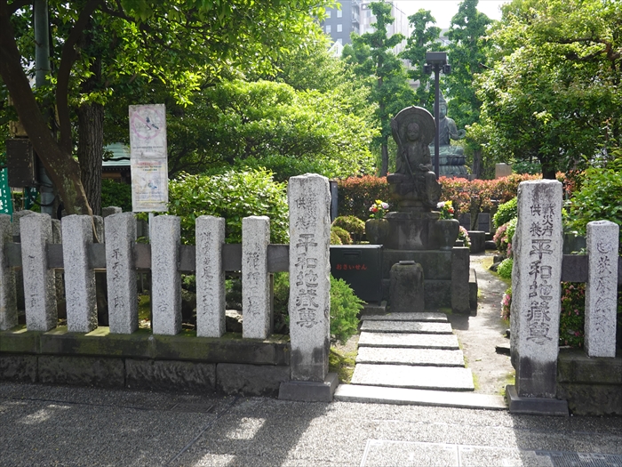 隣りにあったのが「曽我廼家五九郎顕彰碑」。 浅草に喜劇王と言われた曾我廼家 五九郎(そがのや ごくろう)の顕彰碑。明治~昭和前期に東京浅草などで活躍した喜劇俳優で、この石碑には彼が主演を演じた映画「ノンキナトウサン(通称ノントウ)」が描かれていて、その上には彼が好きだった「群盲撫象」の文字も一緒に刻まれていた。近づいて。円形の上部には五九郎の好きだった「群盲撫象」の文字と「ノンキな父さん」の像を描く。《群盲(ぐんもう)象(ぞう)を評(ひょう)・すの意味《多くの盲人が象をなでて、自分の手に触れた部分だけで象について意見を言う意から》凡人は大人物・大事業の一部しか理解できないというたとえ。》であると。昭和38年建立。題字は大野伴睦筆。下部には金子洋文(プロレタリア文学の小説家、劇作家)からの碑文があった。「あなたは小さな身体に大きな夢をいだいた。・・・・・を叫んで迫害をうけ・・・・」 中央に「五九郎石碑 ノンキナトウサン」 左右の俳句は右:観音の慈悲尊し春の雨 万木左:浅草の茶乃木畑の(能)雪解(ゆきけ)かな 万(久保田万太郎)「私は貝になりたい フランキー堺」の文字が。 『私は貝になりたい』(わたしはかいになりたい)は、ラジオ東京テレビ(KRT→TBS)の「サンヨーテレビ劇場」で1958年10月31日22:00 - 23:40に放送された日本のテレビドラマ。元陸軍中尉・加藤哲太郎の獄中手記「狂える戦犯死刑囚」の遺書部分をもとに創作された橋本忍脚本によるフィクションで、第二次世界大戦中に上官の命令で捕虜を刺殺した理髪店主が戦後B級戦犯として逮捕され処刑されるまでを描く。岡本愛彦演出、フランキー堺主演。第13回文部省芸術祭芸術祭賞(放送部門)受賞作。1959年・2008年に映画として、1994年にテレビドラマとしてリメイクされた。この作品は2008(平成20)年に中居正広、仲間由紀恵主演でリメイクされているが「曽我廼家五九郎顕彰碑」との関連は?フランキー堺は五九郎の甥にあたると。『曾我廼家五九郎顕彰碑』を取り巻くのは「永生之碧」。1964(昭和39)年日本の芸能団が招かれて訪中し日中友好の端緒を作りました。このことを祈念して1965(昭和40)年にこの『永生の壁』が建立され題字の『永生之碧(壁ではなく)』は当時の中国の指導者のひとり郭沫若の揮毫であると。壁にはさらなる日中友好と世界平和を願って約300人の文人・芸能人が思い思いのことを書き連ねています。「相模彫 鏡碩吉」 と。様々な絵や文字が。次に訪ねたのが「新奥山」の前にあった「淡島堂」。「寫経供養塔」を見る。 「浅草観音裏」案内図。 「淡島堂」入口。「淡島堂(あわしまどう)」と。 「寫経供養塔」に近づいて。平成6年(1994)10月26日落慶。木製銅板葺、花崗石造。総高8.8m・屋根軒長3.7m・相輪高3.2m。「寫経供養塔」「写経供養塔浅草寺では、昭和三十三年の本堂落慶を記念して、「観音経写経運動」を発願しご信徒各位にお写経をお勧めしており、ご奉納いただいたお写経は、毎年十月の写経供養会にてご本尊観音さまの御宝前に奉安され、供養されている。平成六年に造立されたこの宝塔型の写経供養塔には、その年にご奉納されたお写経の経題と巻数とを記した「目録」をご奉安し、ご信徒各位のお写経の功を後世に伝え讃嘆している。 金龍山 浅草寺」 境内右側にあった「戦災供養地蔵尊」。 浅草三業地の戦死者慰霊のため造立 と。「浅草大平和堂」。 昭和38年(1963)建立。浅草地区の3万人余の戦災殉難者の霊をまつる。「建設趣意書思い出づる調べも哀し昭和ニ十年三月九日の夜、B29三百機以上の大空襲により浅草一帯は火の海となる。地をなめるようにして這う火啗と秒速三十米をこす烈風にあふられ、親は子を呼び、子は親を求むれど、なすすべもなし。おののき叫び逃げまどい、悪夢の如き夜が去れば・・眼にうつるものは一面の焦土にて、一木一草の生づるもなく、あわれ身を焼かれ路傍に臥す無辜の犠牲者は一万余柱を数う。当時その凄惨な状況は一片の新聞だに報道されることなく、敗戦後に生れた子供達は戦争の惨禍を知るよしもない。いたましく悲しい夜もいつしか歴史の一駒として消えて行くであろう。よって我々はここに当時を偲び、不幸散華された御霊の安らけく鎮まりまさんことを祈り、ニ度とあやまちを繰り返すことなく永遠に世界の平和を守らんことを誓い、浅草観音の浄域にこの碑を建立する 以て瞑せられよ。昭和三十八年八月十五日 浅草大平和塔維持会」 「東京大空襲後の浅草」 近づいて。塔上部の「和」は浅草寺中興第24世貫首、清水谷恭順大僧正の筆。台座の銘にはノーベル物理学賞の湯川秀樹博士の直筆で「みたまよ とこしえに 安らかに われら守らん 世界の和 湯川秀樹」と。 「魂針(こんしん)供養之塔」。 近づいて。「建立の記この針供養之塔は、大東京和服裁縫教師会が五十周年の記念事業として発願し、全国和裁団体連合会の御協賛と裁縫をたしなまれる多くの方々の御助勢とにより、昭和五十七年十月十七日に建立され