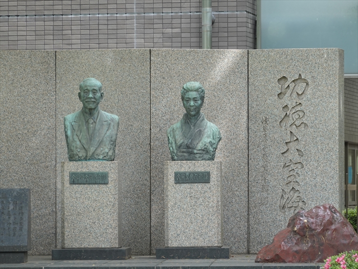 「浅草寺」の「本堂」の裏の広場の北側の緑地帯には多くの石碑、石像等が並んでいた。東側から「大谷米太郎夫妻像」。 「大谷米太郎夫妻像」。宝蔵門の寄進建立をはじめ、浅草寺の復興に尽くした大谷夫妻壽像で、昭和42(1967)年10月造立。夫妻の胸像は、昭和37(1962)年に朝倉文夫により製作された。ズームして。「大谷米太郎翁・さと子夫妻」 の胸像。 大谷米太郎翁は明治14年(1881)~昭和43年(1968) 86歳で逝去。昭和15年(1940)、一代で大谷重工業を設立。 東京オリンピックを機にホテル・ニューオータニを建設した実業家。「大谷米太郎翁寿像記翁ハ明治14年富山縣ニ生ル壮ニシテ上京大谷製鋼所ヲ創立シ社運隆々今日ノ大ヲナス夙ニ大慈ニ帰依シ浅草寺信徒総代トナリさと子夫人ト共ニ宝蔵門ノ寄進ノ外伽藍ノ復興に尽力シ衆庶ノ信仰ヲ荘厳ス其ノ功徳永ク金龍ト俱ニ輝カン 昭和四十二年十月一日」 宝蔵門、現在の門は浅草寺の山門として、内部三層のうち上部二層に近代的な防災設備を施した収蔵室を設け、浅草寺の什宝物収蔵の宝蔵門として大谷重工業・ホテルニューオータニ創始者の大谷米太郎氏のご寄進により復興再建された と。「天下泰平 奉納大乗妙典六十六部供養佛」碑。 六十六部とは、六部ともいわれ法華経を書写し、それ を日本全国六十六州の神社仏閣の霊場に奉納して廻る行 脚僧のことであるとされ、その廻国巡礼の証とされる 石塔「廻国供養塔」が、全国津々浦々に残されているのだ と。「消防殉難者表彰碑」 石碑にズームして。「消防殉難者表彰碑」は、宮内省から200円の下賜金を受け、警視庁消防職員が大正元(1916)年に建立したもの。表彰碑の手前の2本の石柱は、昭和36(1961)年に建立された江戸消防記念会の碑です。毎年5月25日の「弥生祭」に、江戸消防記念会により慰霊が行われています。表彰碑の手前の2本の石柱は、昭和36(1961)年に建立された江戸消防記念会の碑。「市部消防組」、「社團法人 江戸消防記念會」「消防殉職者表彰碑明治四十四年(一九一一年)当時の警視総監安楽兼通氏唱道によって享保四年(一七一九年)江戸町火消(いろは四十八組)が創建以来、猛火の中に身を挺して職に殉じた方々の功績が年々忘れ去られ消滅して行くことを憂慮し、これを後世に伝え永久に・・・・・・・」「浅草寺」の「本堂」を裏側から見る。 諸石仏右 :「地蔵菩薩像」 堺町の山城屋萬之助が先祖供養のために建立中央:「地蔵菩薩像」 延宝5(1677)年、木食阿闍梨安信和尚が建立左 :「如意輪観音像」 享保20(1735)年、僧常念が建立右:「地蔵菩薩像」堺町の山城屋萬之助が先祖供養のために建立。法華経供養塔。中央:「地蔵菩薩像」 延宝5(1677)年、木食阿闍梨安信和尚が建立。 木の陰に隠れて。(左:「如意輪観音像」 享保20(1735)年、僧常念が建立。)「竹本津賀太夫碑」。 「大江戸のつよきひいきの力にぞ、かかる千曳のいしぶみはたつ」と刻まれ、台石には百数十名の門下の名が列記されている。文政10年(1827)建立。移動して。手前に「初代並木五瓶句碑月花のたわみこころや雪の竹」現在の場所にどこからか移動したのであろう。後方に「菅沼定敬の歌碑(すがぬまさだちか)」「敷島のみちにはせきもあらなくに、なとてこころのとほらざる覧」と刻まれている。嘉永3年(1850)建立。「初代並木五瓶句碑碑面には、正面に「月花のたわみこころや雪の竹」、右手側面に「なにはづの五瓶、東武に狂言を出して、あまねく貴賤の眼目を驚かし、金竜の山中に雪月花の碑を築て、永く繁栄を仰ぐ、つづくらん百三十里雪の人晋子堂大虎」、左手側面に「寛政八年丙辰十二月十日建之 庭柏子書印」、裏面に「篠田金二迂造」と刻んである。「なにはづの五瓶」は初代並木五瓶のこと。五瓶は大坂に生まれ、歌舞伎狂言作者として活躍した。生存年代は延享4年(1747)から文化5年(1808)まで。はじめ五八、のち吾八・呉八・五兵衛と改め、ついで五瓶という。寛政6年(1794)江戸へ出て、非凡な才能をみせ、初代桜田治助とともに、江戸の二大作者と謳われた。時代物・世話物に優れた作品を遺し、4代市川団蔵、4代松本幸四郎らによって演じられた。作品には、「金門五山桐」「隅田春奴七容性」「富岡恋山開」「幡随院長兵衛」などがある。 平成6年(1994)3月 台東区教育委員会」 左手前の石碑「山東京伝 机塚の碑」。 「山東京伝机塚の碑 台東区浅草二丁目三番一号 浅草寺内山東京伝(一七六一~一八一六)は、浅草や吉原を題材とする戯作を多く著し、北尾政演の画号で浮世絵もよくした人物。この碑は、京伝の弟原山が文化一四年(一八一七)に亡兄を偲んで建立。表面には晩年の京伝撰「書案之紀」を刻む。書案とは机のことで「九歳時に寺子屋に入った際、親の買ってくれた机を生涯愛用し、この机で百部を越える戯作を書いた。しかし五〇年近くも使ったので、ゆがみ、老い込んださまは哀れである」という意味の文と、「耳もそこね あし(足)もくしけてもろともに 世にふる机なれも老いたり」の歌が記されている、また、裏