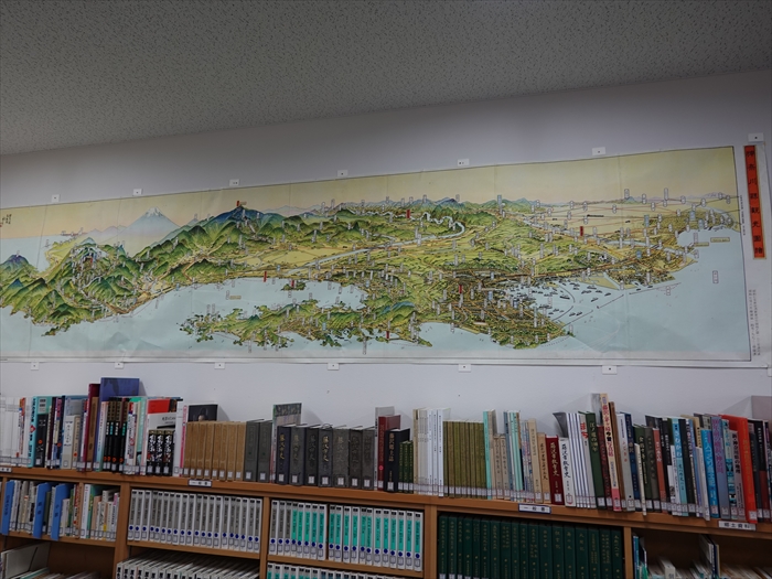 『江戸の祭神 弁財天と不動明王』展の見学を終え、常設展示の部屋に。「吉田初三郎 昭和5年(1930) 湘南電鉄沿線名所図絵」が展示されていた。鳥瞰図サイズ:770×177mm。全体の拡大図絵をネットから。大正広重と呼ばれた鳥瞰図絵師・吉田初三郎作。現京浜急行。昭和5年4月に黄金町~浦賀間、金沢八景~湘南逗子間が開通し震災からの復興がようやく地元に実感できた時期に描かれた。昭和8年には品川~浦賀間が直通運転となる。図絵は初三郎独特の一直線に線路を描き距離感を縮める得意技で描かれ、全盛期の素晴らしい構図である。「江の島」周辺、三浦半島をズームして。 「吉田初三郎 昭和5年(1930) 湘南電鉄沿線名所図絵発行:湘南電気鉄道株式会社湘南電気鉄道は京浜急行電鉄の前身の一つで、大正14年(1925)に会社設立。昭和5年( 1930 ) 4月1日に黄金町駅-浦賀駅間、および金沢八景駅-湘南逗子駅の路線を標準軌で開業横浜~浦賀間で営業を開始した際の発行絵図です。」いろいろな角度でズームして。窓から、大山方向を見る。左側の白い建物が「テラスモール湘南」。 「大庭城跡市指定記念ミニパネル展」。「大庭城跡大庭城跡は藤沢市大庭字城山に所在する戦国時代の山城です。お城と言うと、石垣と天守閣を持つものをイメージしがちですが、それらは江戸時代以降のお城で、関東のお城は堀と土塁を多用した、いわゆる「土の城」でした。なぜならば、関東地方に堆積している関東ロームは滑りやすく一度落ちたら容易に登れないからです。大庭城跡も例にもれず「土の城」でしたので、石垣や天守閣はありません。なのでよく「大庭城跡に行っても何も残っていない」との話を聞きますが、そんなことはありません。大庭城址公園内には沢山の堀や土塁の痕跡が残っています。ところで大庭城は誰が築城したお城でどのような人物が守っていたのでしようか。築城時期は不明な点が多いですが、築城したのは当時相模国(神奈川県の大部分)の守護であった扇谷上杉氏と考えられています。またある時期には扇谷上杉朝昌という人物が大庭城を守備していたことが古文書から判明しています。この朝昌という人物は扇谷上杉氏の中ではかなりの重要人物であり、大庭城はそのような人物が守備するほど重要な拠点であったことが指摘されています。」 「大庭景親と大庭城跡大庭城跡は元々、平安時代後期に活躍した大庭景親の居館跡を戦国時代に築城の名手である太田道灌がお城として改修したという話がありますが本当でしようか。残念ながらこの話は江戸時代頃にできた地元の伝承で、室町時代の古文書には大庭景親の居館跡と大庭城は別々の場所にあったことが記されています。」 扇谷上杉氏略系図。大庭城跡(1990年撮影)。「発掘で確認された大庭城の遺構大庭城跡は昭和42年(1967年)から令和3年(2021年)までに25回の発掘調査が行われています。その中でも第2次調査から第6次調査では城を守るために掘られた20本以上の堀が確認されています。また現在「館址広場」と名前がついている大庭城南側の平場からは大型の掘立柱建物が確認されており、ここが城主のいた主郭であると考えられています。なお、この掘立柱建物の1棟の柱穴から炭化したお米が出土していますが、平成28年(2016年)に郷土歴史課でこのお米を化学分析したところ、籾殻の付いた状態で炭化したことが分かりました。また年代測定の結果、大庭城が機能していた頃のものであることも分かりました。近年の調査で注目されるのが、主郭の西斜面で行われた第23次調査と第25次調査です。第23次調査では主郭の西斜面を鋭角に削り、さらに横堀を掘っていることが分かりました。また昨年度から今年度にかけて第23調査より下で新たに2本の横堀と、斜面を平坦に造成して守備兵を配置した「帯曲輪」という防御施設の存在も確認するとができました。横堀と竪堀横堀とは斜面に対して平行して掘られた堀で、攻め手が斜面を登ることを防ぐために築かれたものです。それに対し竪堀は攻め手が横向に自由に移動することを防ぐために築かれた堀となります。」 大庭城発掘調査案内図。横堀(南から)。「帯曲輪(西から)」 3号堀立柱建物の柱穴から出土した炭化米(左上)とその電子顕微鏡写真(右上・右下)。「藤沢宿」ポスター歴史新発見! 藤沢の海じゃないほう。」「旧東海道・藤沢宿」に観光客を呼び込もうと市内のクリエーター3人の方が制作したポスター。街道筋の神社、お寺の見どころ、逸話を写真とイラスト入りのポスター。小田急各駅、JR藤沢駅と近隣駅、公共施設に掲示されている、と。 さー ”「海じゃないほう 藤沢宿」” に行って見ましょう と。 「八犬傅出世雙六 一鶯斎国周 (いちおうさいくにちか )画」。慶応1/1865。八犬伝の11の名場面に、27人の人物を配して双六にしている。振り出しは里見義実、上がりは芳流閣。人気役者の見立絵。「初代 歌川広重 六十余州名所図会 下総 銚子の浜 外浦」「下総 銚子の浜 外浦」は、下総の代表的な名所で