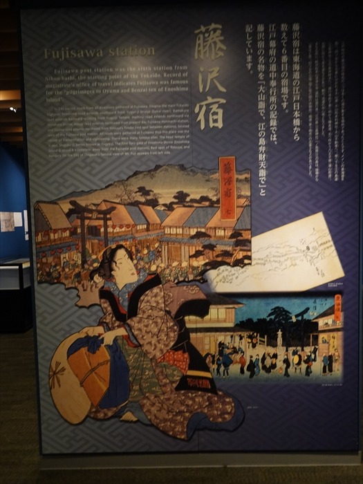 かなりブログアップまで時間がたってしまったが、昨年末・2024年12月13日(金)、藤沢市内にある「藤澤浮世絵館」を訪ねた。「タイムズ湘南シークロスパーキング」に車を駐め、「藤澤浮世絵館」に向かう。 この日の目的は『江戸の祭神 弁財天と不動明王』展の鑑賞。「藤澤浮世絵館」は藤沢市辻堂神台2-2-2 ココテラス湘南の7Fにある。「Cocco Terrace ココテラス湘南」 案内板。「Cocco(ココ)」は、イタリア語で「かわいい子、秘蔵っ子」などを意味する と。「Terrace(テラス)」は、屋外フロア、バルコニー」のことです。「ココテラス」は、日本語で「此処を照らす」明るい子どもたちの未来の言葉にかけられているのだ と。1Fロビーにあったクリスマスツリー。そして7Fの「藤沢市 藤澤浮世絵館」入口へ。「浮世絵とは」浮世絵とは、江戸時代に発達した版画絵のことです。現実の世相や風俗といった「浮世」を描いた絵画です、その名は17世紀中頃には見られるようになります。「藤沢市は、市民の郷土への愛着を育み、市民の文化の向上に寄与することを目的として、東海道藤沢宿や江の島の浮世絵をはじめとした郷土資料の鑑賞ができる施設「藤沢市藤澤浮世絵館」を開館いたしました。藤沢市の浮世絵等資料コレクションは、1980年(昭和55年)に、市制40周年を記念して、日本大学元総長の呉文炳氏から譲り受けた江の島浮世絵等が中心となり、以来、郷土資料の一環として、藤沢宿、江の島を題材とした浮世絵や、関連資料を収集してきたものです。浮世絵は、人々の暮らしや世相を描く絵画作品であり、江戸時代の庶民文化として発展しました。さらに、19世紀末には、ゴッホなどに代表されるヨーロッパの画家たちに大きな影響を与え、世界中から注目される美術品でもあります。藤沢の地は、江戸時代には東海道藤沢宿がおかれ、また時宗総本山清浄光等(遊行寺)が立地し、信仰・行楽の地であった江の島や大山(雨降山)への参語道の入口として、名所や伝説に根ざした多くの浮世絵が描かれたところです。藤潭浮世絵館は、今後も皆さまに地域の文化を伝え親しんでいただき、楽しくご利用いただける施設となりますよう取り組んでまいります。皆さまのご来訪を心からお待ち申し上げます。 2016年(平成28年) 7月吉日 藤沢市」 「浮世絵の中のこれは何かな?」 浮世絵の画中に見られる、様々な印や、彫り・摺りの技術について、少しくわしく見てみましよう。「東海道五十三次之内 藤沢 小栗判官 歌川国貞(三代豊国)」 一文字ぼかし画面の上部や水平線などに用いられる、真一文字のぼかしのことを言います。主に風景画で空や水の深みを表現するのに用いられ、摺師の熟練を要する技法です。改印(あらためいん)刊行に際して検閲を受けた証に、捺される印のことです。この図では、検閲を行った二つの名主による印と、嘉永五年三月を示す年月印が押されています。落款絵を描いた絵師の名を示します。この図では「豊国」とあり、三代豊国(初代国貞)による作品であることがわかります。毛割人物の頭髪の部分を彫ることを、毛割と呼びます。浮世絵の彫の工程では、最も技術を要する部分とされました。近づいて見ると、その技術の高さを実感できます。彫師・摺師幕末になると、彫り・摺りの技術も飛躍的に進歩し、彫師や摺師も画面に名前を刻むようになります。この図では、彫りは頭髪の名手といわれた「横川彫竹」、摺りは大海屋久五郎の「摺大久」の落款が見られます。板元印(はんもといん)出版元である版元の名や商標を摺り込んだもので、この図では、伊勢屋兼吉という板元を示しています。色々な版元印があるので、ぜひ画中からさがしてみてください。「東海道五十三次東海道五十三次とは江戸時代に整備された五街道の一つ、東海道に置かれた53の宿場のことです。日本橋を起点に三条大橋(京都)まで、約500kmの道のりです。」 慶長6年(1601)正月、江戸幕府は東海道の駅制を定め、戦国期の宿駅を母体としつつ、改めて諸駅を設定しました。諸駅には伝馬の常備を命じ、公的な交通機構を整備しました。古来、道中には風光明媚な場所や名所旧跡が多く、浮世絵や和歌・俳句の題材にもしばしば取り上げられました。江戸後期の旅行(参詣)ブームを背景に五十三次をセットにした名所絵シリーズも多種多様に版行されました。また、各宿の画題を一枚にまとめ浮世絵師か作製した「道中双六」の の版行も流行りました。「参宮上京道中一覧雙(双)六」。江戸時代、道中双六は数多く作られましたが、その中でも特に多かったのが東海道双六でした。ここには、江戸の庶民が、遠く離れた上方に強い憧れを抱いていたことが垣間見えます。東海道双六には、江戸・日本橋を出発点として西へ向かい、京都で上がりとなるところは共通でも、さまざまな特色を持つものがありました。この「参宮上京道中一覧双六」は、京都に向かう途中、伊勢神宮に立ち寄る形式になっています。右下が振り出しの日本橋、右上