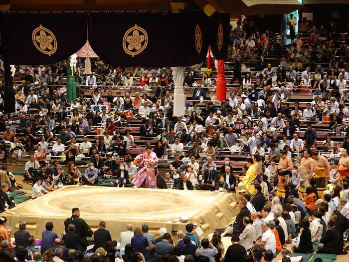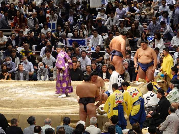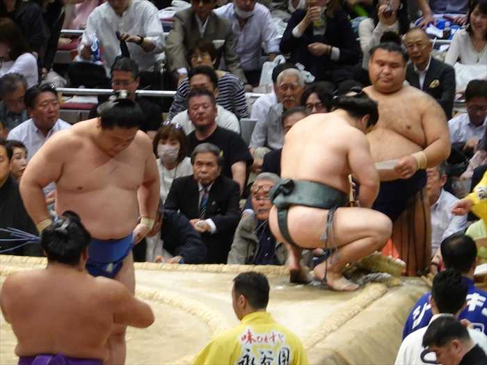 相撲博物館の見学を終え、Sさんと合流し、Sさんに連れられて「相撲案内所」を歩く。1400年の歴史と伝統を誇る日本の国技「大相撲」。年に6回開催される本場所のうち、1月の初場所・5月の夏場所・9月の秋場所が「東京場所」と呼ばれ、力士達の熱い 取組の舞台が東京は隅田川のほとり、両国にある国技館になります。国技館内には20軒の相撲案内所👈️リンクあり、その昔、それぞれが屋号を持って「お茶屋」と呼ばれていました。江戸時代にさかのぼると、大相撲のほかに芝居小屋や歌 舞伎などにもお客様に代わって、入場券やお弁当など飲食の手配を引き受ける代行業として「お茶屋」制度があったのです。現在「お茶屋」は「案内所」と名称を変えてはいますが、お客様に大相撲観戦を楽しんでいただく気持ちに変わりはありません。チケットの手配にお食事とお土産、そして雰囲気をご満足いただけるよう、上質なサービスを心掛けております。大相撲を心ゆくまで堪能できる相撲案内所。皆さま、ぜひご利用ください と。 Sさんが訪ねたのが「三河屋」。 店主は元大関 伊勢ノ濱(七代 中立親方)の孫の妻 と。既に他の2人が到着済みで、アルコール、弁当等は席に届けたとのこと。1階売店の正面上には「大相撲決まり手 八十七手」👈️リンクが描かれていた。 こちらにも。さらに。「ようこそ 親方売店 SuMALLへ」 と。 そして観戦席👈️リンクへ。「1階 ボックス席 西ー3」 「1階 ボックス席 西ー3」。手前が正面・北、右が西、左が東、向かいが向正面・南。両国国技館で皇族の皆様が相撲をご覧になる場所・貴賓席後方から見る。土俵の説明。・直径:土俵の直径は4.55メートル(15尺)です。・一辺の長さ:土俵の土台となる正方形の一辺は6.7メートルです。・高さ:土俵の高さは34cmから60cmです。・俵:土俵の円形は20個の俵で囲まれています。・材料:土俵は「荒木田」と呼ばれる土を使い、俵で円形に囲まれています・由来:土俵の大きさは、江戸時代当初は直径13尺(約3.94m)でしたが、 その後、15尺(約4.55m)に改められました横から。>相撲における「蛇の目(じゃのめ)」とは、土俵の外側に25cm幅で敷かれた砂の部分を指します。これは、力士の足が土俵の外に出たかどうかを判定しやすくするためのもので、踏み越しや踏み切りの痕跡が砂に残ることで審判が判断しやすくなります両国国技館の観客席は2層で1階に約6000席、2階に約4500席あり収容人数は1万500人となっています。1階席は、マス席という4人用の座席が中心で東西南北にそれぞれ15列あります。またマス席の前にはタマリ席と呼ばれる座布団が敷かれた席が6列、マス席後ろにはボックス席と呼ばれるテーブルにイスが設置された半個室があります。2階席はイス席で東西南北にそれぞれ14列あります。そしてボックス席に座り観戦開始。幕下の相撲が行われていた。幕下以下の行司:裸足で土俵に上がっていた。呼び出しは、土俵に上がる際に草履を履いていた。まだまだ空席が多く。我々のテーブルにはビール、焼き鳥、焼売、巻き寿司・・・が。焼売。巻き寿司。鯵の押し寿司。まだ、砂かぶりには観客の姿は極めて少なく。幕下最後の相撲だったか!?そして十両力士の土俵入り。十両格の行司は、土俵上では草履を履くことが許されていないようだ。土俵に上がる際は白足袋を着用すると。そして、十両力士が土俵上に。夢道鵬。右から志摩ノ海、剣翔、友風。そして十両の対戦が始まった。審判員の二所の関親方(元横綱稀勢の里)●欧勝海ー◯草野●御嶽海ー◯琴栄峰御嶽海は令和四年三月場所で大関昇進。今場所は十両筆頭まで下がったが、8勝7敗で勝ち越し、幕内に復帰の予想。この日は敗れたが。この日・十三日目の十両勝敗表。そして5月場所の最終成績十両優勝は草野 13勝2敗 ・・・もどる・・・ ・・・つづく・・・