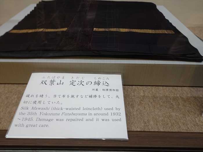 双葉山 定次の締込締込(しめこみ)力士が取組で腰に締めるものを「廻し(まわし)」といい、特に関取が本場所で締める絹製廻しを「締込(しめこみ)」と呼ぶ。長さは約10m。力士規定では「紺、紫色系統」とあるが、実際には様々な色の締込がみられる。廻しの前にはさがりをはさみ込んで垂らし、前を隠している。「偶数(割れる数) =土俵を割る」につながることから、ゲンをかついで奇数本に作られる。幕末まで、締込とさがりは一体だったが、取組中に指がかかって危険なため分離した と。双葉山 定次の締込破れを縫う。当て布を施すなど補修して、大切に使用していた。九州山 義雄の化粧廻し九州山 義雄の化粧廻し 所蔵:相撲博物館総理大臣・陸軍大将の東条英機(1884~1948)による書「必勝」を配している。 入隊中の九州山 原資料:個人蔵1938年(昭和13 )、九州山義雄(最高位:小結、1913 ~ 1990)は日中戦争に応召され、中国を転戦。1940年に帰還した。太平洋戦争が始まってからは、応召、入営する力士がさらに増えた。安藝ノ海ー双葉山 1939年(昭和14)春場所4日目この日双葉山は、安藝ノ海(最高位: 37代横綱、1914 ~ 1979 )の外掛けで敗れ、続いていた連勝が69で止まった。これは、現在も連勝記録の1位である。戦後の大相撲戦後も興行地を転々としていたが、1954年(昭和29)に蔵前国技館が完成。新たな本拠地ができあがり、1958年(昭和33)には本場所が年6場所になるなど、大相撲人気は回復。横綱栃錦・若乃花・柏戸・大鵬をはじめ、個性豊かな力士たちが次々と登場し、観客を沸かせた。ソ連や中国などで公演も行われ、大相撲は日本を代表する文化として広く海外にも紹介されている。1945炎上する旧両国国技館 原資料:墨田区立緑図書館蔵1945年(昭和20) 3月10日の東京大空襲によって、旧両国国技館は炎上し、両国周辺の相撲部屋も消失した。右:敢闘賞 海乃山 勲 敢闘賞 海乃山 勲 1967年(昭和42)9月場所 所蔵:相撲博物館海乃山はこの場所、11勝4敗の好成績を挙げ、2回目の敢闘賞を受賞した。殊勲賞 鳴門海 一行殊勲賞 鳴門海 一行 1956年(昭和31)夏場所 所蔵:相模博物館三賞は、1947年(昭和22)秋場所に制定された。鳴門海この場所、鏡里(横綱)、大内山(大関)、若ノ花(大関・優勝)を破った技能賞 海乃山 勲 1966年(昭和41)一月場所 所蔵:相撲博物館千代の山 雅信横綱推挙状 1951年(昭和26)5月28日 所蔵:相撲博物館第41代横綱千代の山 雅信(1926~1977)は北海道福島町出身。文中の「横綱にに推挙す」から横綱推挙状といわれる。 蔵前国技館 長谷川 清 画 所蔵:相模博物館1949年(昭和24)から工事が始まり、仮設として本場所が行われていた蔵前国技館(東京都台東区)は、1954年(昭和29 ) 9月に完成。同時に相撲博物館も開館した。蔵前国技館鬼瓦 所蔵:相模博物館開館後に取り壊され、現在は東京都下水道局北部下水道事務所が建っている。蔵前国技館閉館セレモニーペンライト。1984年(昭和59年)九月場所千秋楽の表彰式後の・・・・蔵前国技館お別れセレモニーがあり、「蛍の光」にあわせてペンライトが振られた。 蔵前国技館閉館セレモニー蔵前国技館の閉館セレモニーは、昭和59年(1984年)9月場所千秋楽に行われました。この場所を最後に蔵前国技館は閉館し、翌年1月場所から両国国技館で興行が行われるようになりました。閉館セレモニーでは、観客にペンライトが配られ、その光が浅草橋駅まで続いていた様子が印象的だったと鹿島建設株式会社が伝えています と。昭和天皇天覧相撲 1955年(昭和30)五月場所10日目昭和天皇が初めて本場所の会場へ行幸して、大相撲を観戦した。1987年(昭和62)までに40回の天覧を行った。昭和天皇御製「飛(ひ)さし久(く)も みざり志(し) すまひ ひとびとと 手をたたきつつ 見るがたのしさ」 昭和天皇御製 東久邇成子(1925 ~ 1961) 書 所蔵:相撲博物館昭和天皇が、1955年(昭和30夏場所観戦後に詠んだ御製。「ひさしくも 見ざりし すまひ ひとびとと 手をたたきつつ 見るがたのしさ」 東久邇成子は昭和天皇の第一皇女。栃錦ー若乃花(初代)栃錦ー若乃花(初代)44代横綱栃錦 清隆(1925 ~ 1990)と45代横綱若乃花 幹士(初代、1928 ~ 2010 )は、昭和30年代を代表する力士で、「栃若時代」といわれた。「吾唯足知 春日野 清隆(栃錦) 書 所蔵:相撲博物館「満足する気持ちを持ちなさい」との意で、釈迦の教えによる。」 「人間辛抱 ニ子山勝治(若乃花・<初代> ) 書 所蔵:相撲博物館若乃花(初代)ど弟の貴ノ花利彰(最高位:大関、1950 ~2005)が出演した1970年代のテレビコマーシャルで、「人間辛抱だ」のセリフが有名になった。」 色紙。「前進 鏡山」 「夢 大鵬」 前進 鏡山 剛(柏戸) 書 所蔵:相撲博物館柏戸の前に出て走る相撲を表す言葉。夢 大鵬 幸喜 書 所蔵:相撲博物館「忍」と同様に大鵬が好んで記した。「夢」は走り続けた人生の末に訪れるか どうか、という大鵬の意を表す。「人間辛抱 二子山」 「吾唯足知 春日野」 大鵬ー柏戸47代横綱柏戸 剛(1938~1996)と48代大鵬幸喜(1940~2013)は。昭和30年代後半から40年代前半に「柏鵬時代」を築いた。 ・・・もどる・・