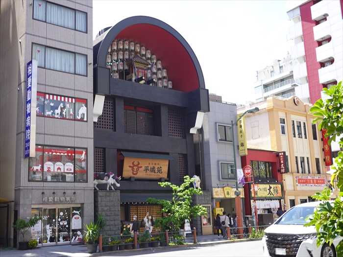 「三峯社」を後にして「新奥山」の裏側まで戻る。前方に「奥山おまいりまち」入口の「奥山門」が見えた。 右手に「雷一茶 お抹茶体験店」。 「奥山門」で来たが引き返す。右手に「伝法院」の北側入口門。五重塔。振り返って、「淡島堂」その先に「花やしきタワー」を見る。 そして「花やしき通り」まで戻る。 「花やしき通り」は、浅草寺境内と六区興行街を結んでいる。最盛期の大正末期から昭和初期には花やしきを軸に、西に凌雲閣、南にはひょうたん池があり、終日遊山客の往来で賑わった。大正7年には沿道に露店が許可され、現在でも衣裳屋や用品店、飲食店が多く、浅草寺境内まで趣のある町並みが続いていたのであった。「花やしき」入口門。「浅草花やしき」の「浅草門」と。 浅草花やしきは、江戸時代末期嘉永6年(1853年)に造園師森田六三郎により、牡丹と菊細工を主とした花園(かえん)として誕生。明治5年頃からは遊戯施設が置かれ、その他にも珍鳥や猛獣の飼育、西洋あやつり大写真や山雀の芸等で大評判となり、かの大正天皇もお忍びで来園されるほど人気を博した。その後、震災や戦禍により閉園を余儀なくされた時代を経て、昭和24年(1949年)に遊園地として再建した。当初はビックリハウス、豆汽車、射的、鬼退治等、規模は小さかったものの、入園無料の憩いの場として広く大勢の方々に利用された。昭和28年(1953年)に日本現存最古のコースター『ローラーコースター』、昭和35年(1960年)に『人工衛星塔(のちのBeeタワー)』を設置、どちらも浅草の名物となり、街の発展に大きく寄与した。昭和60年(1985年)2月には、開園以来続けてきた入園無料の形態を風営法の規制により変更せざるを得なくなり、有料遊園地として再スタートした。2016年10月より、初の試みとなるイルミネーション営業を開催。さくら浪漫をテーマに昼間とは異なる光の空間を創り出すことでより幅広いお客様にお楽しみ頂いております。現在は17機種のアトラクションと縁日、飲食店舗が所狭しと立ち並ぶ浅草の遊園地として親しまれている。また、2016年9月に『Beeタワー』が引退し、その跡地に新たなシンボルとなるホール『浅草花劇場』を2019年4月にオープン。今後は、遊園地や新ホール内で季節ごとのショーやイベントを開催することでさまざまな娯楽を楽しめるような「遊びの場」を提供している。入園料(のりもの料金別途)・大人(中学生~64歳まで) 1,200円 ・小人(5歳~小学生) 600円・シニア(65歳以上) 600円・幼児( 0歳~ 4歳) 入園無料・障がいをお持ちの方 入園無料 *手帳をご提示くたさい のりもの券・フリーバスは園内でこ講入くたさい「なまこ壁」が美しかった。「なまこ壁」とは、土蔵などの外壁に使われる伝統的な壁塗り技法で、黒い平瓦を貼り、その継ぎ目(目地)を漆喰でかまぼこ型に盛り上げて塗るもの。盛り上がった漆喰の形が海鼠(なまこ)に似ていることからこの名がつけられた。 右手に「茶々工房」。 美味しかった!!右手に「浅草花劇場」👈️リンク。 「花やしき 笑運閣門」 「花やしき通り」を「国際通り」に向かって進む。人力車の姿が。 右手に「浅草ひさご通り」。 「花やしき通り」を振り返る。 「ホッピー通り」に入る。進むと左手にあった「西参道」を見る。 西参道商店街。ここにも「シャッター絵」が。 「京鹿子 娘道成寺」。 右に折れ「奥山おまいりまち」を進む。左手にあったのが「木馬亭(もくばてい)」。木馬亭は、東京都台東区浅草2丁目7番5号に存在する浪曲の寄席。毎月1日から7日まで浪曲の定席公演が行われる。関東では無くなって久しかった浪曲の常打ち小屋として、1970年(昭和45年)から約50年、唯一支え続ける存在である。特に黄金期を知る世代からの交代が進み、若手育成の点で大きな役割を果たし続けている。打ち出し太鼓の前後、場内に古い音源(2代目虎造等)を流し、期待感を盛り上げる。開場当初から1日1枚、講談を番組に入れ続け、浪曲の会も度々開催していた講談定席の上野・本牧亭が2011年(平成23年)に無くなった現在、若手中心に貴重な出番を提供する。経営は浅草六区の黄金期を支えた根岸興行部(当初の席亭は京子の亡夫・2代目根岸浜吉。吉之助は大旦那)。席数は131席。この日は「お笑い 浅草21世紀」が行われていた。浅草木馬亭ではお笑い浅草21世紀の演芸バラエティーショーを開催中。コントや漫談、歌や舞踊などの演芸と、爆笑喜劇を二本立てで披露。お子様からご年配の方まで幅広い年齢層が楽しめる内容となっている と。 この日のポスター。「早川美術館」のシャッター絵「勧進帳」。 「奥山おまいりまち」の「木馬亭大衆劇場」👈️リンク。 「前田食堂」のシャッター絵。そして「雷一茶」へ。一番茶を使用したお濃茶スイーツやドリンクを提供。手土産や自分へのご褒美、季節の贈り物などオンラインショップも可能 と。また「お抹茶体験店」では、楽しくお抹茶を味わえる「気軽にお抹茶体験」も開催中。香料・着色料不使用の抹茶本来の旨味