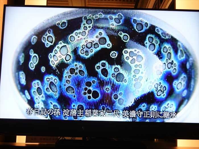 そして最後にこの日の最大の目的の国宝・「曜変天目(稲葉天目)建窯」展示室へ。 国宝展示室内は写真撮影禁止のため、以下の写真はネット、ロビーのテレビ映像、そして私が集めていた写真から。曜変天目は建窯の黒釉茶碗で斑紋の周囲に青色を主とする光彩があらわれたものをいう。本来、「曜変」は「窯変」を意味し、しだいに輝きを表す「曜」の字が当てられるようになった。完全な形で現存するものは、国内に伝存する3点のみ。本作は、光彩が見込み全体に鮮やかに現れた一碗。江戸幕府第3代将軍徳川家光から春日局に下賜されたといわれ、後に淀藩主稲葉家に伝わったため「稲葉天目」ともいわれる。1934年、岩﨑小彌太の所有となった と。漆黒のなかに、星を思わせる斑紋が瑠璃色の光彩をまといながら浮かぶ、独特の文様。 その美しさはまるで“宇宙”と例えられ、これまで徳川家康をはじめ、多くの歴史人物や、陶芸家を魅了してきた最上級の茶碗です。 完存するものは世界に3碗とされていて、いずれも国宝に認定されています。この《曜変天目》、世界で現存が確認されているものはわずか3点しかない。 いずれも日本に伝わっており、大徳寺龍光院(京都)、藤田美術館(大阪)、静嘉堂文庫美術館(東京)が所蔵している。 これら3点の《曜変天目》はすべて国宝に指定され、唐物の天目茶碗の最高峰と呼ばれているが、その歴史や製法、伝来は多くの謎に包まれている。曜変天目は、天目茶碗の中でも最高級とされ、世界で3点しか現存しない希少な茶碗です。その希少性から、価値は非常に高く、国宝に指定されています。現在、その値段は不明ですが、非常に高い価値があることは確かです。曜変天目の価値を詳しく説明すると以下のようになります。世界で3点しか現存しないと言われるほど、非常に少ないです。その3点全てが日本にあり、すべて国宝に指定されています。曜変天目の価値を詳しく説明すると以下のようになります。希少性:世界で3点しか現存しないと言われるほど、非常に少ないです。その3点全てが日本にあり、すべて国宝に指定されています。製法の難しさ:当時の窯は酸素量や温度のコントロールが難しく、偶然の産物として曜変天目が生まれるため、再現は不可能に近いとされています。美しさ:曜変天目の表面に現れる光沢や模様は、まるで宇宙のような美しさを感じさせ、多くの人々に愛されてきました.このように、曜変天目はその希少性、製法の難しさ、そしてその美しさから、非常に高い価値を持っています。現在、その値段は不明ですが、非常に高い価値があることは確かです。「曜変」は本来「窯変(ようへん)」で、輝きや光を意味する「曜」の字を当てたもの。黒釉の掛かる碗の内面に大小の斑文が浮かび、青く輝く光彩が現れたものをいう。曜変天目を生んだ福建省建窯の碗は「建盞(けんさん)」と呼ばれ、上質な製品は北宋の風流天子・徽宗皇帝(きそうこうてい)も推奨し用いている。完全な形の曜変天目は世界に3 碗、いずれも日本に現存するが、近年中国・浙江省杭州の南宋宮殿跡付近では破片が発見されている。本作は江戸時代以降、淀藩主稲葉家に伝わったため、「稲葉天目(いなばてんもく)」と呼ばれている。しばらくは黒釉の掛かる碗の内面に大小の斑文が浮かび、青く輝く光彩をお楽しみください。そして全ての展示品鑑賞を終えて、ショップに立ち寄る。「曜変天目」の青く輝く光彩をアレンジした黒地のアロハシャツ?こちらは、曜変天目ぬいぐるみ。5800円とやや高価。「ほぼ実寸の曜変天目ぬいぐるみ」 ・・・もどる・・・ ・・・完・・・曜変天目紹介の動画👈️リンク長江惣吉先生👈️リンク