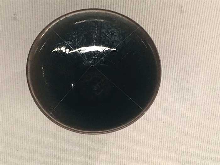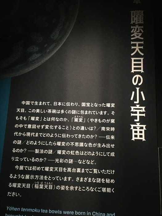 そして展示物の観賞用の部屋・第一展示室に入る。第1章 天目のいろいろ曜変天目はいわゆる「天目茶碗」の一種と捉えられています。天目茶碗は抹茶を飲むための茶碗のなかで最も格式の高いもの。漏斗のように裾がすぼまる独特の器形と、鉄分の発色による黒い釉薬が特徴です。日本の抹茶の源流となる喫茶法(点茶法)が中国で生まれた少し後、北宋時代の初め(10 ~ 11世紀)頃に天目茶碗が作り出され、次第に広まっていきました。鎌倉時代の日本にも、中国から禅宗における喫茶の風習とともに天目茶碗がもたらされました。茶の湯の世界ではこうした中国産の天目茶碗を「唐物天目」と呼んで、とくに珍重しています。室町時代には将軍家で用いるに相応しい品々を選ふために格付けが行われ、「曜変」を筆頭に「油滴」、「建盞(けんさん)」、「鼈盞(べっさん)」などの分類整理が行われました。本章では館蔵の唐物天目の優品をご覧いただきながら、知っているようで知らない「天目」の世界をご案内します。「建盞(けんさん)一 建盞、油滴にも劣るべからず。 地薬黒く、白金のごとく金走りて 同じく油滴のごとく星のあるもあり。 三千疋。」 訳は【建盞(けんさん) 建盞は、油滴天目(ゆてきてんもく)にも劣ってはならない。釉薬(うわぐすり)は黒く、白銀のように金色の文様が走っており、油滴天目と同様に、星のような斑点があるものもある。値段は三千疋(ぴき)。】と。1.禾目天目(のぎめてんもく) 建窯(けんよう) 南宋時代(12 ~ 13世紀) 茶盞の色は青黒を貴ぶ「建窯福建省北部の南平市建陽区水吉鎮(すいきつちん)にある晩唐から元代の窯。宋代を通じて「建盞(けんさん)」と称する、鉄分の多い素地に黒釉を掛けた喫茶用の碗を焼造した。建盞は北宋の蔡襄(さいじょう)『茶録』(1064年)や徽宗(きそう)皇帝『大観茶論』などの茶書において喫茶に最も適した茶碗として評価され、優品は宋代の宮廷において使用されたと考えられている。」 「禾目」は黒釉上に現れた細い縦筋状の文様を稲の穂先の毛に見立てた日本での名称で、中国ではこれを兎の毛になぞらえ「兎毫(とごう)と呼ぶ。一般に「建盞」と呼ばれるのはこの種の茶碗で、日本での伝世品は多い。一方、出土例は少ないが、12~13世紀前半の博多遺跡で出土しており、唐物を満載して日本へ向かった貿易船と考えられる韓国新安沖沈船(1323年)引き揚げ品などの中にも確認できる。近づいて。2.柿天目 建窯 南宋時代(12 ~ 13世紀) 鉄分・・・・・ 天目茶碗の黒い釉薬は、釉薬に含まれる鉄分による発色である。鉄分2 ~ 3 %では青磁に、 10 %程度で黒くなるが、さらに多く12%ほどでは本作のような不透明赤褐色の「柿釉」と なる。建盞(建窯産の碗)にはさほど多くないが、北方の河北省定窯で白磁や黒釉とともに 柿釉の盞(浅く開いた碗)が生産されているのをはじめ、宋代に柿釉の作例は少なくない。 建窯でも意図的に焼かれたものかもしれない。「油滴 油滴、第二の重寶 これも地薬いかにも黒くして、薄紫色のしらけたる星、 内外にひたとあり。曜変よりは世に数あまたあるべし 五千疋」 3.油滴天目(ゆてきてんもく) 重要文化財 付属 花卉文堆朱天目台(かきもんついしゅてんもくだい) 「新」銘 建窯 南宋時代(12 ~ 13世紀) 明時代(15世紀) 「唐物天目」界のNO.2「室町時代、足利将軍家における座敷飾りのマニュアルとして編第された『君台観左右帳記』において、曜変天目に次ぐ高い評価を与えられたのが「油滴」である。本作は通常の天目形と異なり、朝顔形に大きく開いた形で、器の内外に銀色や虹色に輝く大粒の斑文が現れている。日本ではこの斑文を水面に浮かぶ油のしずくに見立てて「油滝」と呼んだ。大阪の藤田家旧蔵で、箱には「曜変鉢」を記される。」 4.灰被天目(はいかつぎてんもく)茶洋窯 元~明時代(14~15世紀)灰のベールを身にまとい「茶洋窯1980年、福建省南平市太平鎮に窯址が発見され、1995~96年に発掘調査が行われた。宋代は青磁や白磁など多様な製品に加え、建窯風の黒釉碗を焼造、元代・14世紀頃から独自の特徴をもつ黒釉碗を生産し海外へ輸出した。黒釉碗の多くは灰白色の素地で、釉面に「兎毫文」の現れたものもある。日本伝世の灰被天目は、黒釉の窯変や釉薬のニ度掛けの様子、高台際の削りの特徴から、その多くが茶用窯製品とみられる。」 「灰被」は黒い鉄釉の変化を「灰をかぶる(かづく)」と表現したもの。黒色主体の釉調の下に淡黄色あるいは褐色を呈する薄い釉が掛かり、ニ重掛けのように見えるのが特徴。中国産の天目茶腕の中でも室町時代には低い評価であったが、挑山時代になるとこの粗相な作行きが高く評価されることとなった。仙台藩主伊達家伝来の天目。5.灰被天目 銘 埋火茶用窯 元~明時代(14~15世紀)元時代以降の中国では粉末の茶に湯を注ぎ撹拌して飲む「点茶法」(日本の抹茶の源流)はすたれ、天目の需要は減少していく。しかし室町時代の日本で茶の湯が普及するとともに中国製茶道具の需要が高まり、宋時代の天