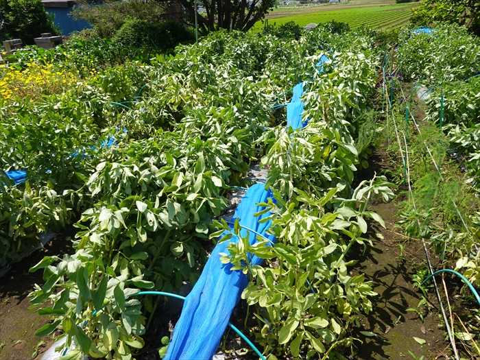 この日は5月20日(火)のAM。まずはミツバチを飼っている菜園の姿です。「そら豆」畑です。 収穫時期を迎えています。昨年は不良でしたが、今年は豊作です。そら豆とは、マメ科ソラマメ属の一年草または越年草で、さやの中に豆が入っているものを食用とする野菜。主に4月~6月の初夏に旬を迎えます. 豆の形が蚕の繭に似ていることや、さやが空に向かって伸びることから「蚕豆」や「空豆」とも呼ばれます. 塩茹でや煮豆、炒め物など、様々な料理に利用できます。そのまま皮ごと焼いて「焼きそら豆」で。 塩茹でにて。スナップエンドウは既に収穫はほぼ終わりました。収穫のタイミングを逃すと、超肥満な「スナップエンドウ」に。この状態でも、内部の豆だけを取り出して、豆ごはんにしても美味しいです。シンプルに茹でてマヨネーズで、が一番好きです。今年もよく食べました。ゴーヤ4本そして余ったトマト、キュウリ、ナスをこの畑にも植え付けました。この柵はエダマメです。そして「人参・ニンジン」も順調に育っています。もう1回、オロヌキが必要でしょう。 オロヌイたものは、これもマヨネーズをつけてカジッています。さつまいも「安納芋」の苗をネットで購入し、植え付けました。黒の寒冷紗を地面に敷きました。雑草の防止と、昨年失敗した、ツルボケ防止用です。サツマイモの苗を植え付けて1か月から2か月ほど経つと、つるが伸びて畝からはみ出してしまうことがあります。サツマイモのつるは土に触れていると「不定根」と呼ばれる根を生やし、不定根をそのまま放置していると小さな芋がつきます。不定根を育てると収穫量が増えるように感じられますが、不定根の芋は栄養がいきわたらないためあまり大きくなりません。数が増えると栄養が分散するため、株元の芋にも栄養がまわらなくなります。また、不定根ができるとつるがさらに長く伸びようとするため、葉やつるだけがしげる「つるボケ」の状態になります。つるボケを起こすと栄養はさらに分散してしまい、芋を大きく育てることができません。このシートを敷くことによりつるからでる「不定根」を最小限にしたいからです。落ちているのは、花桃の開花後の実です。苗も発根し根付いて来たようです。そしてスイカの栽培場所です。ツルも伸びだし、雄花、雌花が咲き始めまし。ミツバチがいるため人工授粉の必要はありませんスイカの奥に「カボチャ」も育てています。 「黒スイカ」を種から育てています。盆前には収穫できるでしょう。昨年からこの畑で育てた麦を引き抜き苗のツルが成長する前に敷きつめました。アスパラガスも種まきし定植しました。苗に近づいて。こちらはズッキーニ。ズッキーニも近々収穫できそうです。後日の収穫時の写真です。そしてトウモロコシも順調です。ダイコン・大根です。かなり太くなって来ました。白カブです。ホウレンソウは病気にかかってしまったようです。ジャンボニンニクです。そして向日葵の花もミツバチ用に育てています。こちらは紫の花の木製サルビア。こちらは白の花の木製サルビア。そして養蜂場です。越冬した群は勢力を強めていますので、三段にしています。貯密も順調です。こちらは人口分蜂した群です。嬢王蜂が誕生したので、新居を準備し引っ越しさせました。 ・・・つづく・・・